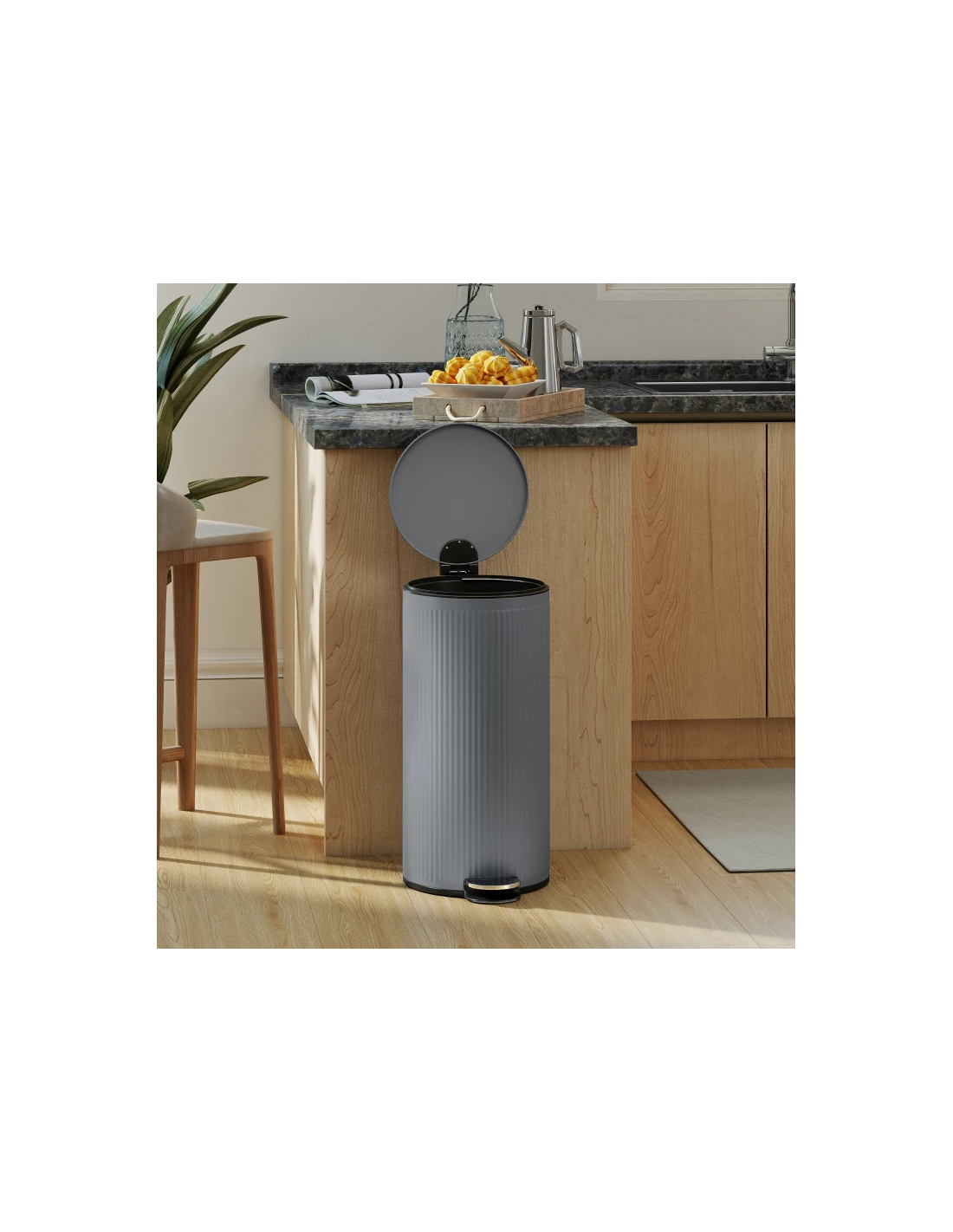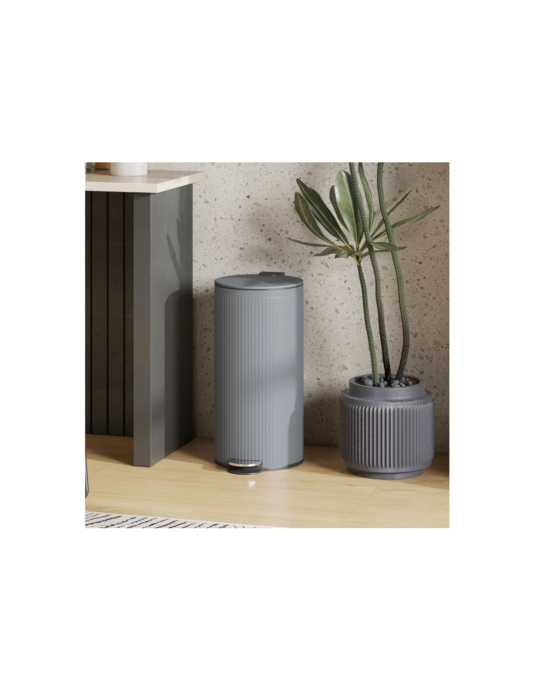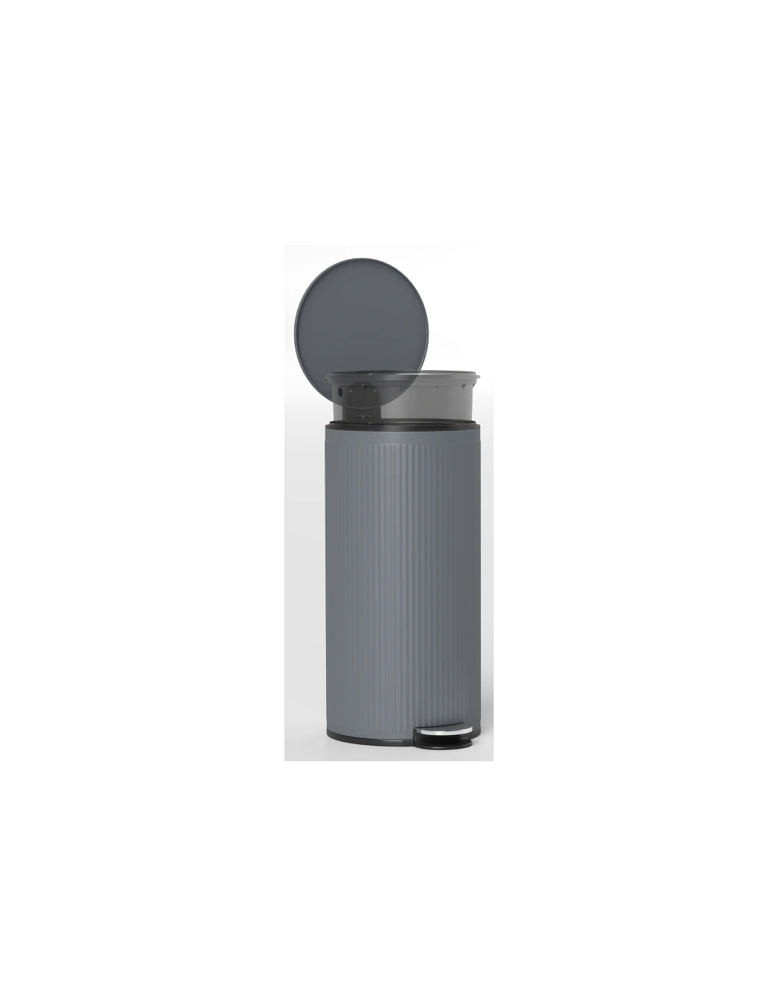 Affaldsspand udført i et stilrent design af grå metal og kunststof med fodpedal og soft-close. Affaldsspanden rummer 30 liter og måler 60,5 cm i højden og 30 x 36 cm i bredde og dybde.