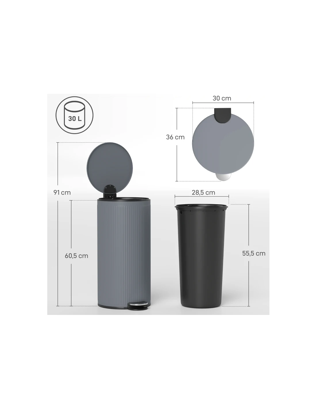 Affaldsspand i metal og kunststof 30 liter H60,5 x B30 x D36 cm - Grå