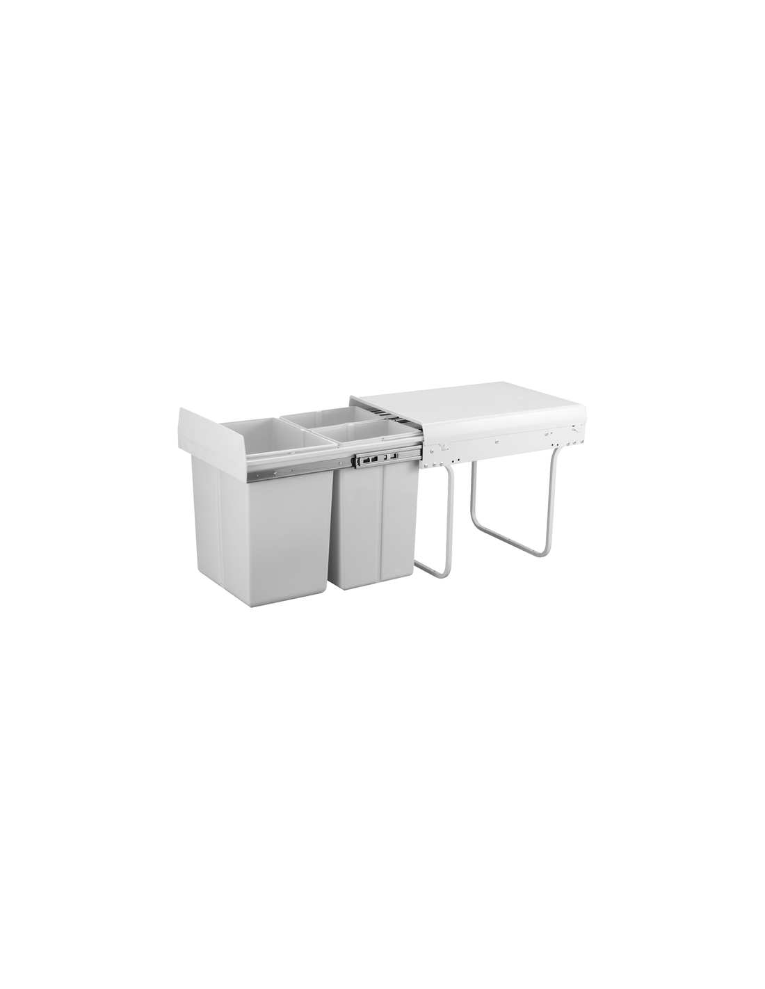 Affaldsspande sortering med udtræk, udført i et design af grålakeret metal og grå kunststof. Der er i alt 2 x 10 liter spande og 1 x 20 liter spand. Sættet kan fastgøres til bunden af skabet, og er med udtræk for let håndtering.