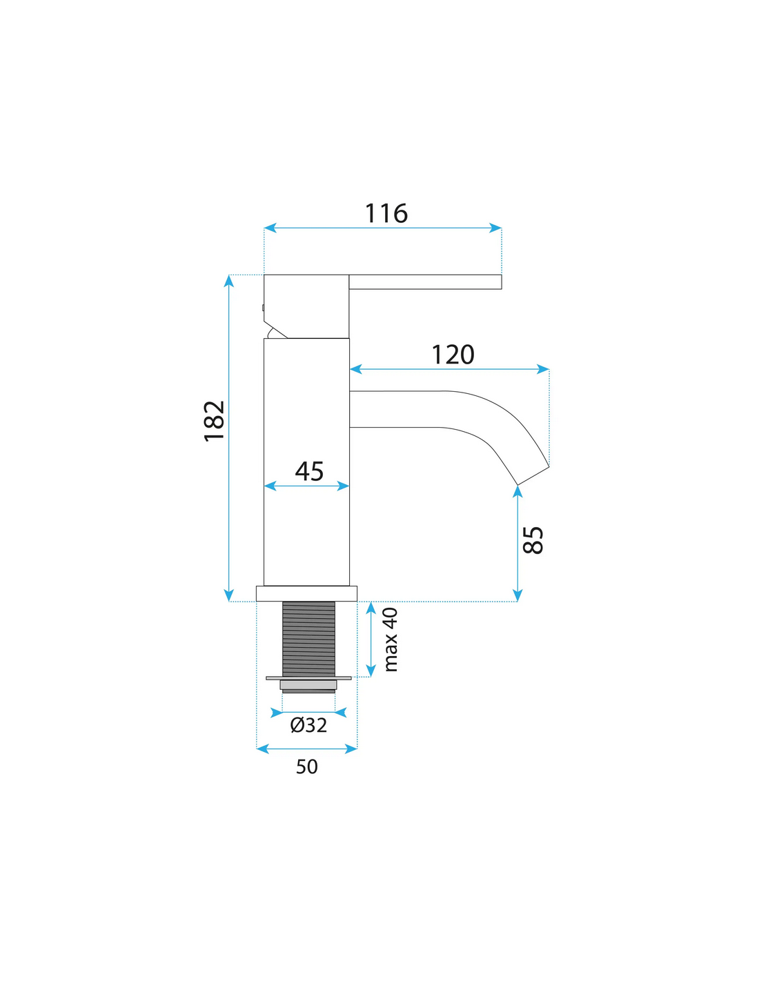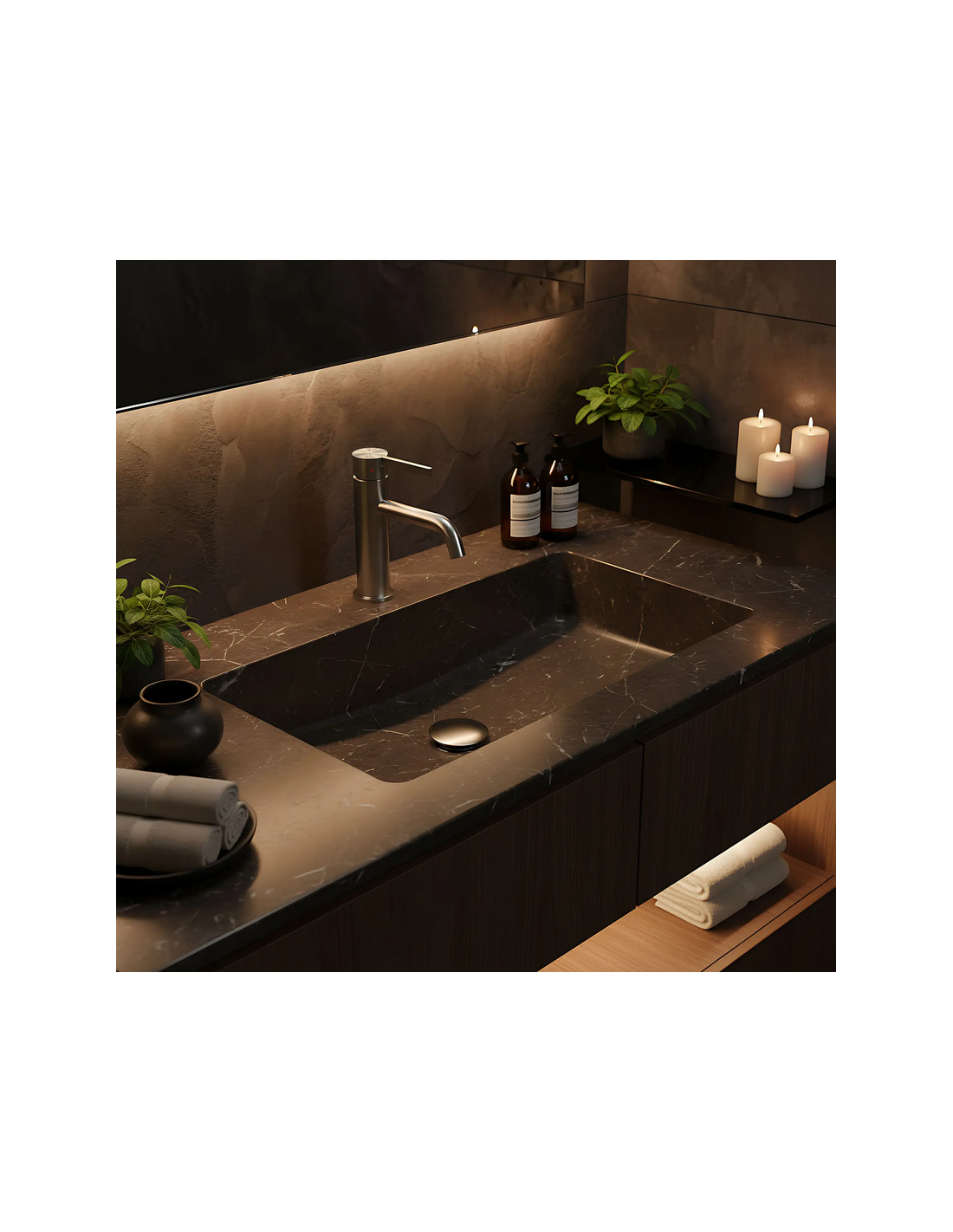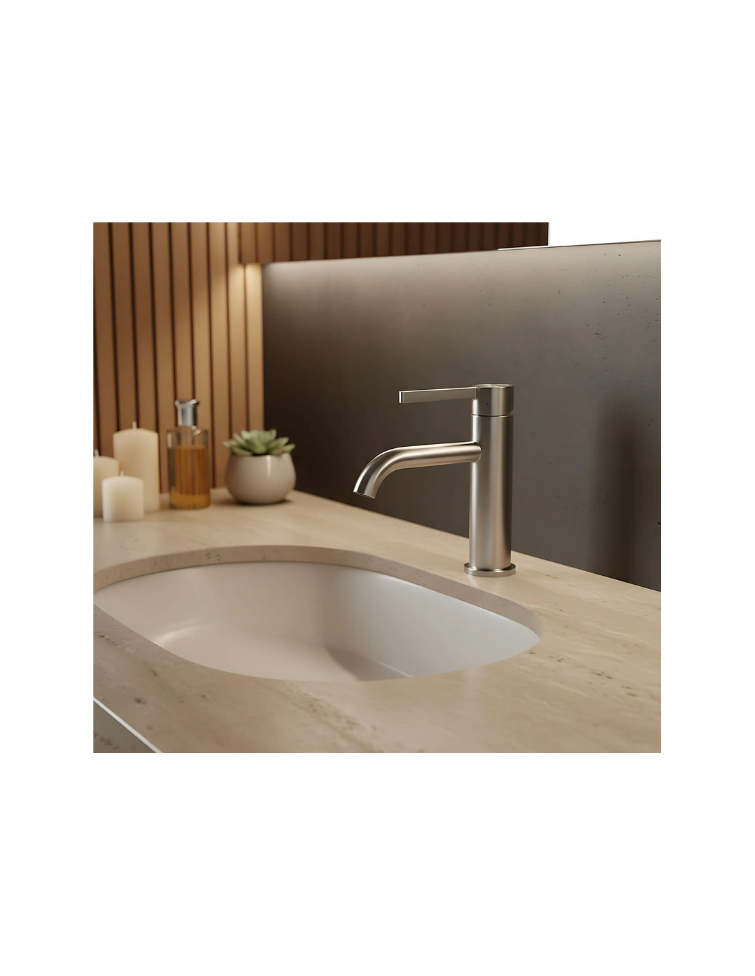 FOSTER Armatur til håndvaske, udført i et moderne design af børstet nikkelfarvet lakeret messing. Armaturet måler 18,2 cm i højden og er med fleksible slanger (3/8“). Armaturet har drejbart termostat.