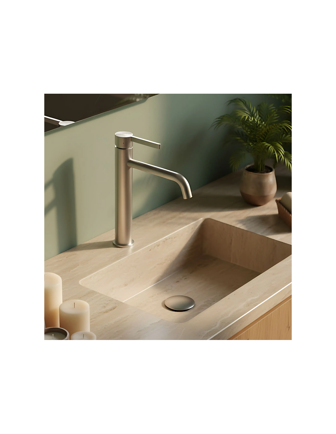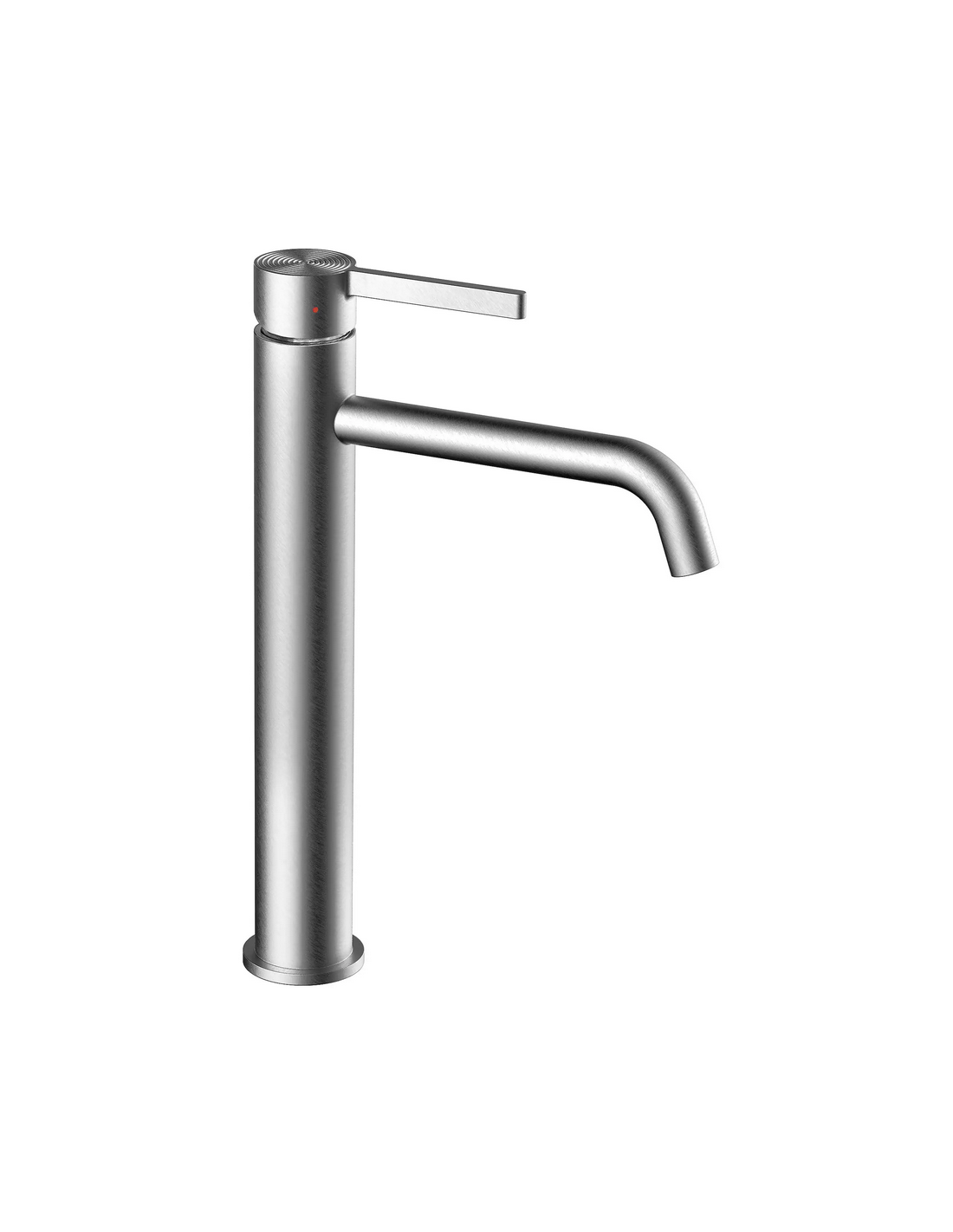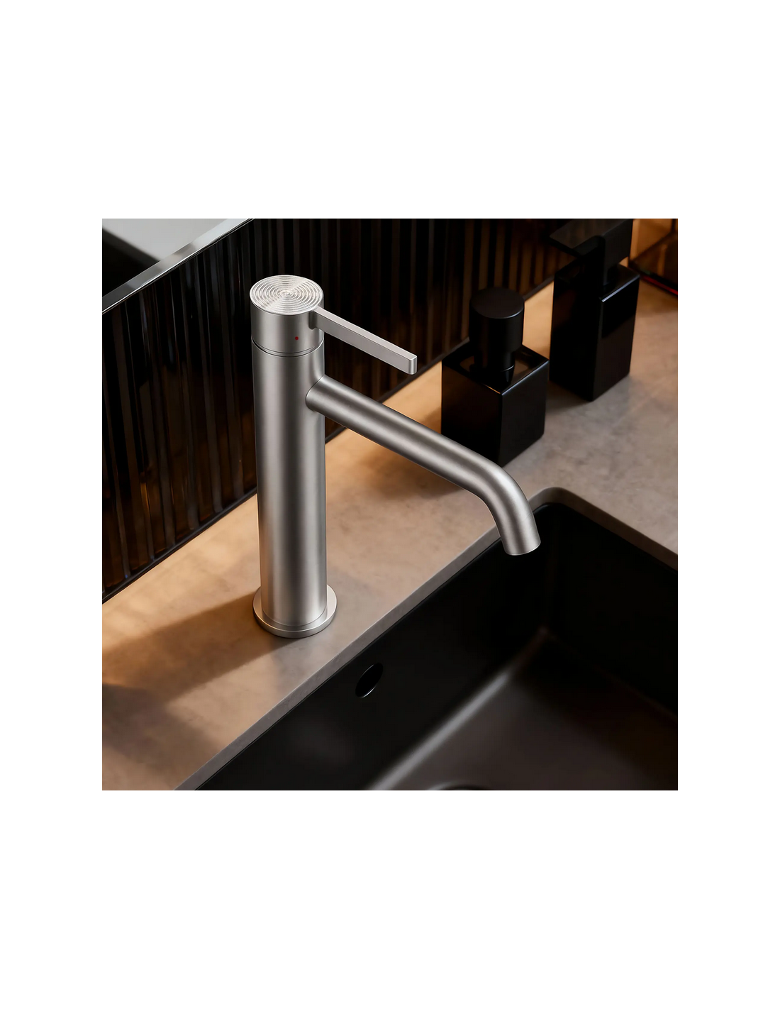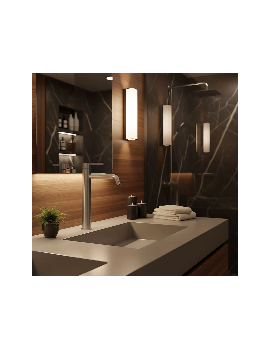 FOSTER Armatur til håndvaske, udført i et moderne design af børstet nikkelfarvet lakeret messing. Armaturet måler 28,7 cm i højden og er med fleksible slanger (3/8“). Armaturet har drejbart termostat.