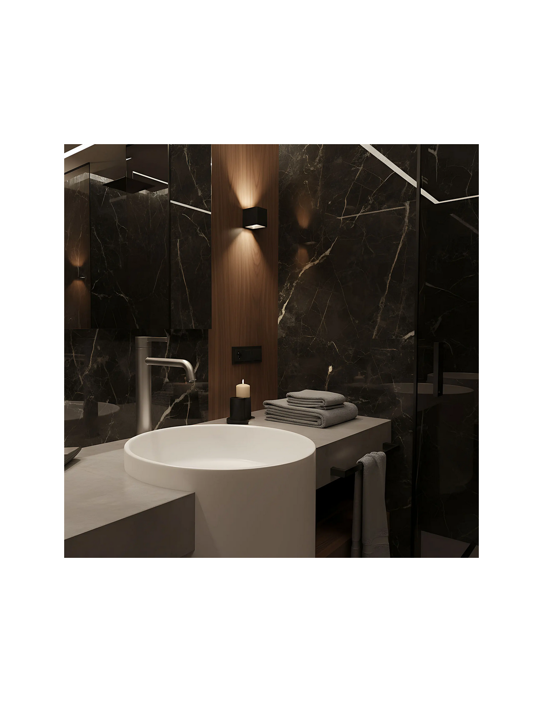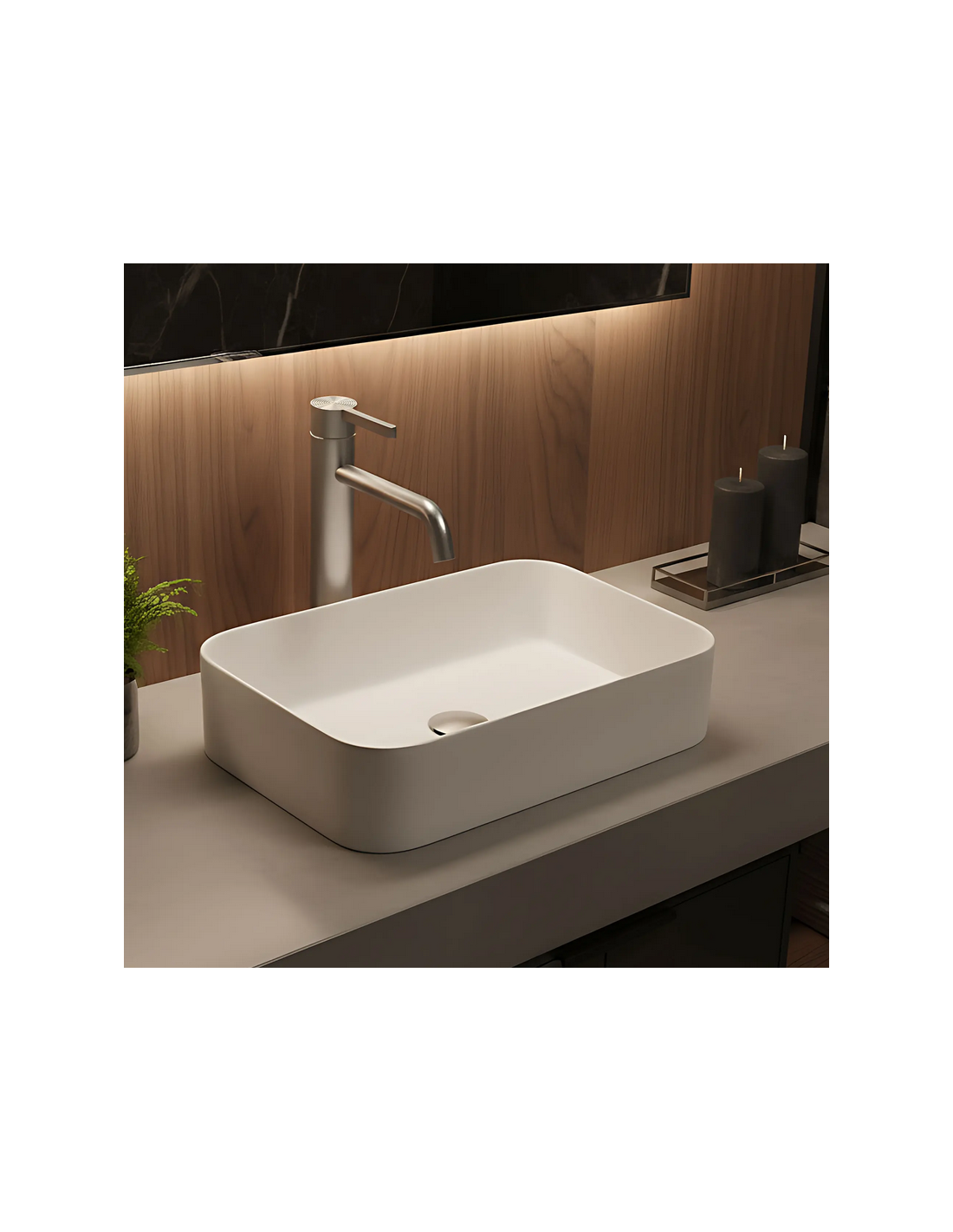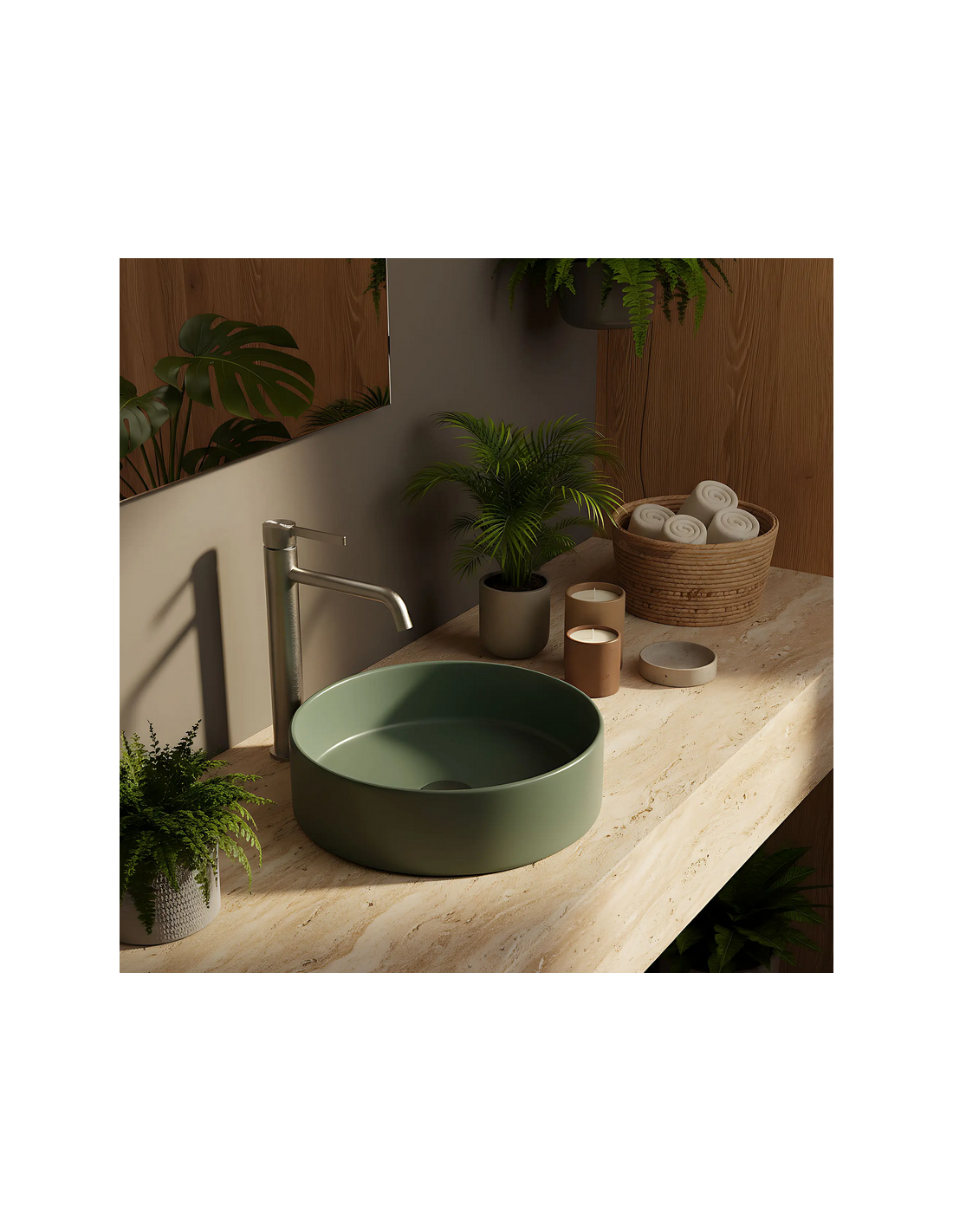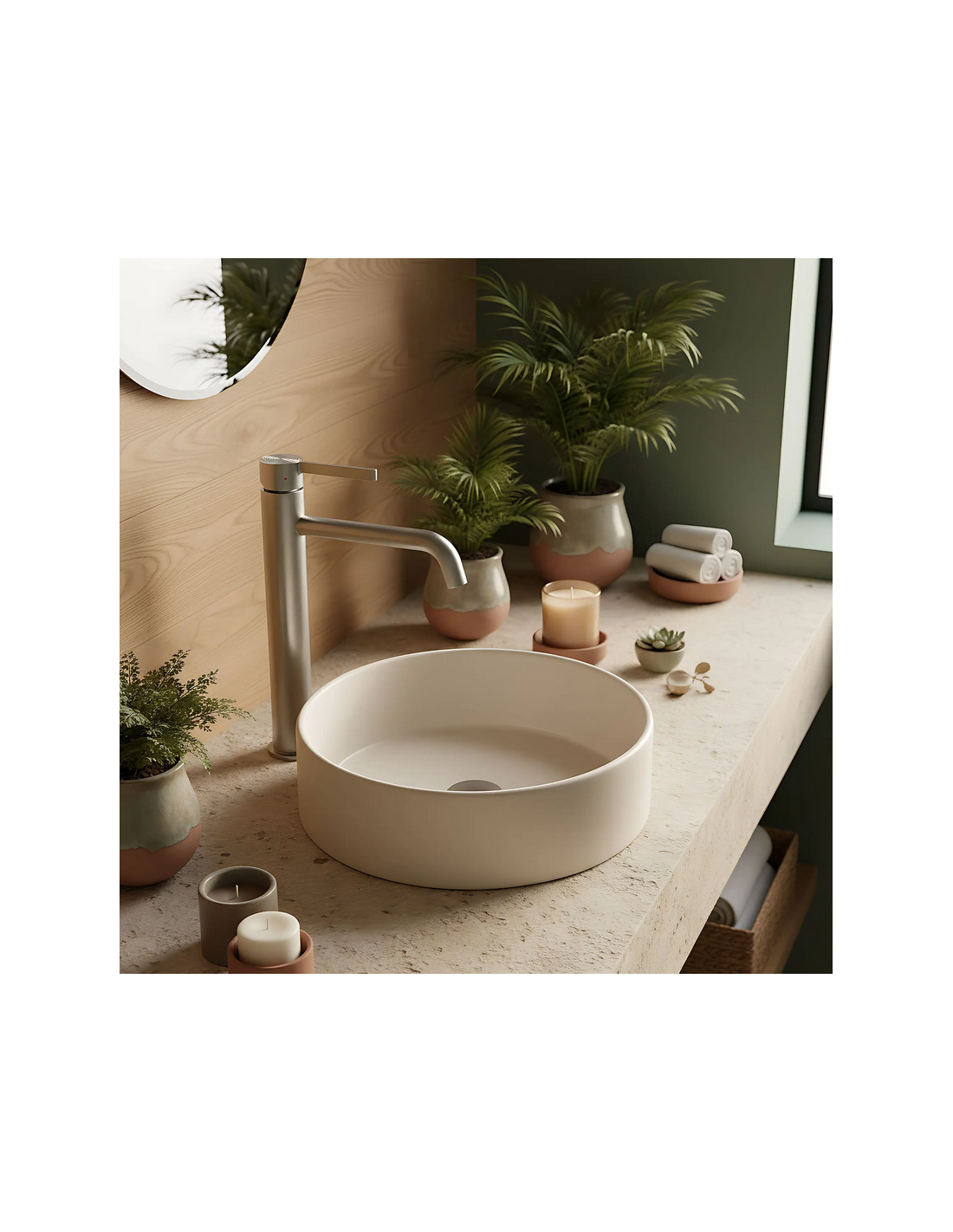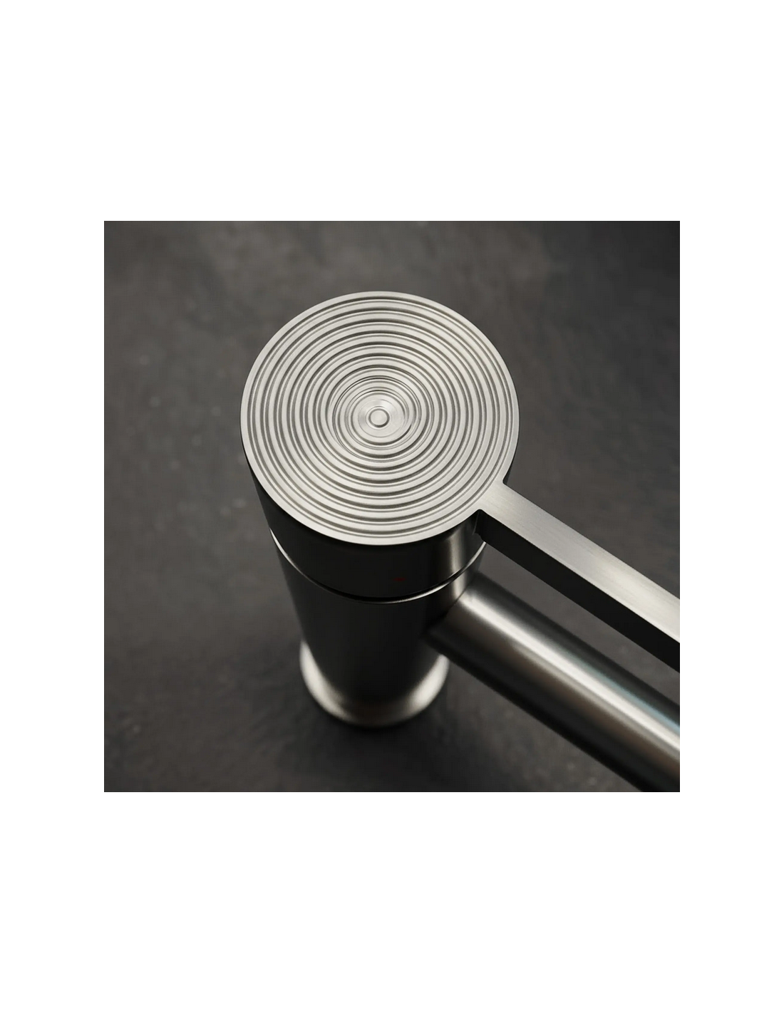 FOSTER Armatur til håndvaske, udført i et moderne design af børstet nikkelfarvet lakeret messing. Armaturet måler 28,7 cm i højden og er med fleksible slanger (3/8“). Armaturet har drejbart termostat.