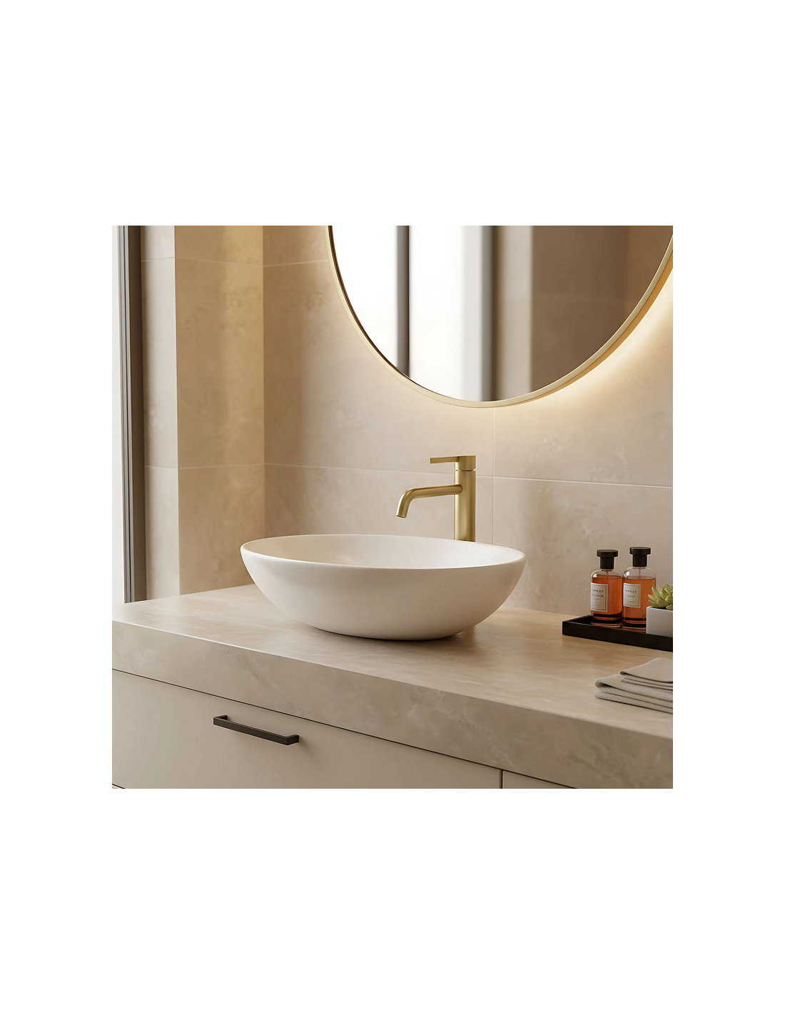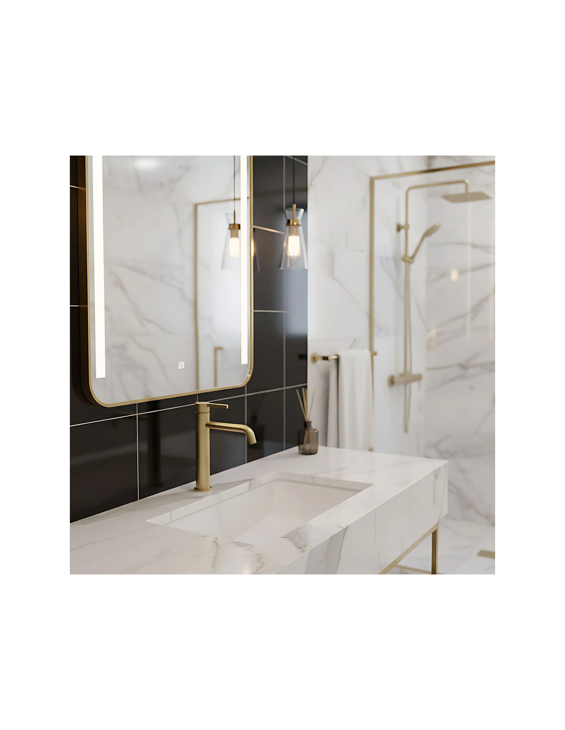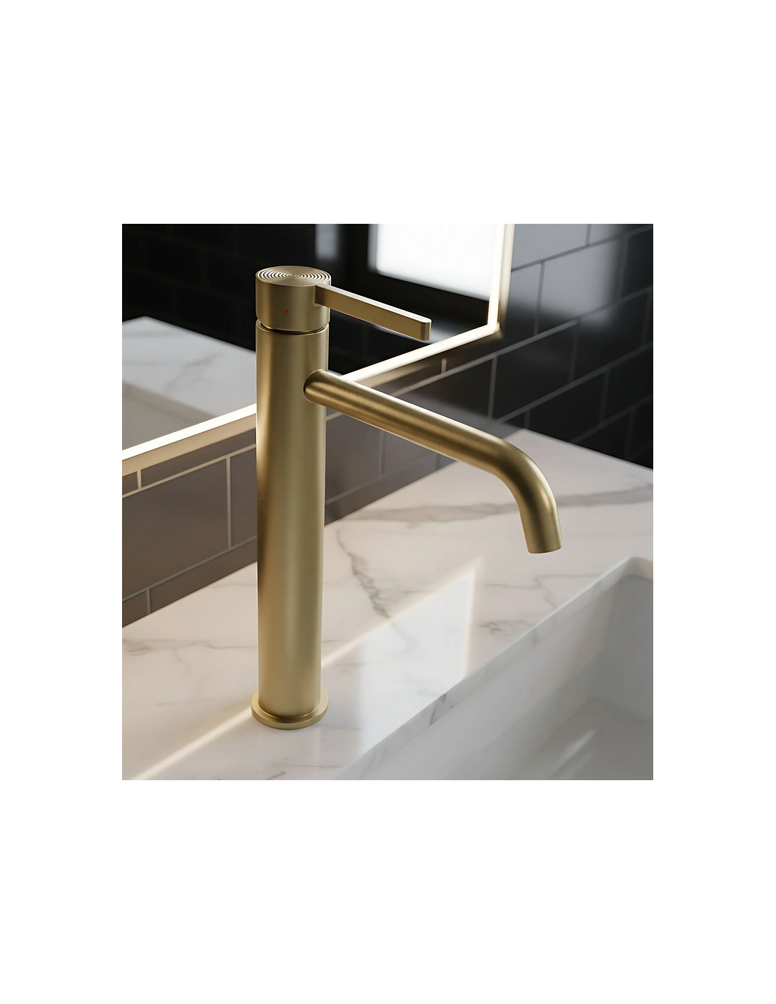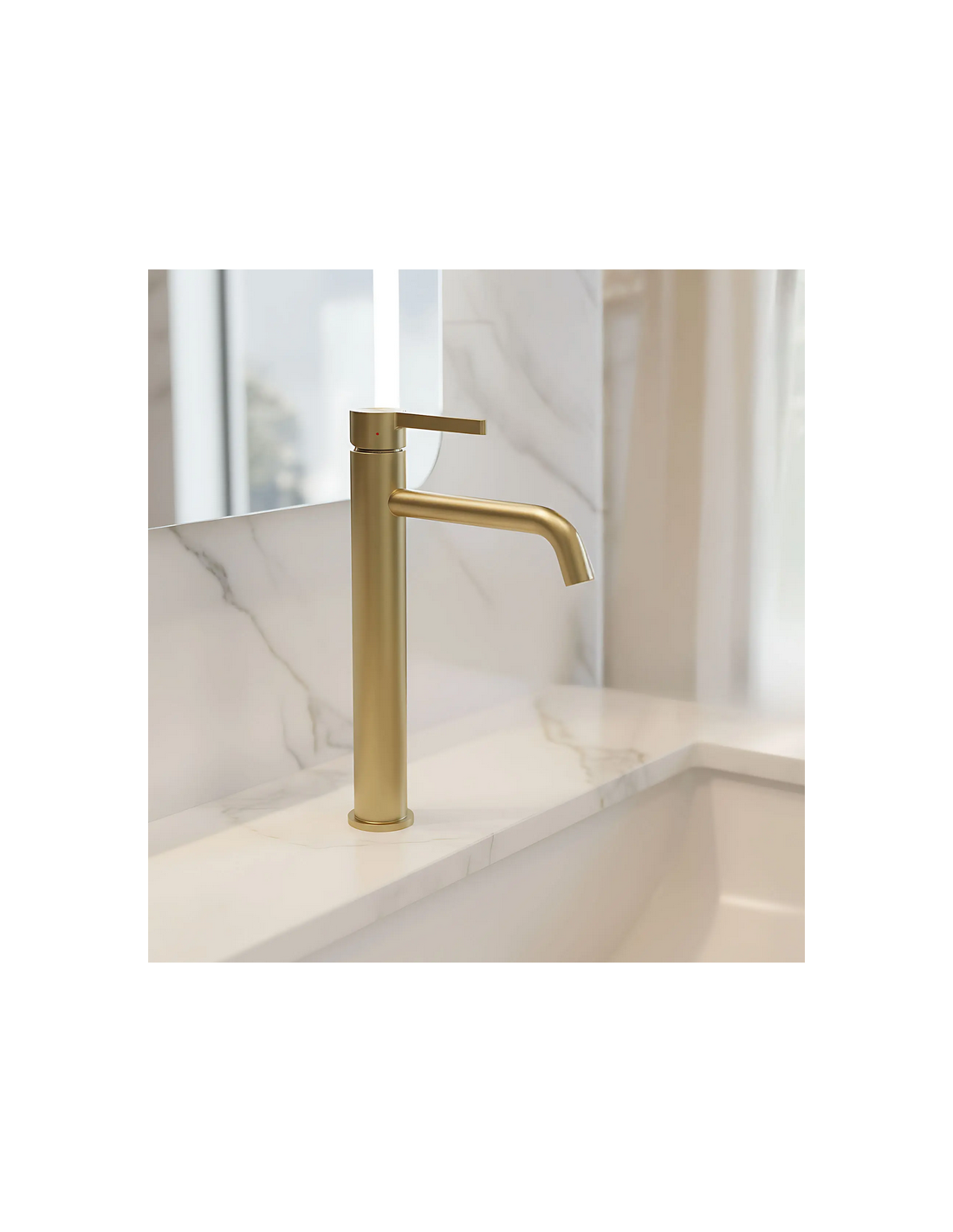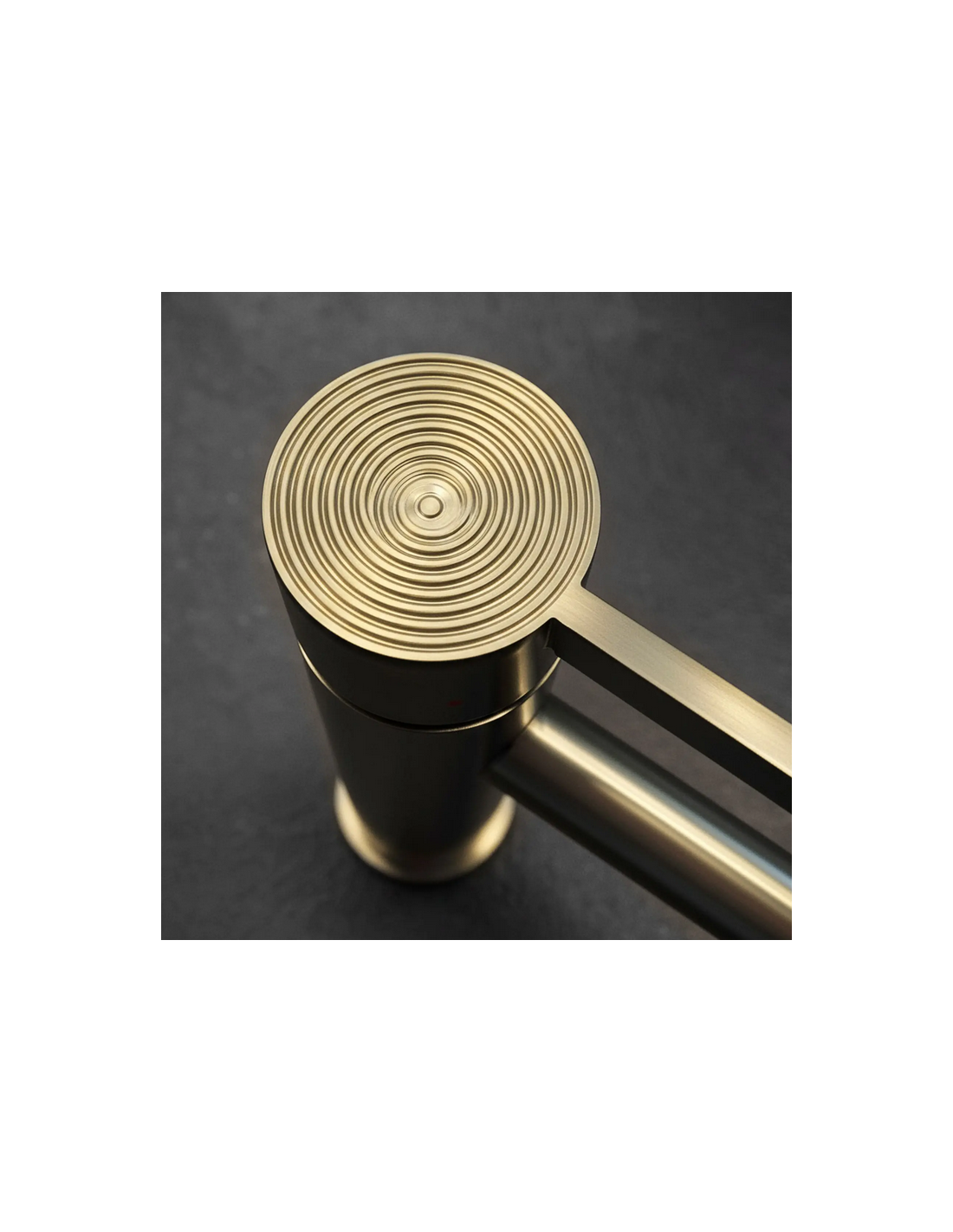 FOSTER Armatur til håndvaske, udført i et moderne design af børstet guldfarvet lakeret messing. Armaturet måler 28,7 cm i højden og er med fleksible slanger (3/8“). Armaturet har drejbart termostat.