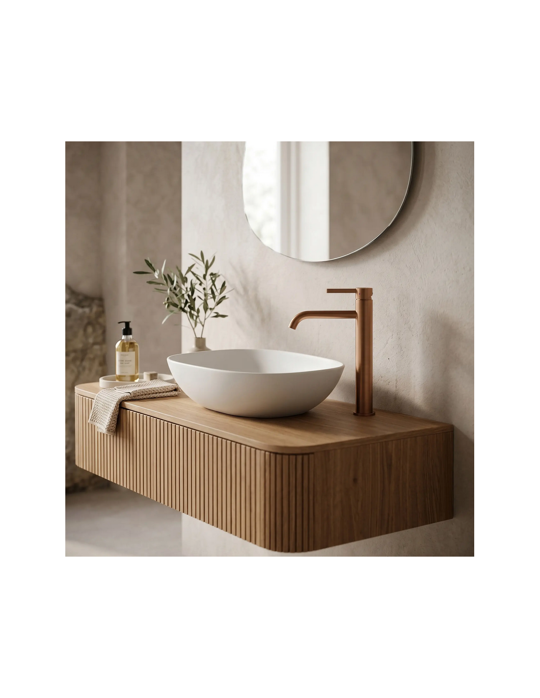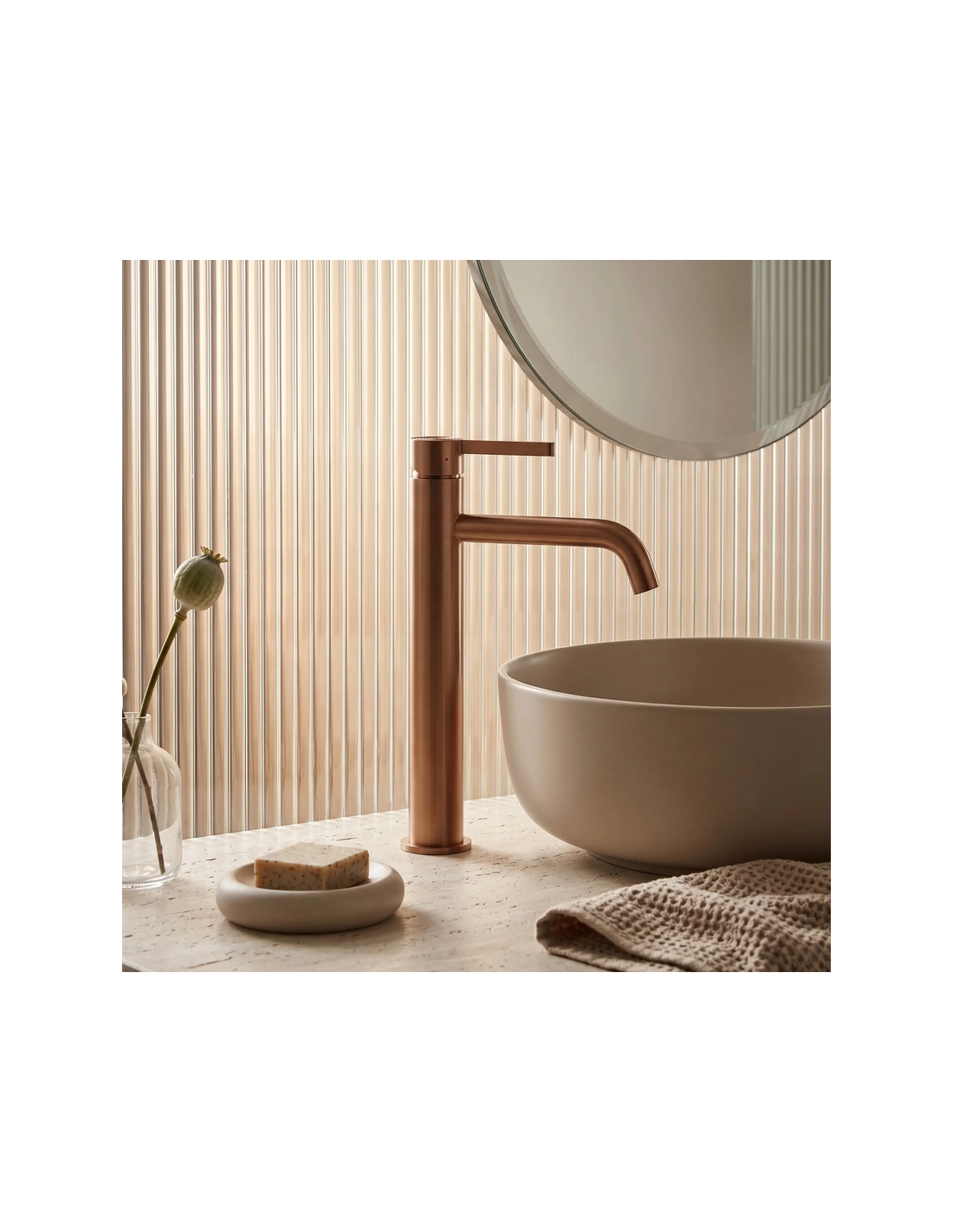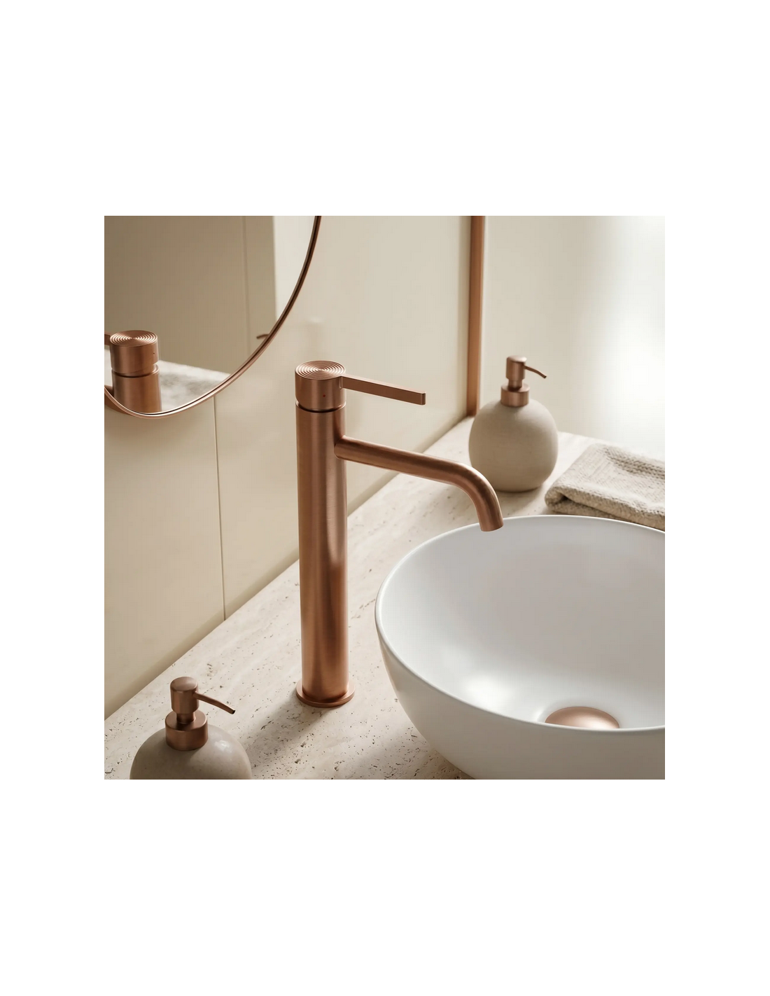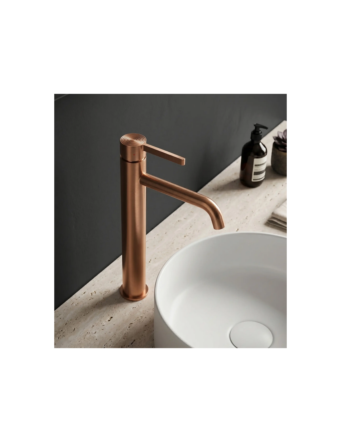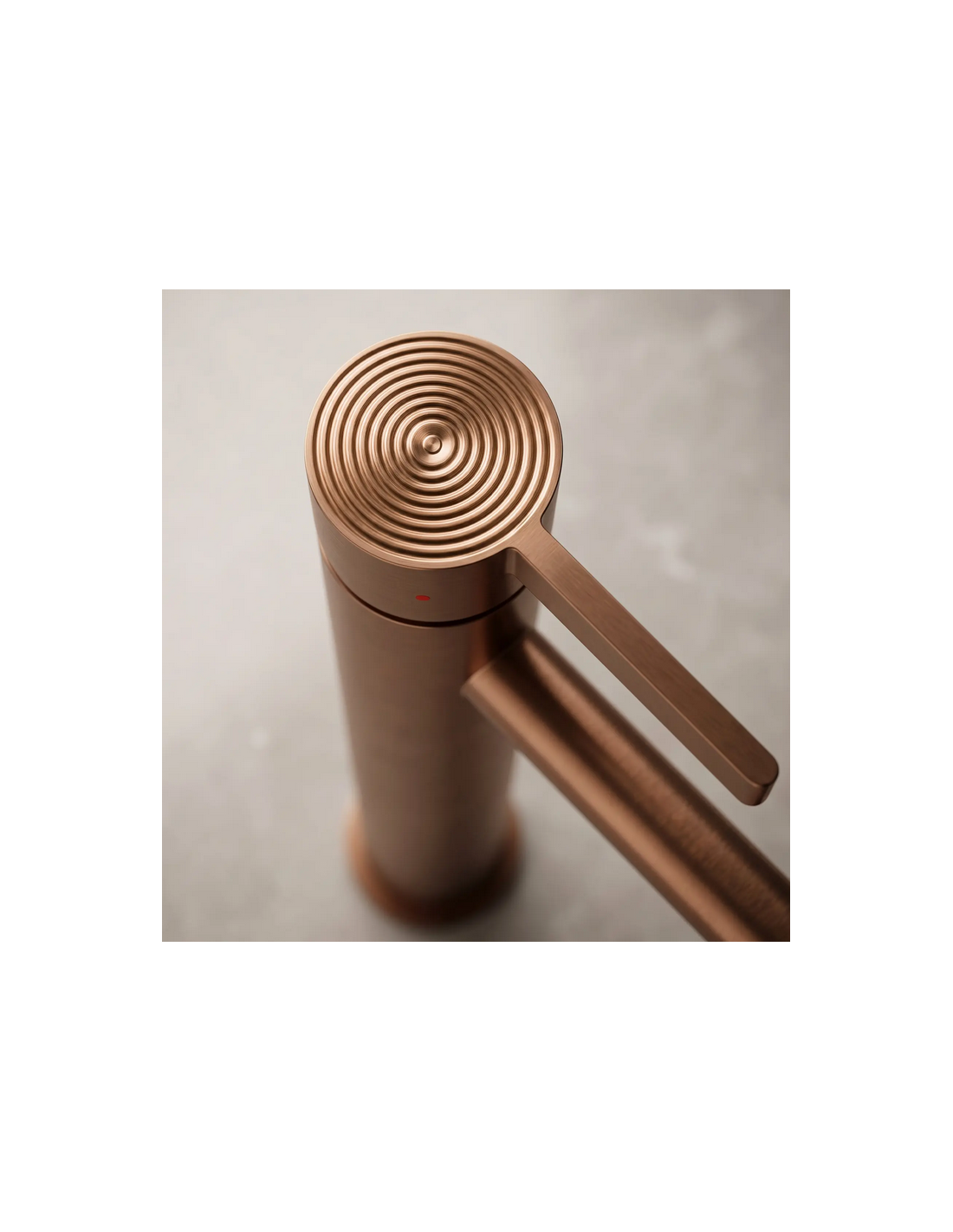 FOSTER Armatur til håndvaske, udført i et moderne design af børstet kobberfarvet lakeret messing. Armaturet måler 28,7 cm i højden og er med fleksible slanger (3/8“). Armaturet har drejbart termostat.