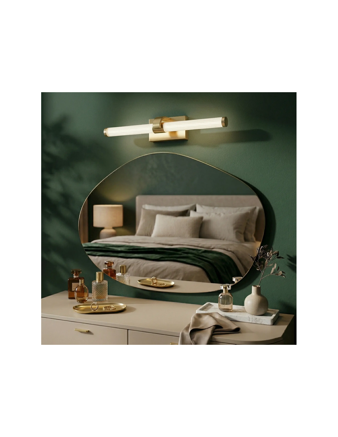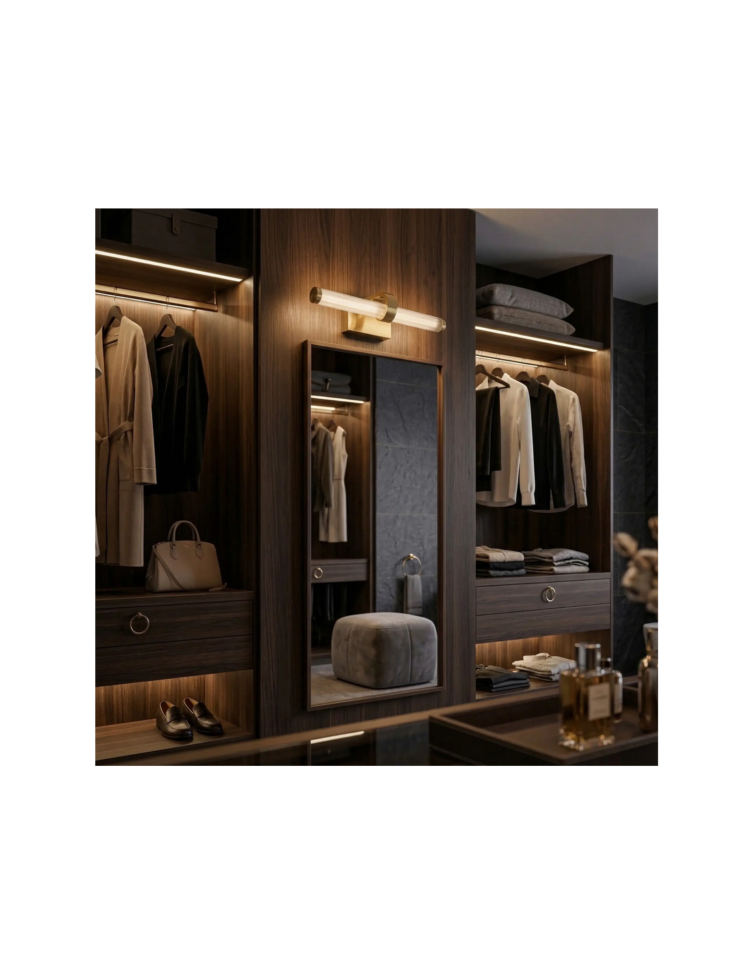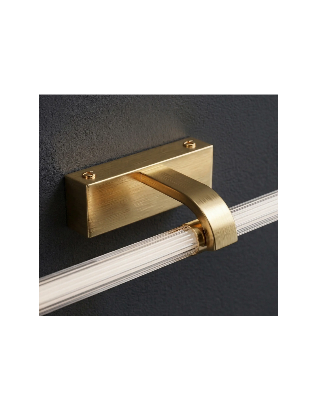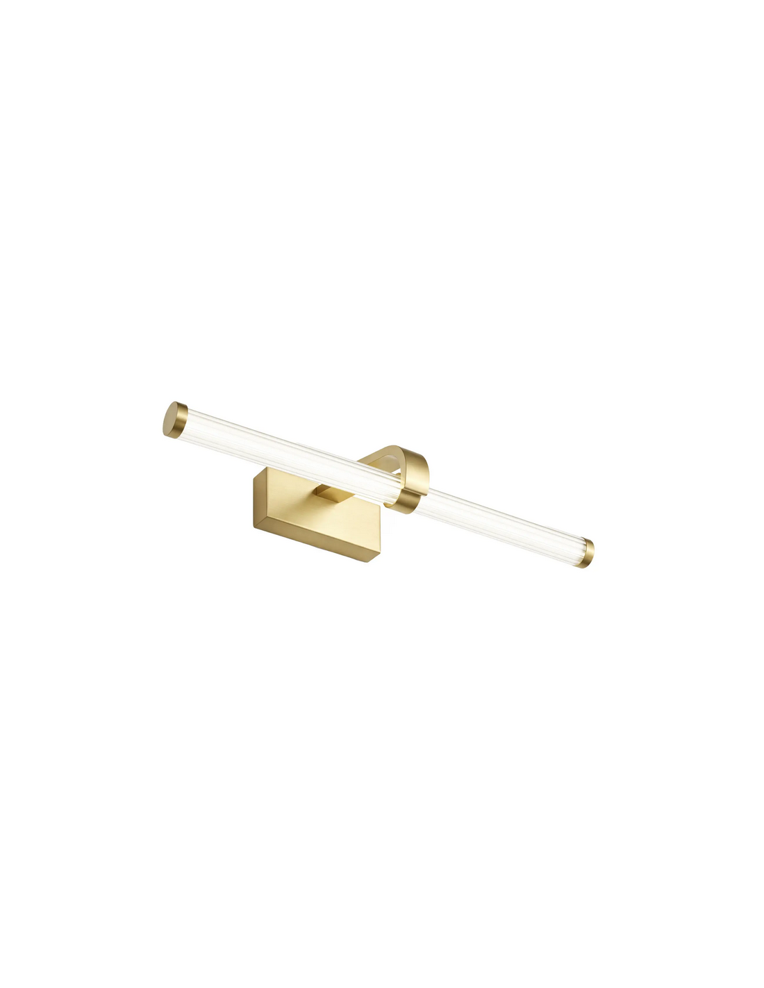 Badeværelseslampe fremstillet i et design af børstet guldfarvet lakeret aluminium og klart kunststof. Lampen måler 5 cm i højden og 40 x 14,5 cm i bredde og dybde/fremspring og anvender 9W LED indbygget lyskilde (Inkl.). Denne lampe er med farvetemperatur på 4000K kold hvid.