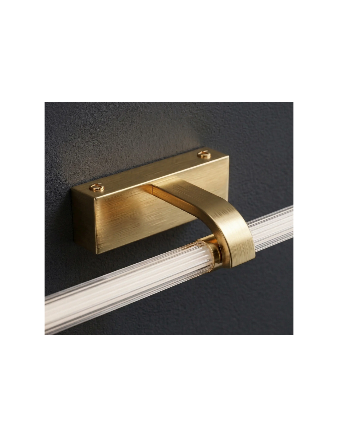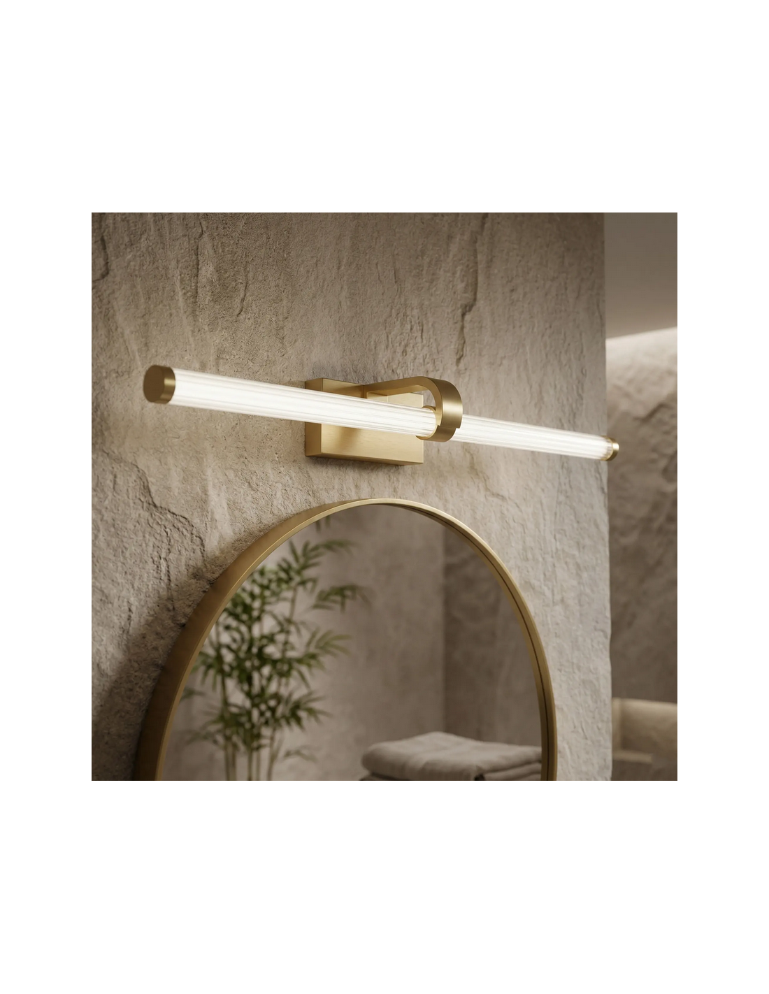 Badeværelseslampe fremstillet i et design af børstet guldfarvet lakeret aluminium og klart kunststof. Lampen måler 5 cm i højden og 60 x 14,5 cm i bredde og dybde/fremspring og anvender 13W LED indbygget lyskilde (Inkl.). Denne lampe er med farvetemperatur på 4000K kold hvid.