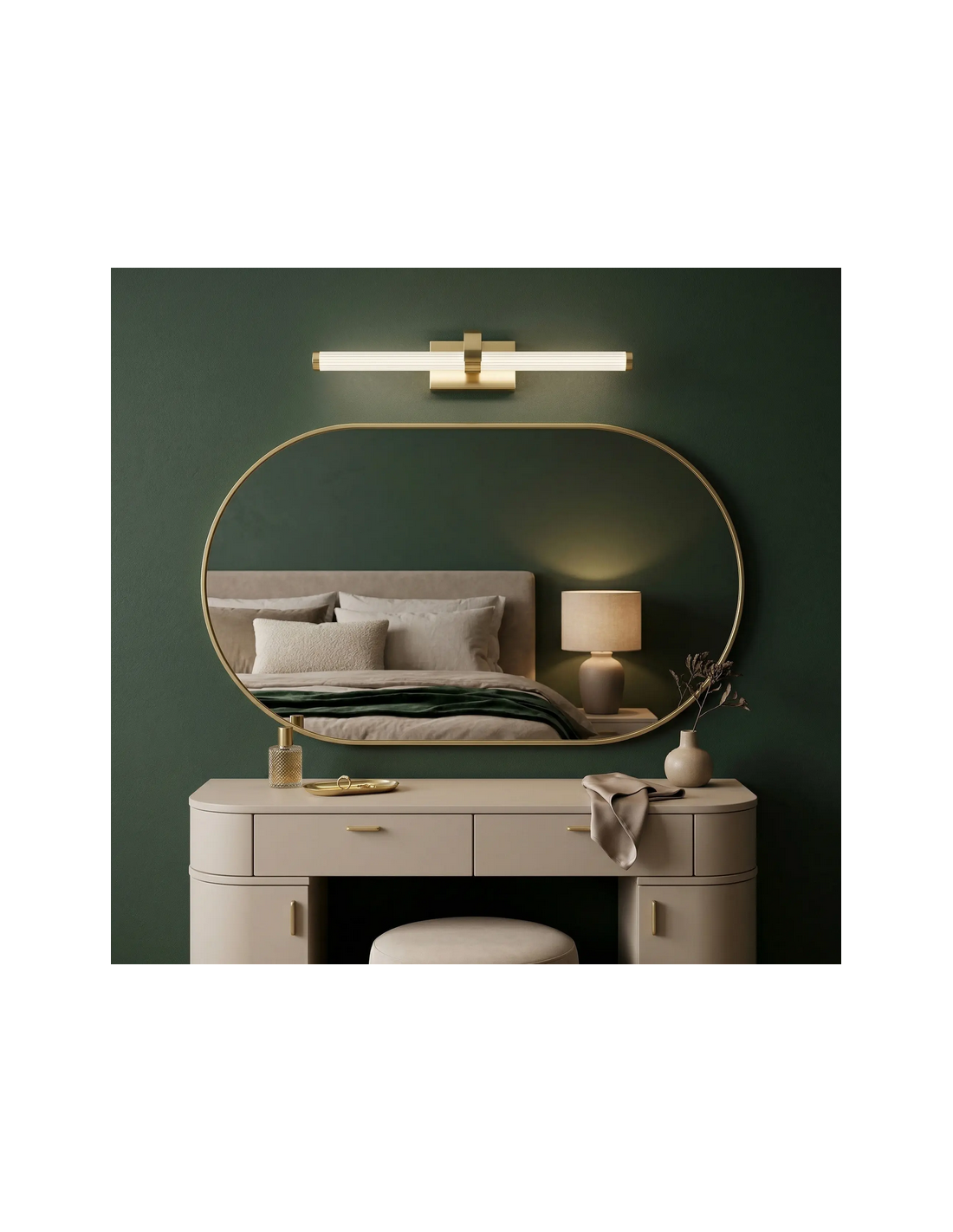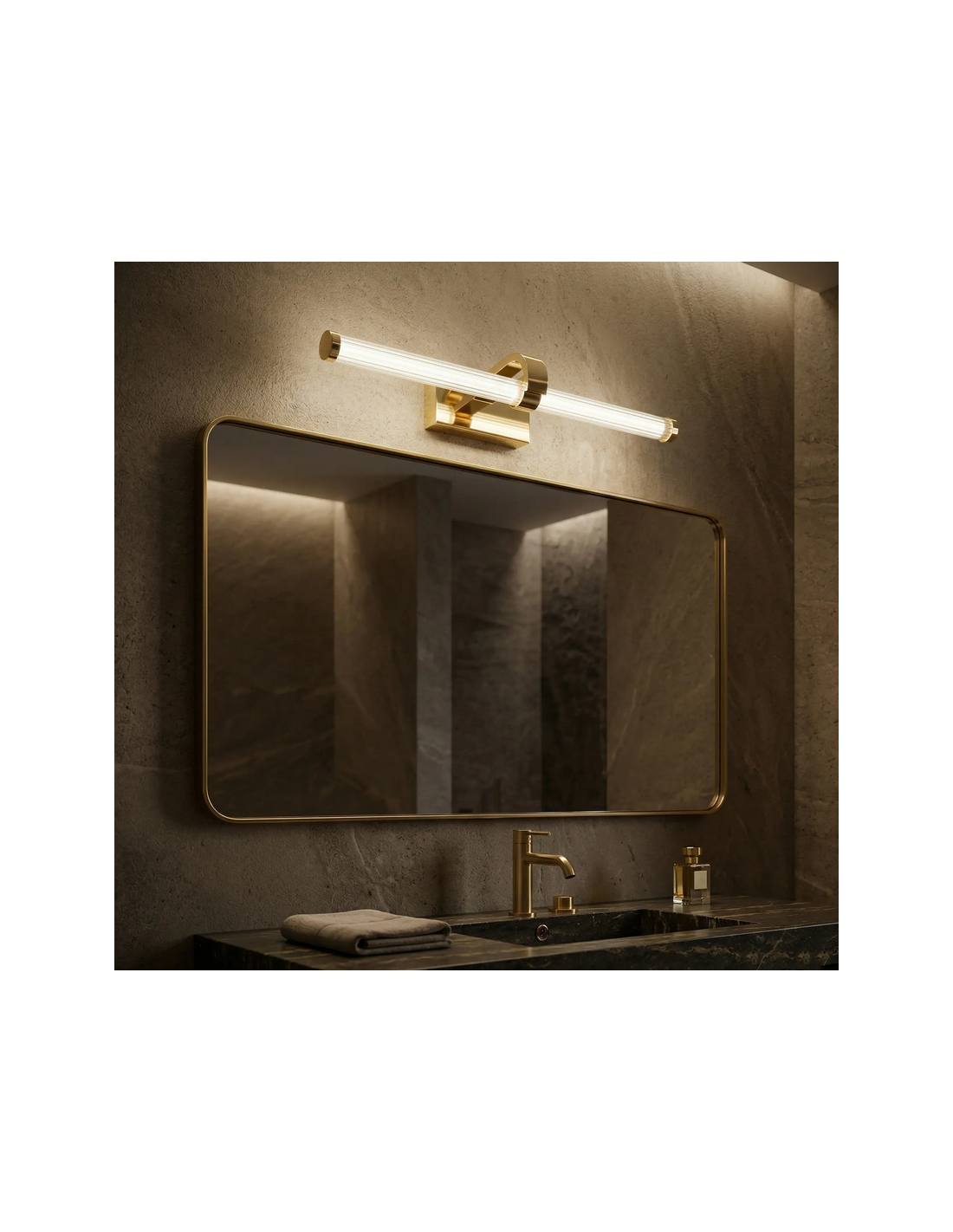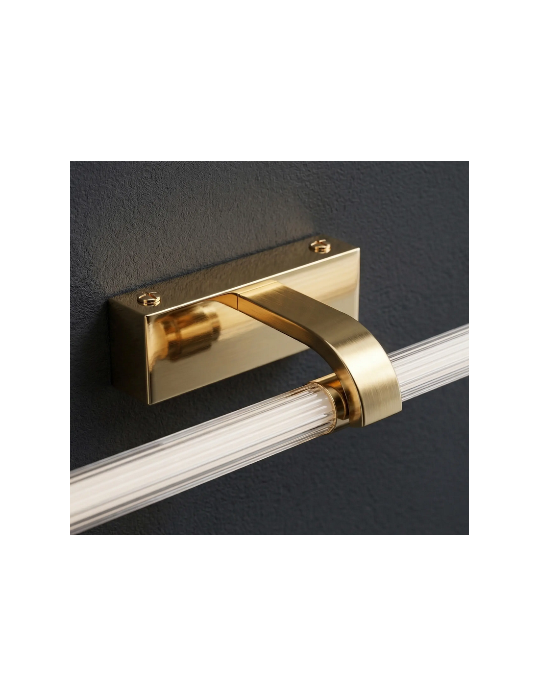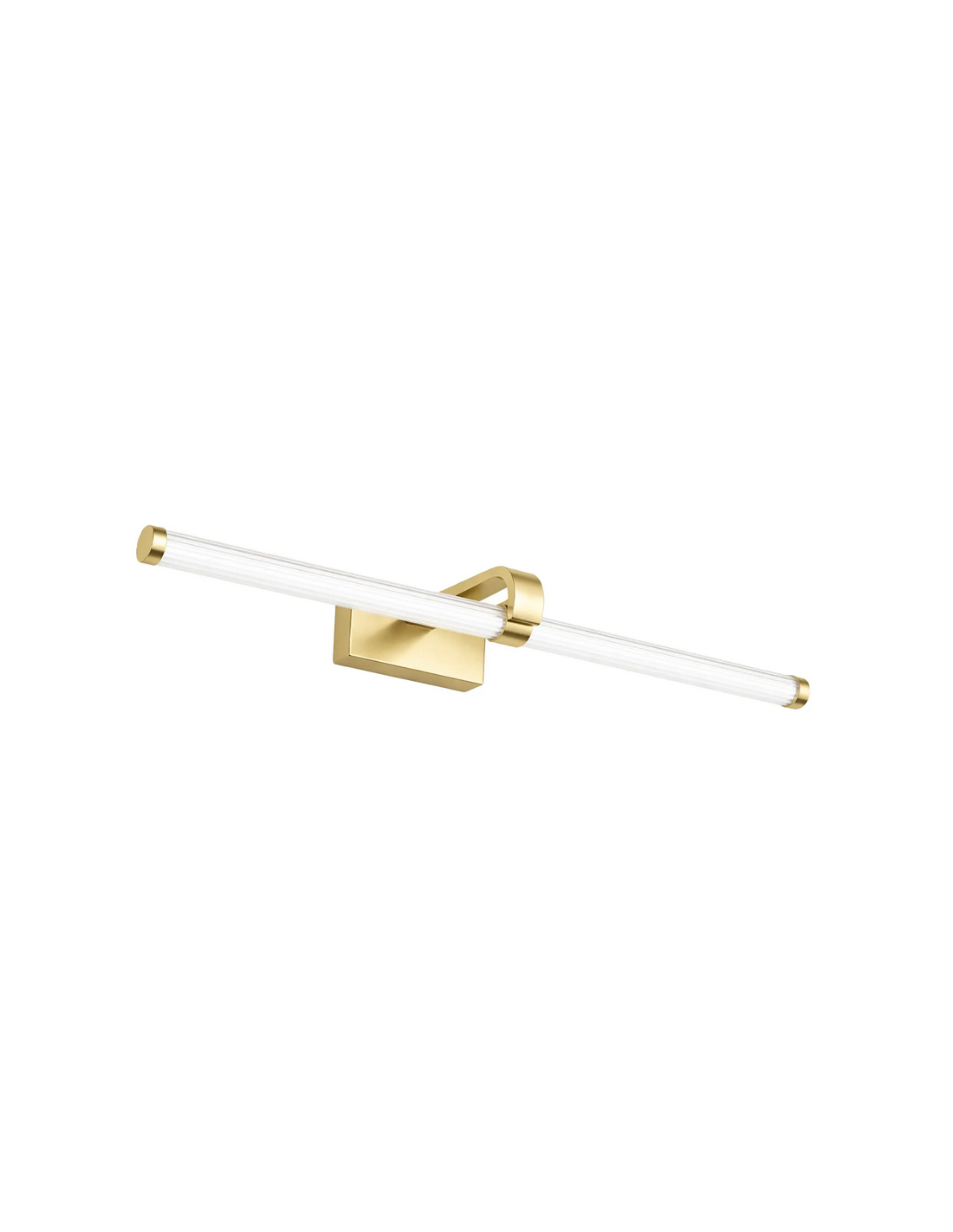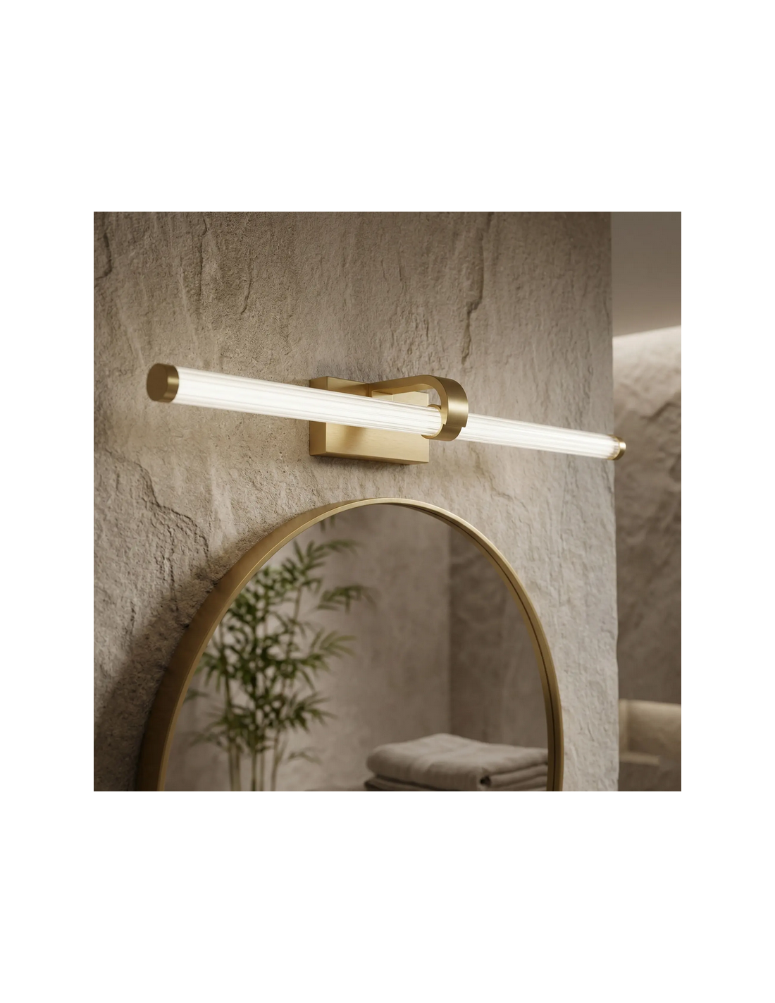 Badeværelseslampe fremstillet i et design af guldfarvet lakeret aluminium og klart kunststof. Lampen måler 5 cm i højden og 60 x 14,5 cm i bredde og dybde/fremspring og anvender 13W LED indbygget lyskilde (Inkl.). Denne lampe er med farvetemperatur på 4000K kold hvid.