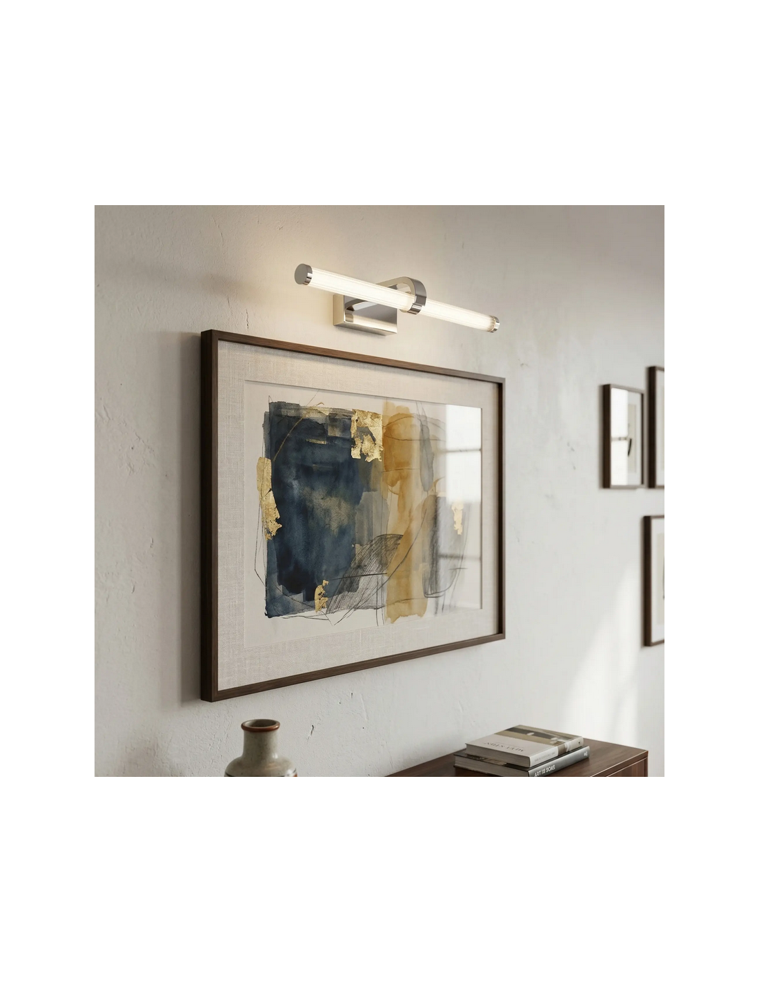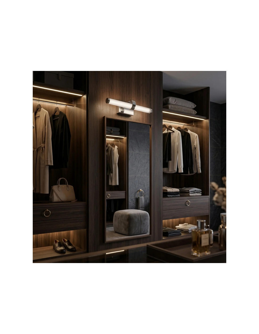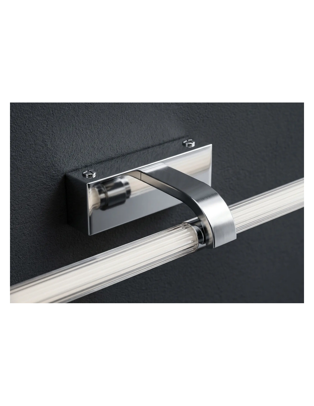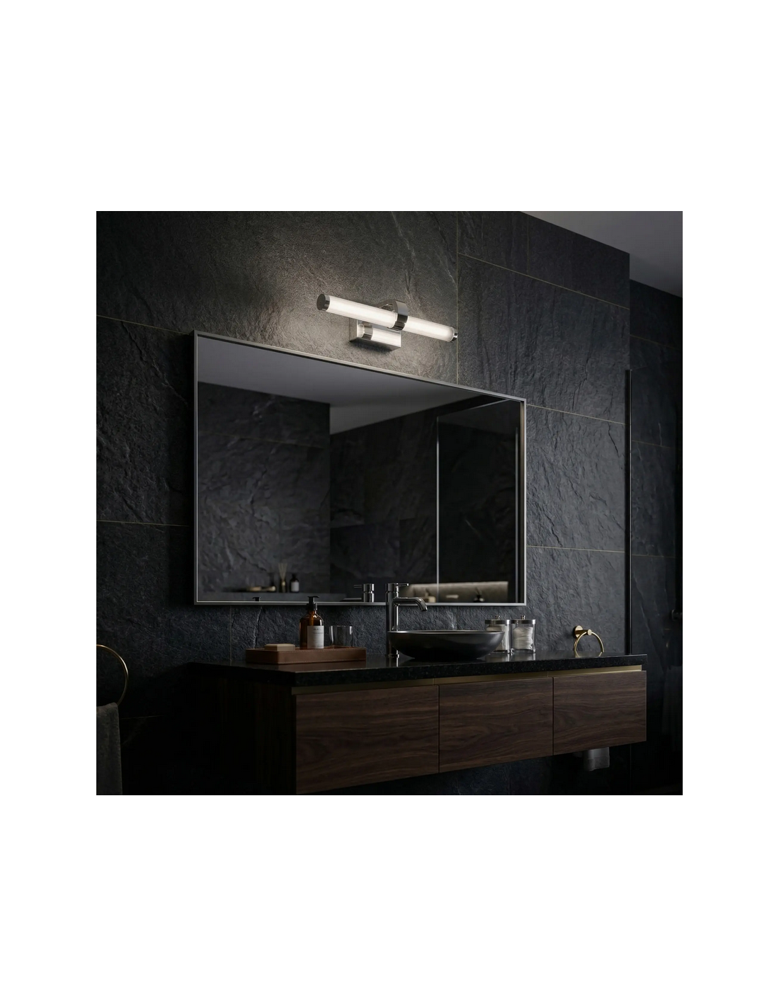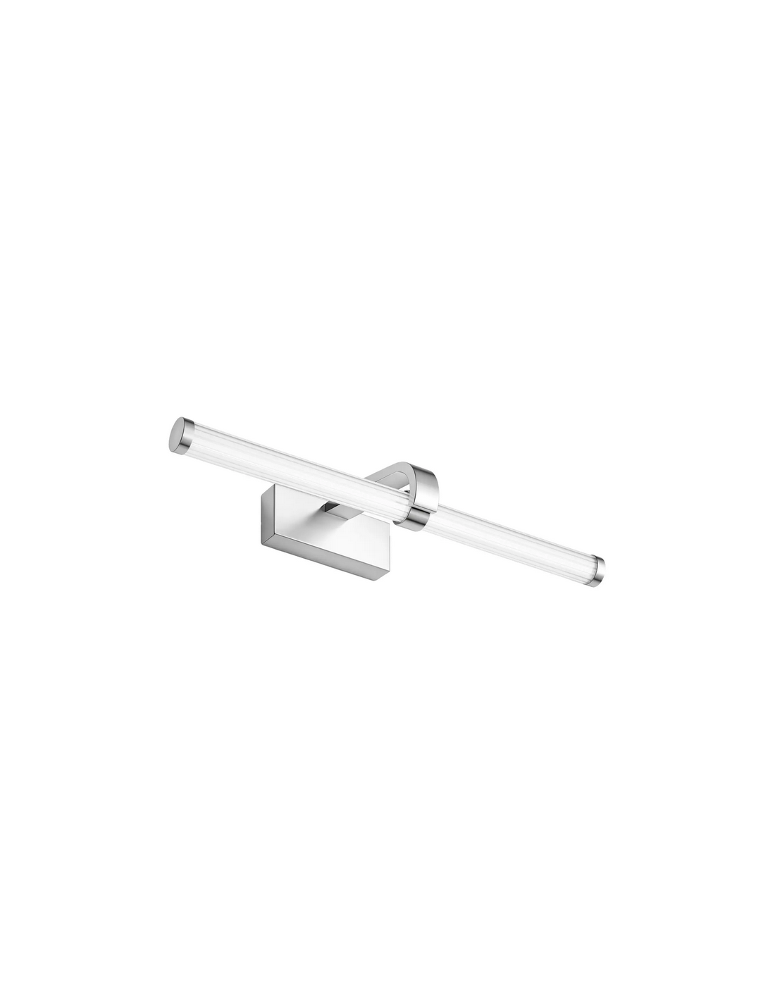 Badeværelseslampe fremstillet i et design af kromlakeret aluminium og klart kunststof. Lampen måler 5 cm i højden og 40 x 14,5 cm i bredde og dybde/fremspring og anvender 9W LED indbygget lyskilde (Inkl.). Denne lampe er med farvetemperatur på 4000K kold hvid.