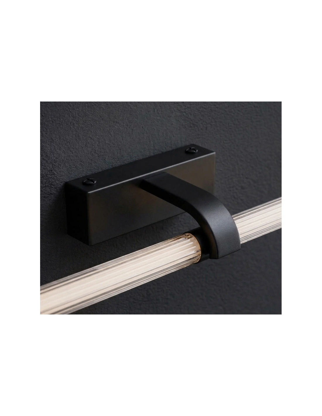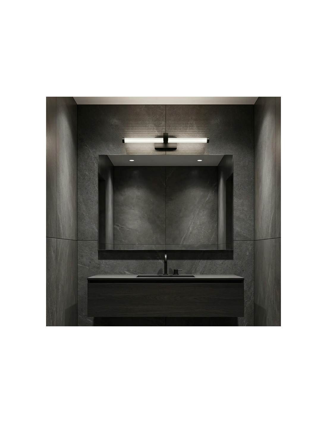 Badeværelseslampe fremstillet i et design af sortlakeret aluminium og klart kunststof. Lampen måler 5 cm i højden og 40 x 14,5 cm i bredde og dybde/fremspring og anvender 9W LED indbygget lyskilde (Inkl.). Denne lampe er med farvetemperatur på 4000K kold hvid.