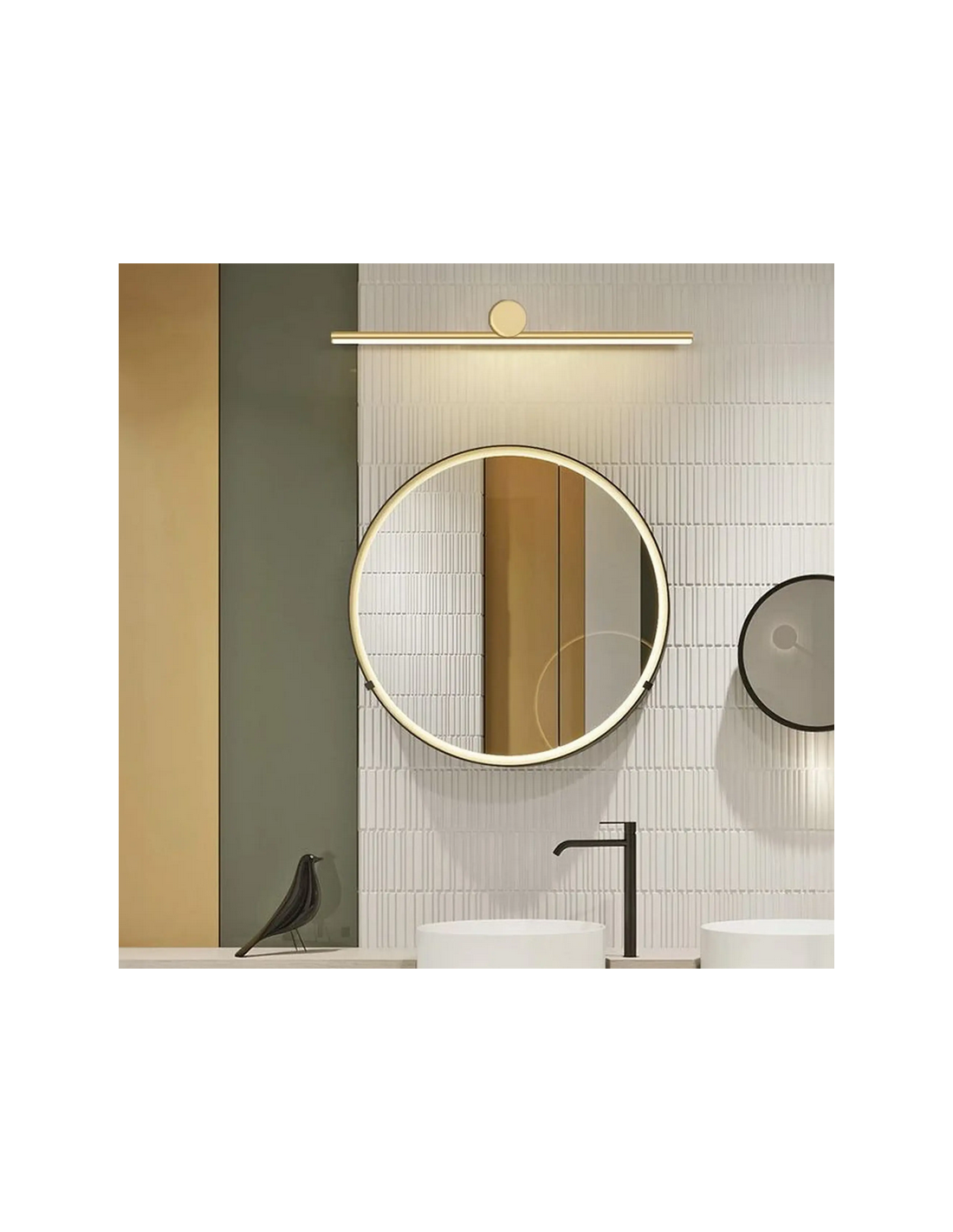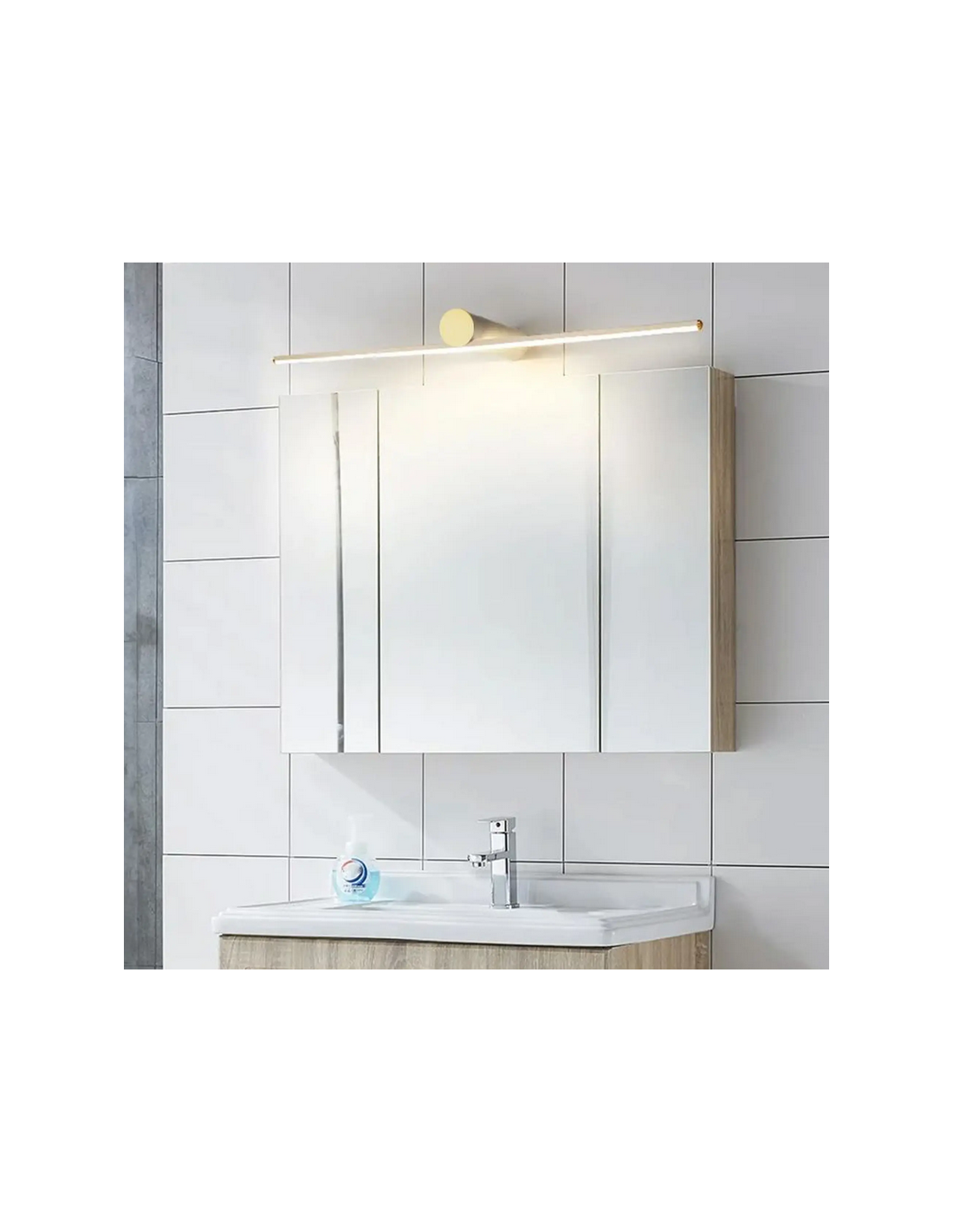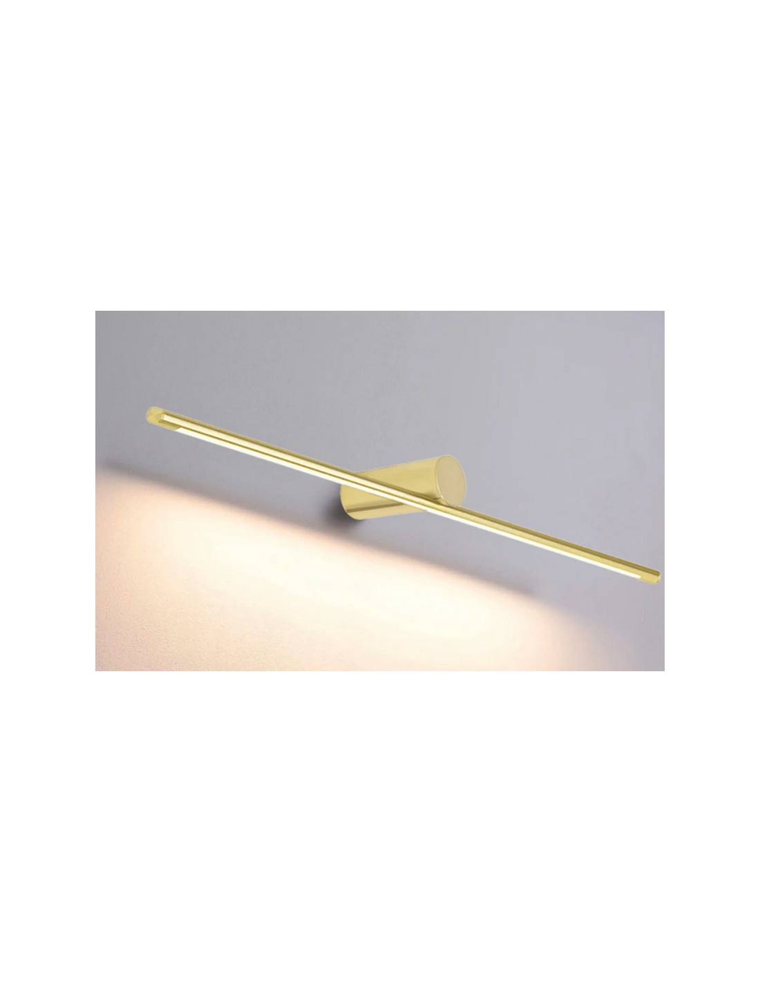 Badeværelseslampe fremstillet i et design af guldfarvet lakeret aluminium og klart kunststof. Lampen måler 5,5 cm i højden og 61,5 x 13 cm i bredde og dybde/fremspring og anvender 9W LED indbygget lyskilde (Inkl.). Denne lampe er med farvetemperatur på 4000K kold hvid.