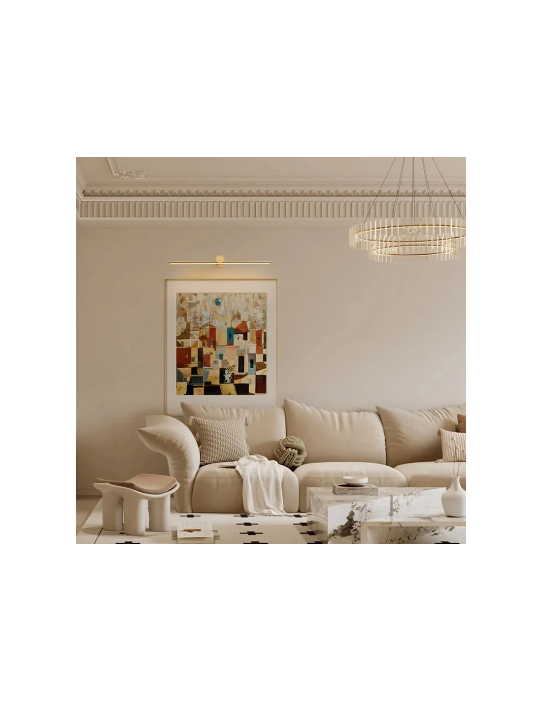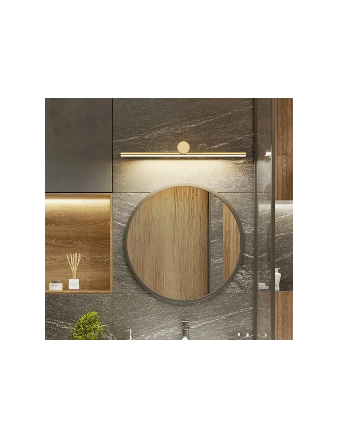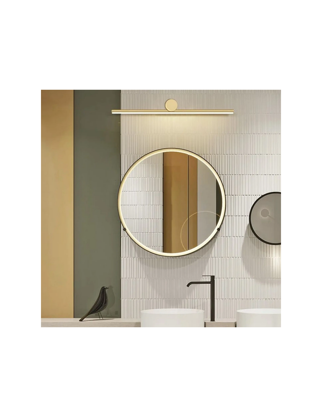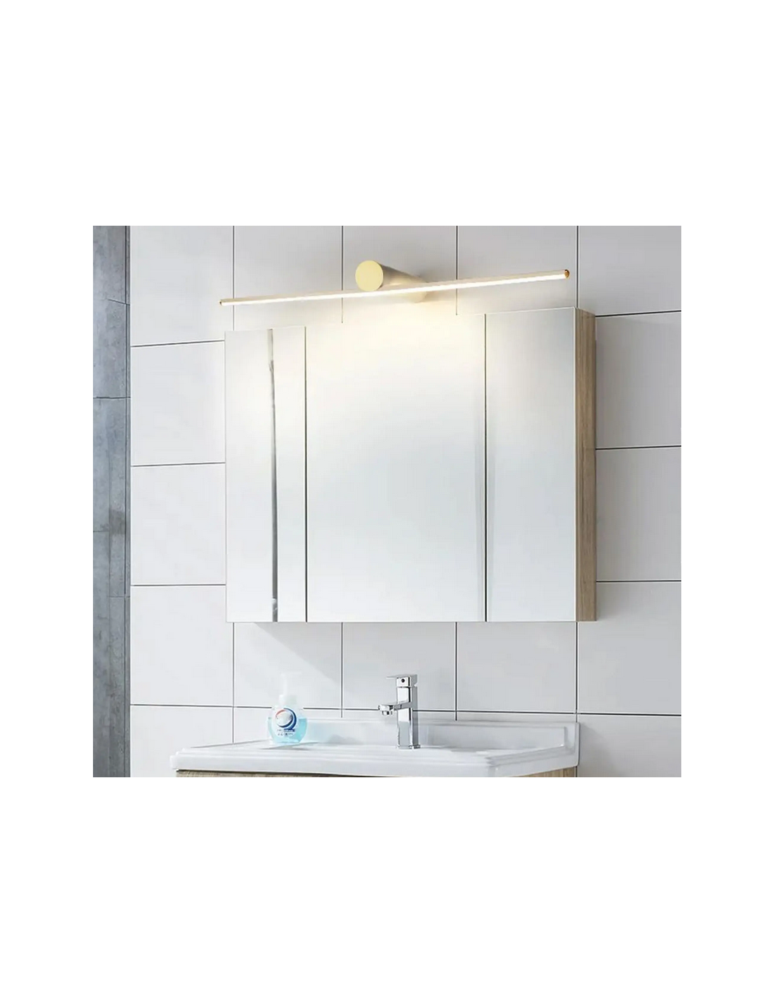Badeværelseslampe fremstillet i et design af guldfarvet lakeret aluminium og klart kunststof. Lampen måler 5,5 cm i højden og 81,5 x 13 cm i bredde og dybde/fremspring og anvender 6W LED indbygget lyskilde (Inkl.). Denne lampe er med farvetemperatur på 4000K kold hvid.