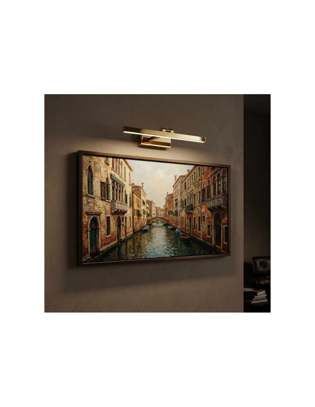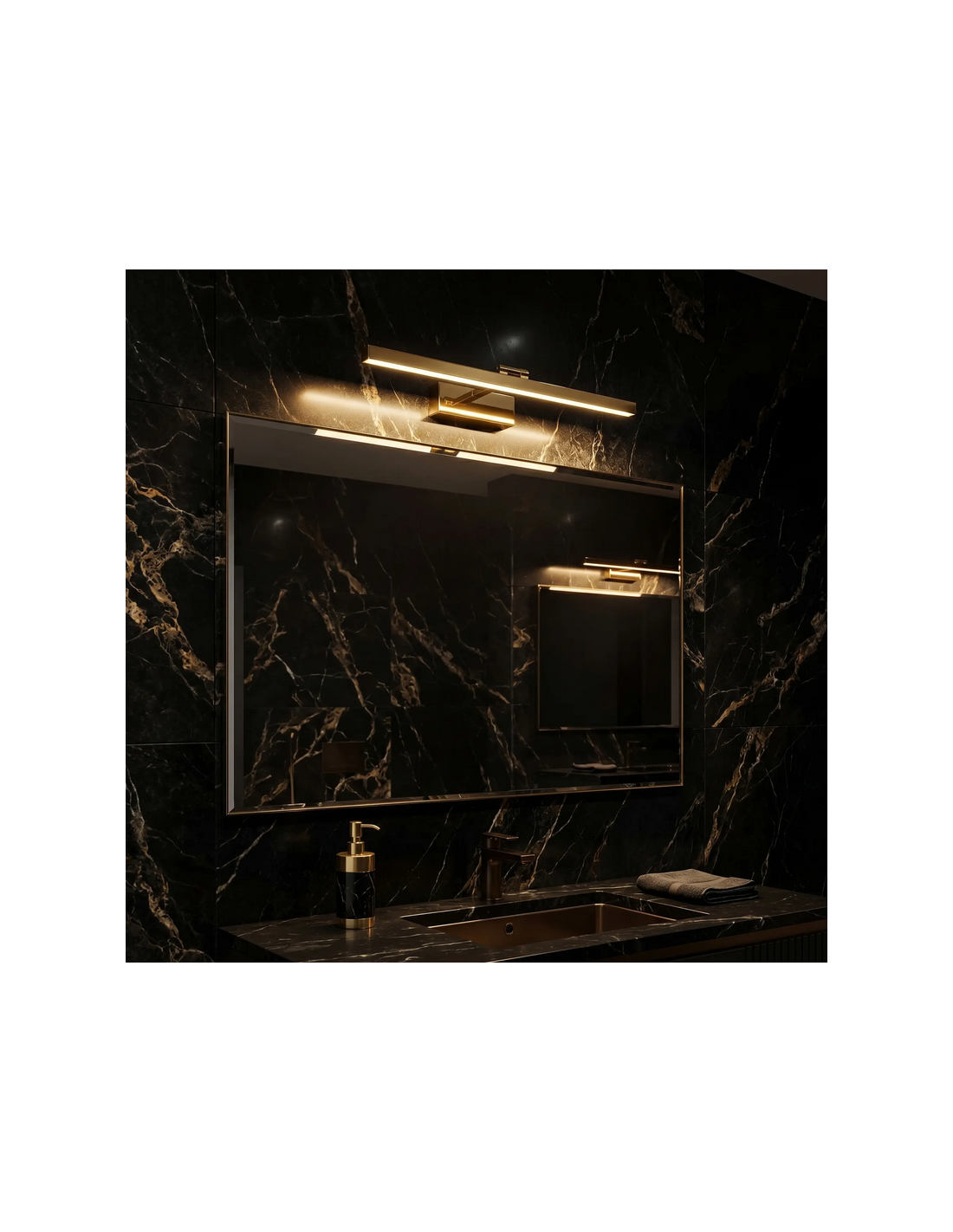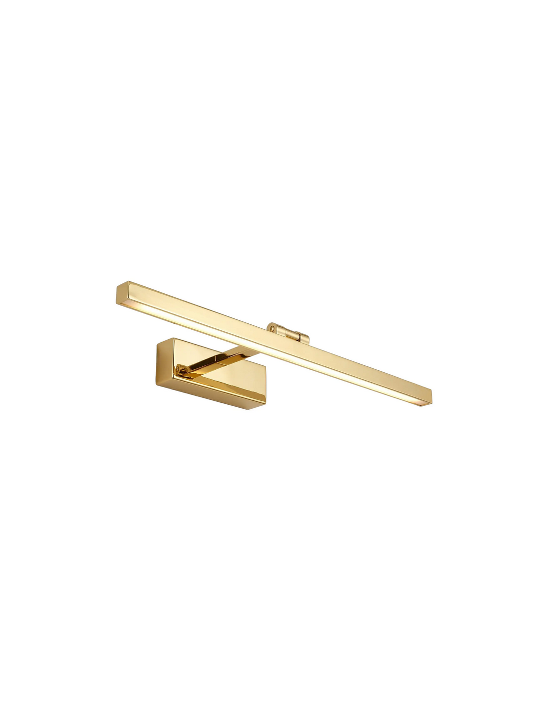 Badeværelseslampe fremstillet i et design af guldfarvet lakeret aluminium og klart kunststof. Lampen måler 5 cm i højden og 60 x 18 cm i bredde og dybde/fremspring og anvender 9W LED indbygget lyskilde (Inkl.). Denne lampe er med farvetemperatur på 4000K kold hvid.