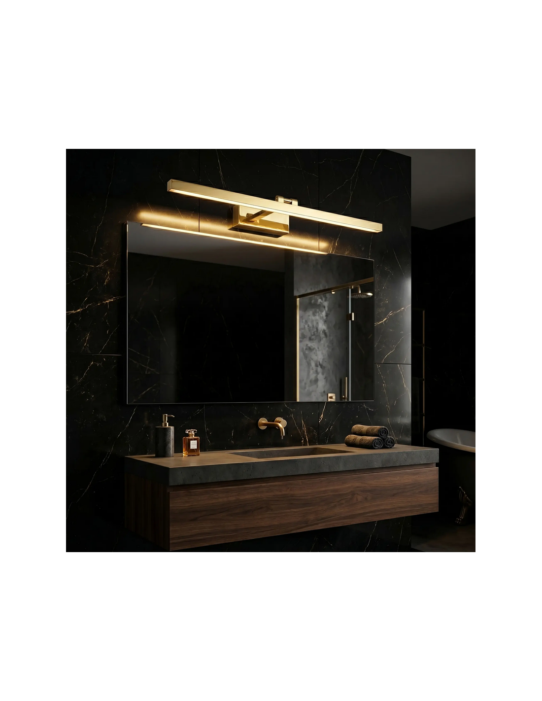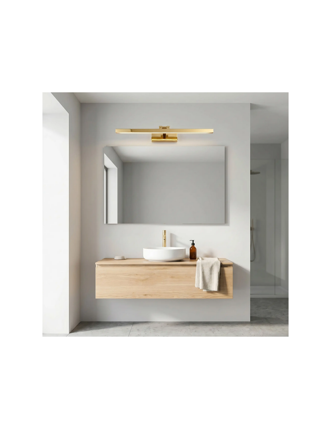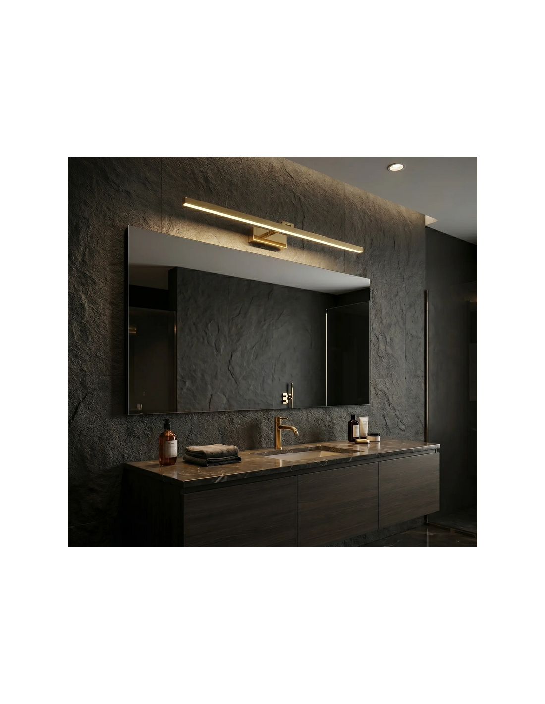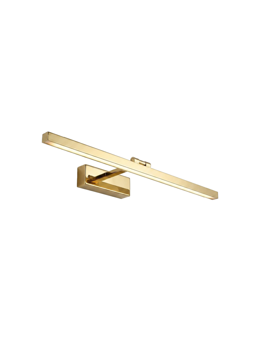 Badeværelseslampe fremstillet i et design af guldfarvet lakeret aluminium og klart kunststof. Lampen måler 5 cm i højden og 80 x 18 cm i bredde og dybde/fremspring og anvender 13W LED indbygget lyskilde (Inkl.). Denne lampe er med farvetemperatur på 4000K kold hvid.