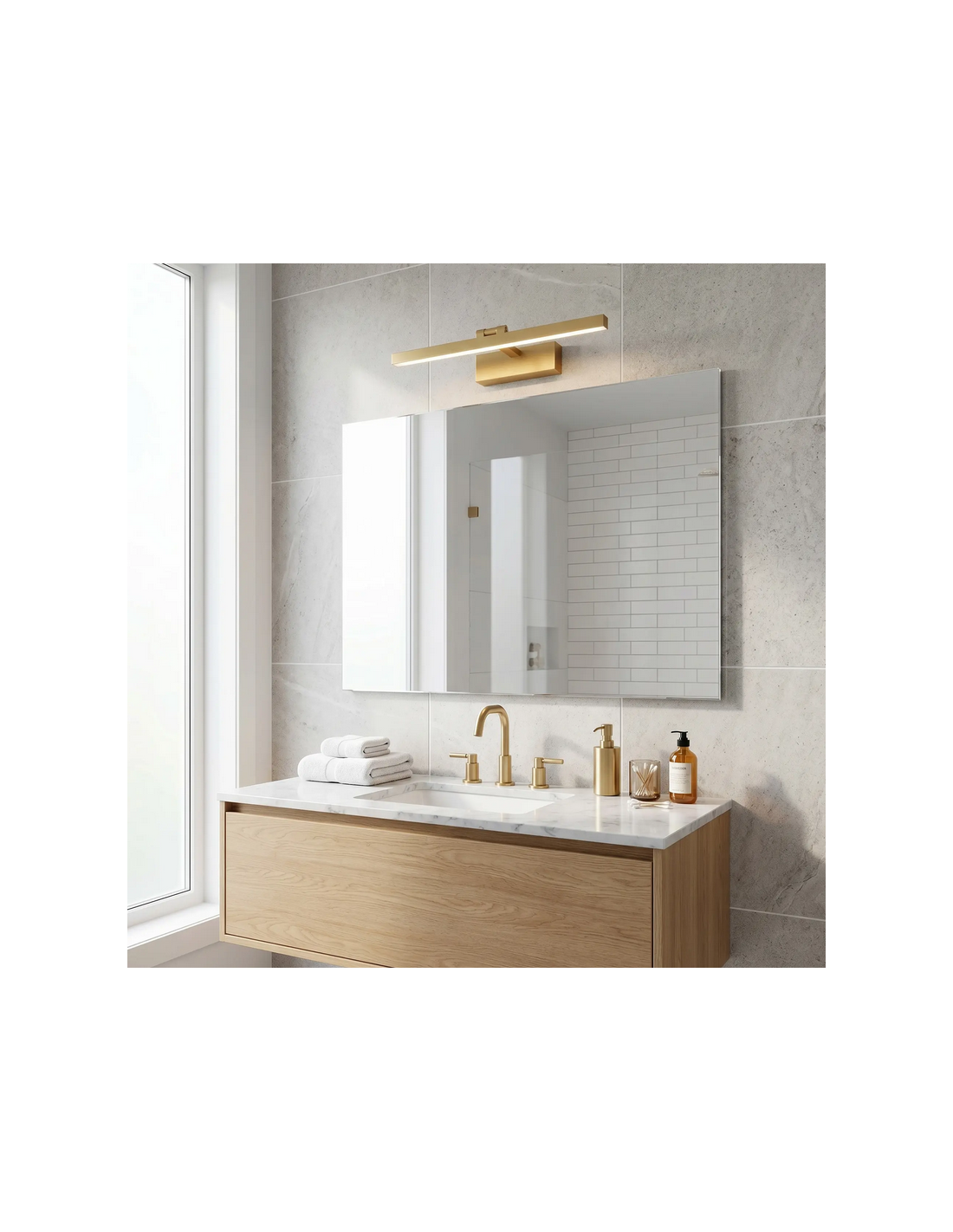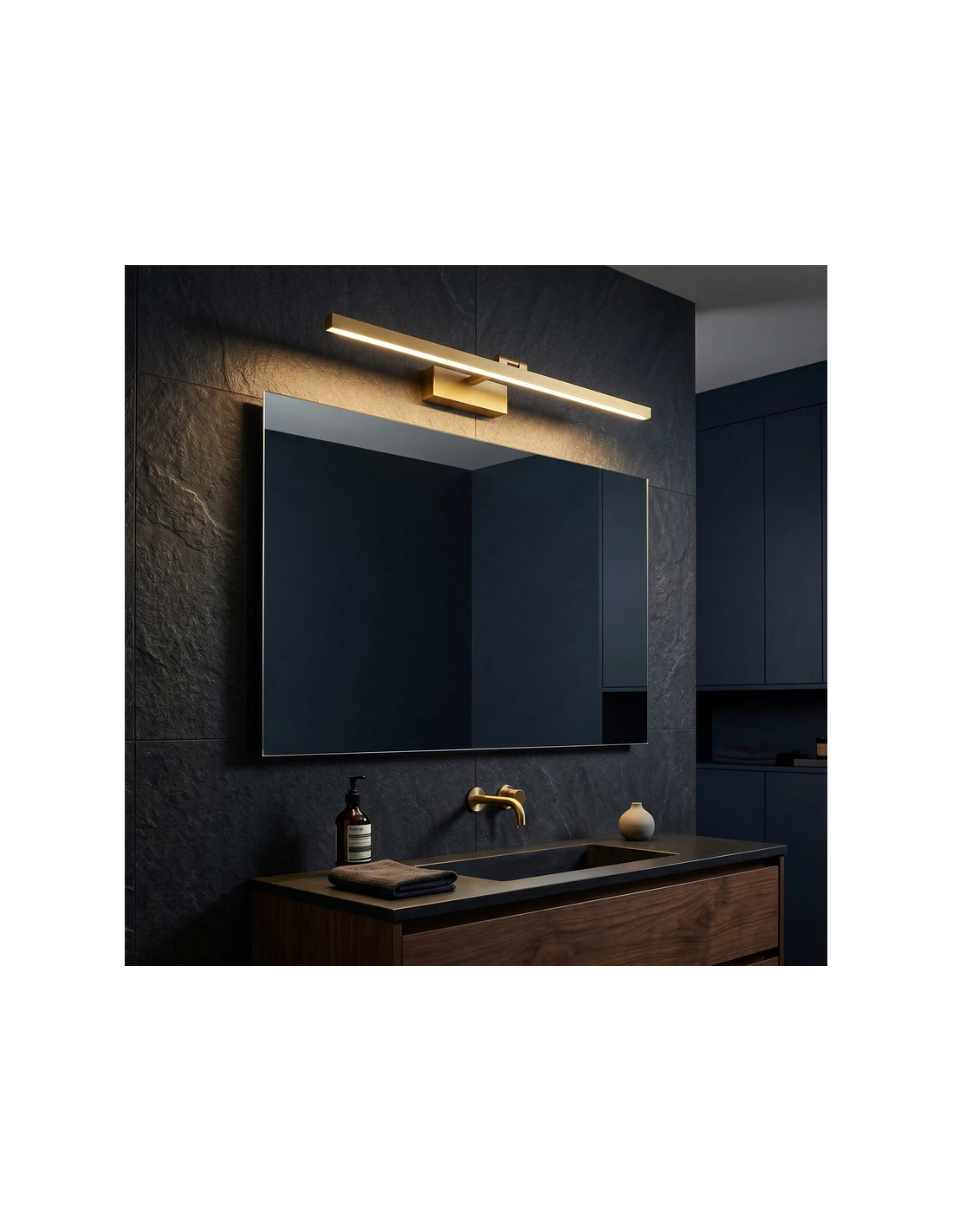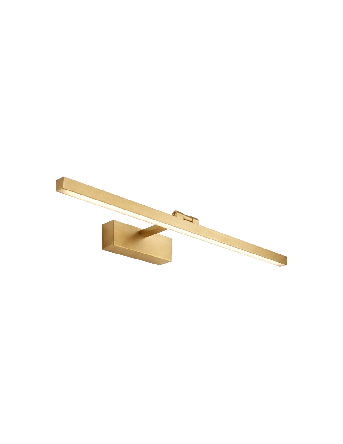 Badeværelseslampe fremstillet i et design af børstet guldfarvet lakeret aluminium og klart kunststof. Lampen måler 5 cm i højden og 80 x 18 cm i bredde og dybde/fremspring og anvender 13W LED indbygget lyskilde (Inkl.). Denne lampe er med farvetemperatur på 4000K kold hvid.