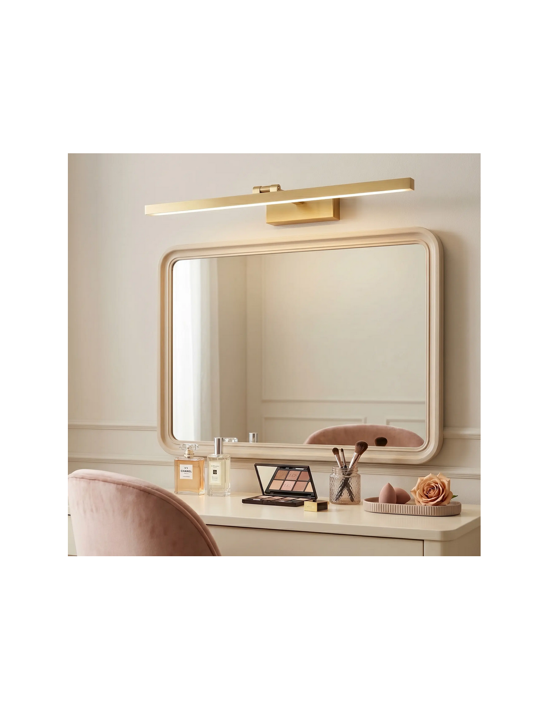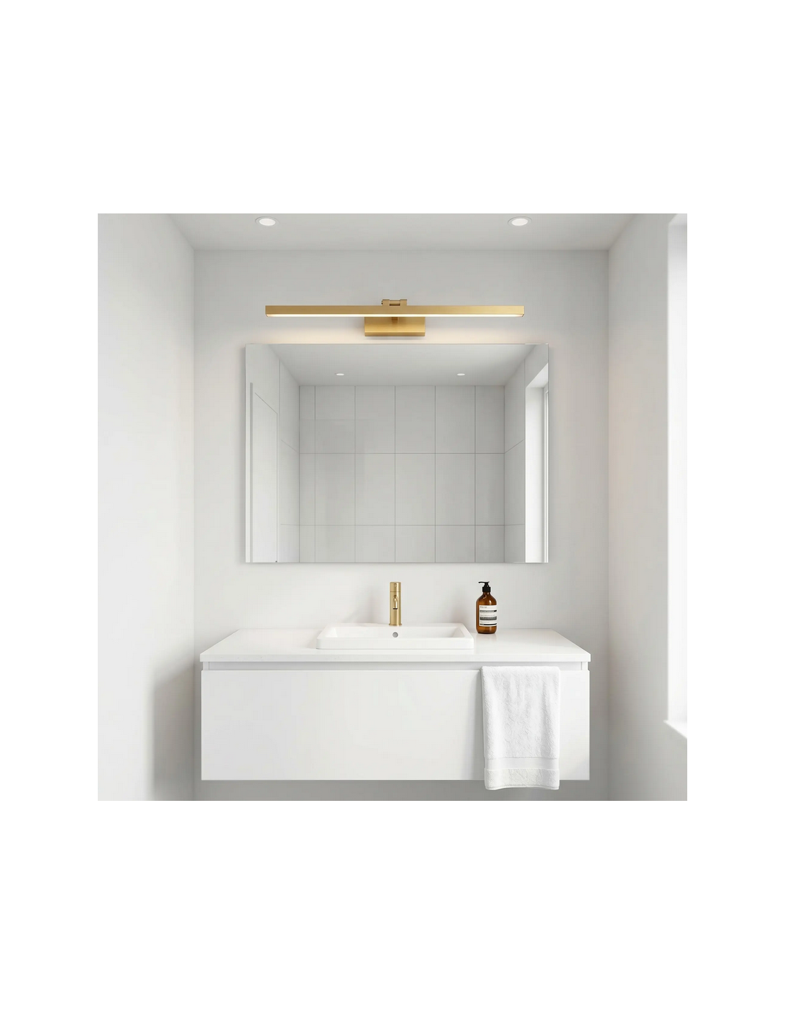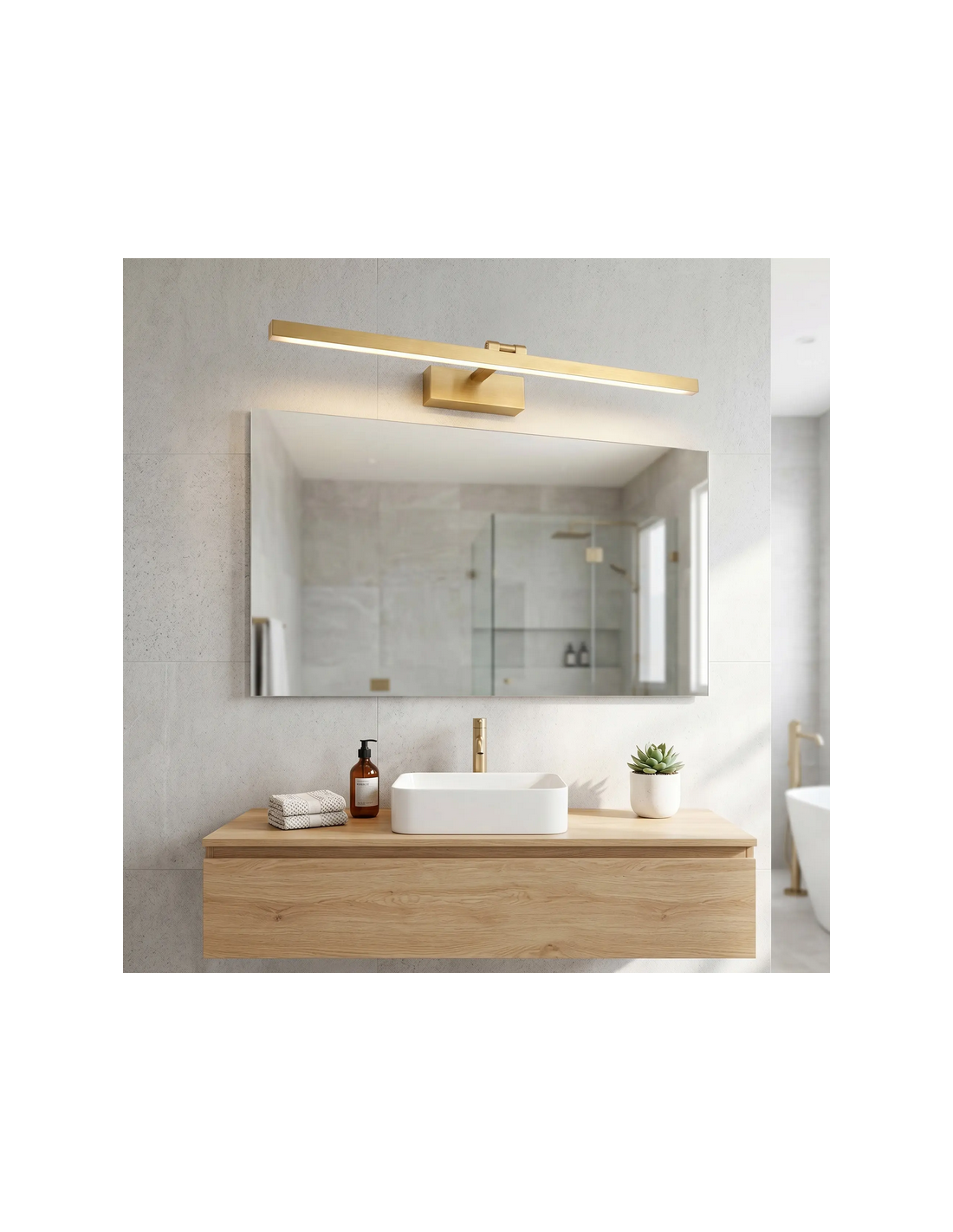 Badeværelseslampe fremstillet i et design af børstet guldfarvet lakeret aluminium og klart kunststof. Lampen måler 5 cm i højden og 80 x 18 cm i bredde og dybde/fremspring og anvender 13W LED indbygget lyskilde (Inkl.). Denne lampe er med farvetemperatur på 4000K kold hvid.