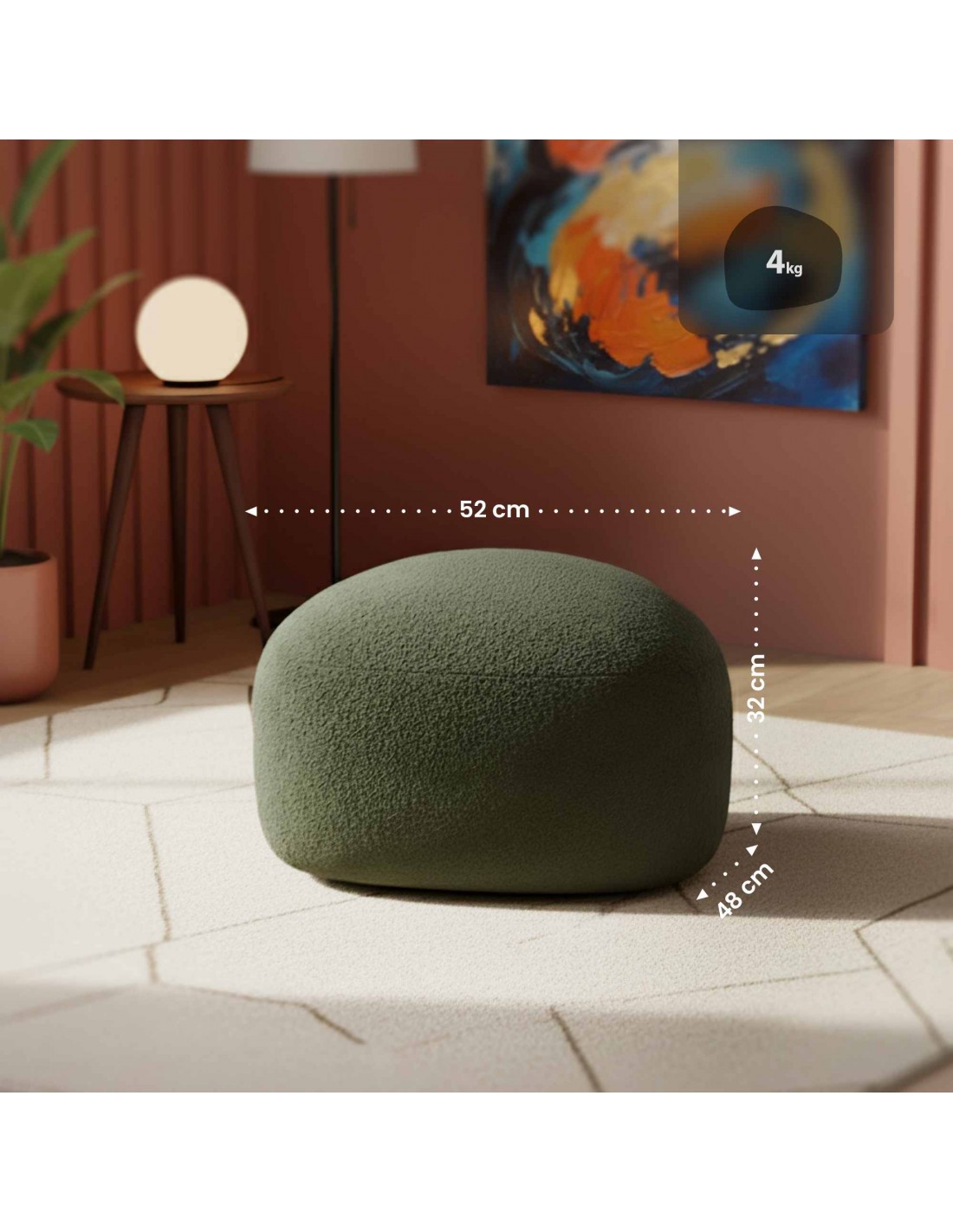 Puf udført i et stilrent design fremstillet af grøn bouclé polyester. Puffen måler 32 cm i højden og 48 x 52 cm i bredde og dybde.