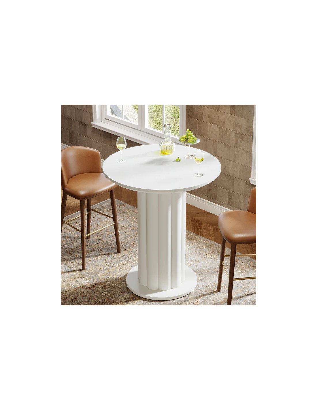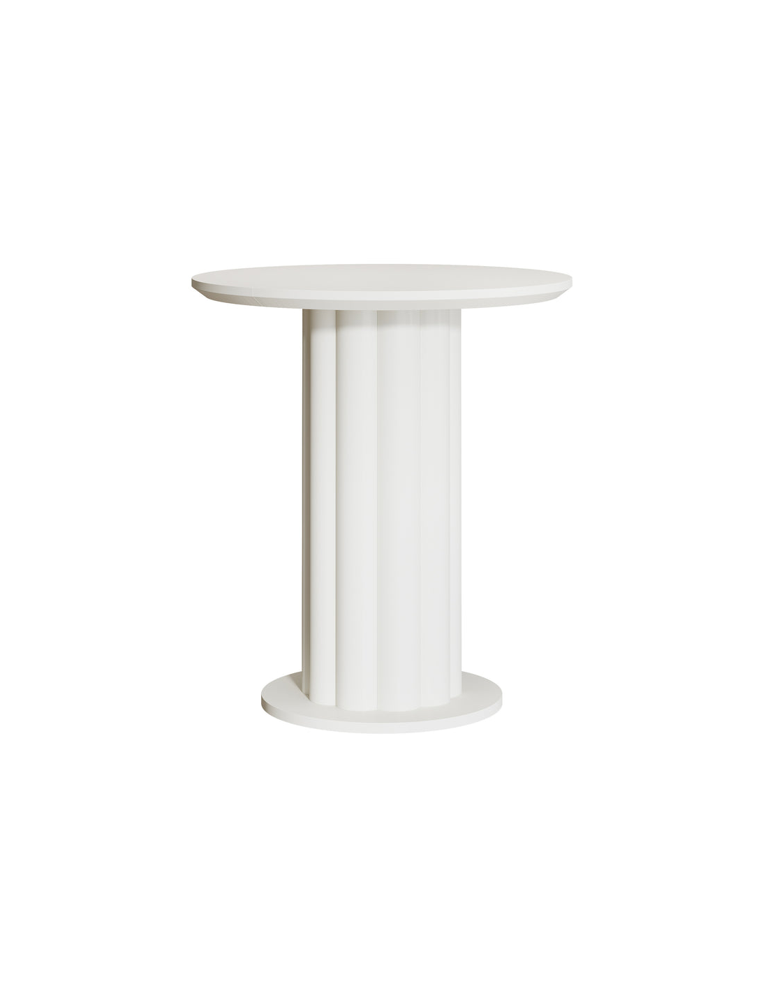 Barbord eller højt spisebord, udført i et design af hvidlakeret MDF. Bordet måler 100 cm i højden og 80 cm i diameter.