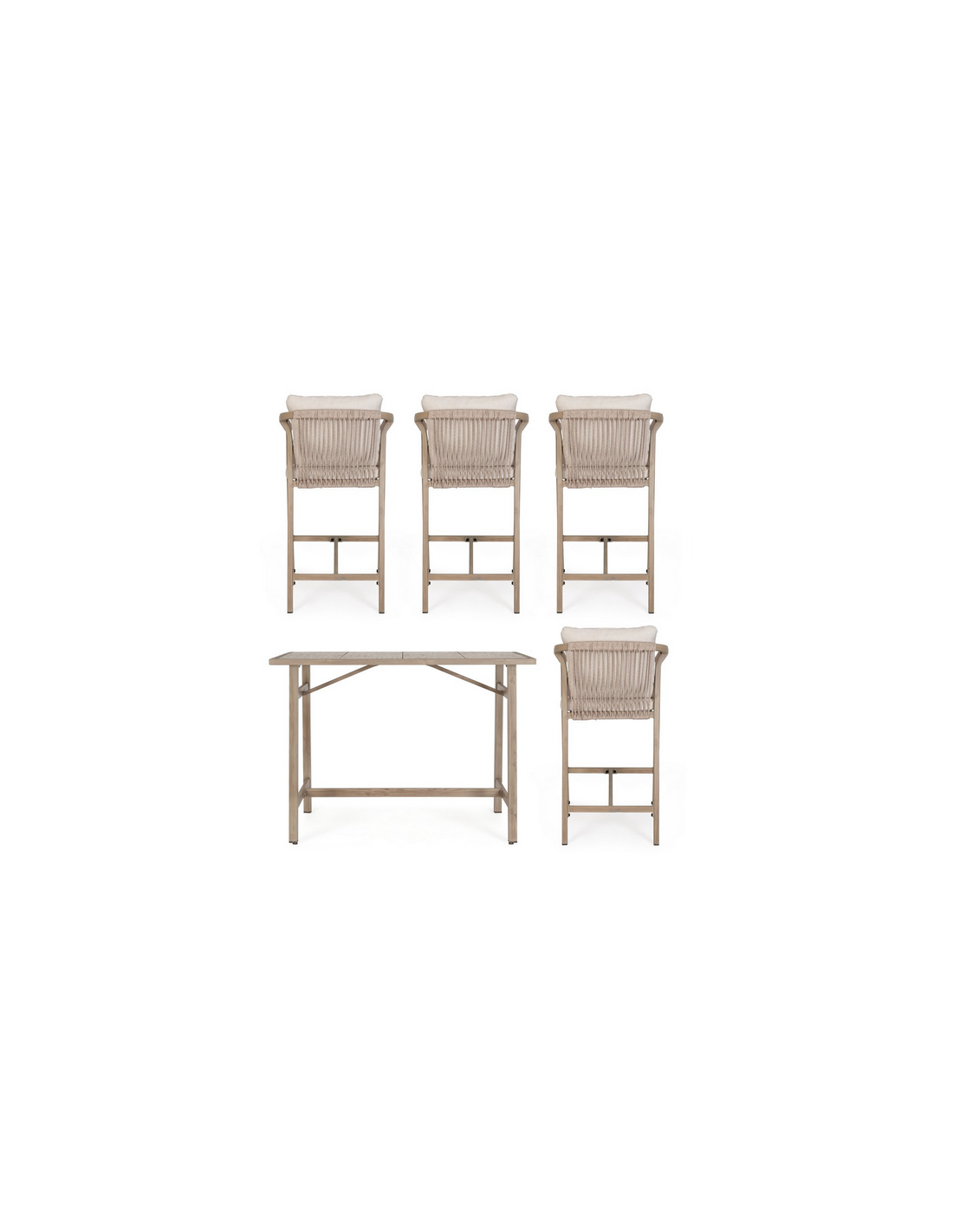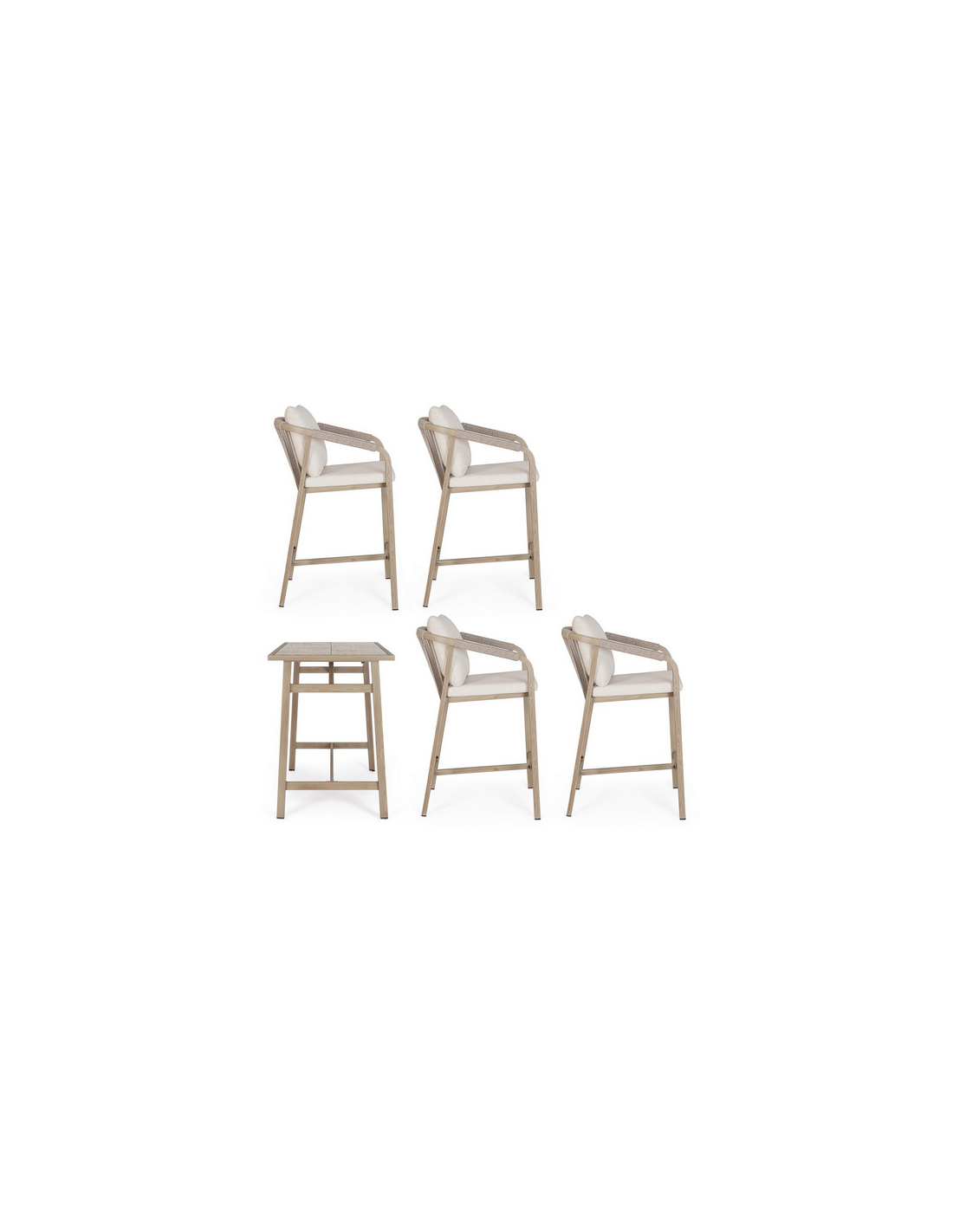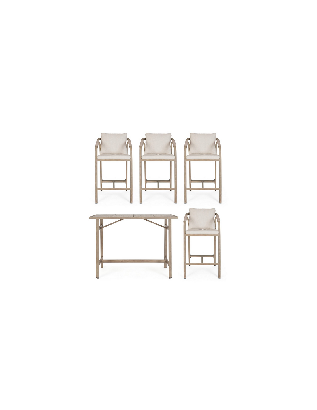 KALI Barbord og 4 x barstole sæt udført i et moderne design af aluminium med gråt trælook og sæde i beige UV-resistent og vandafvisende olefin med hurtigtørrende skumfyld. Bar havestolene måler 107 cm i højden over ryggen og bordet måler 140 x 73 cm i bredde og dybde.