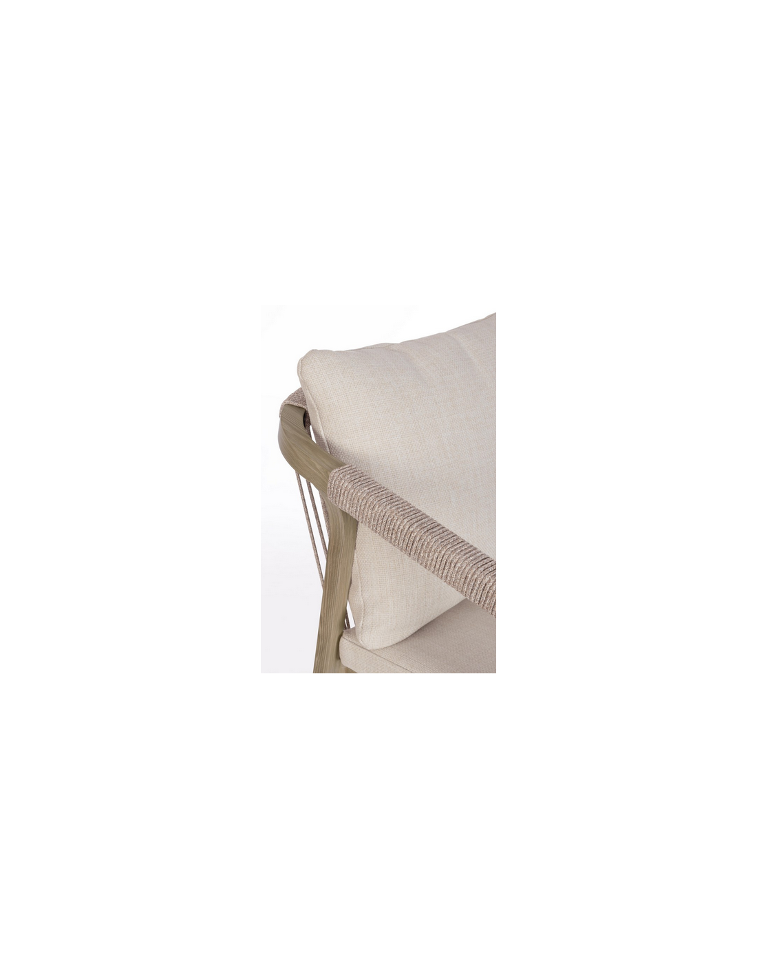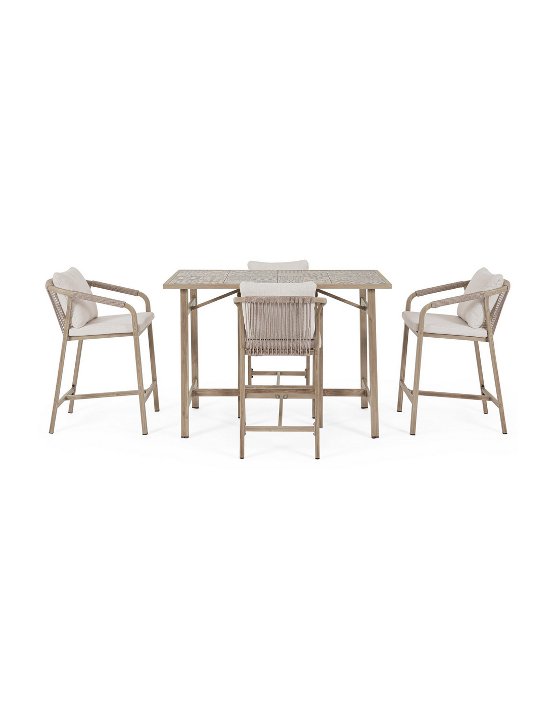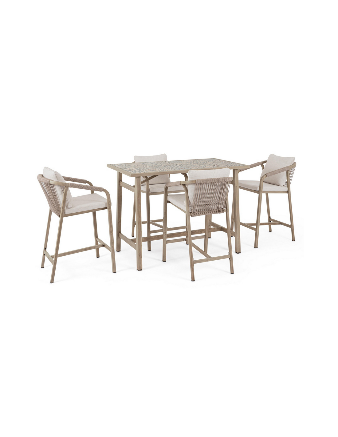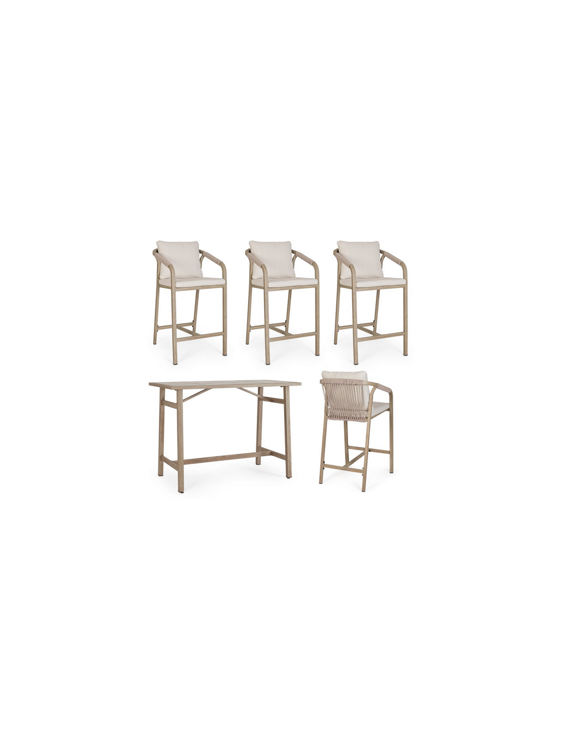 KALI Barbord og 4 x barstole sæt udført i et moderne design af aluminium med gråt trælook og sæde i beige UV-resistent og vandafvisende olefin med hurtigtørrende skumfyld. Bar havestolene måler 107 cm i højden over ryggen og bordet måler 140 x 73 cm i bredde og dybde.