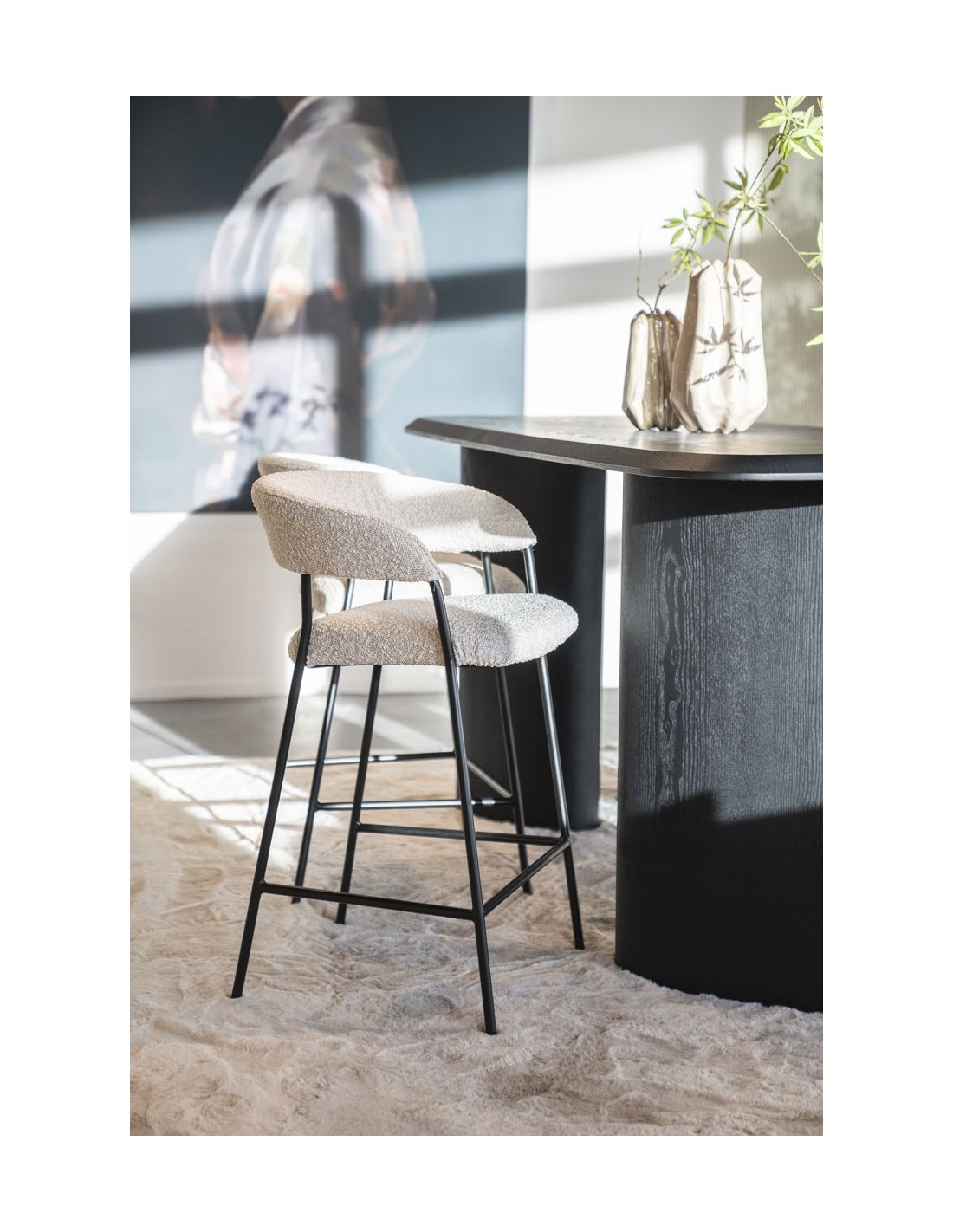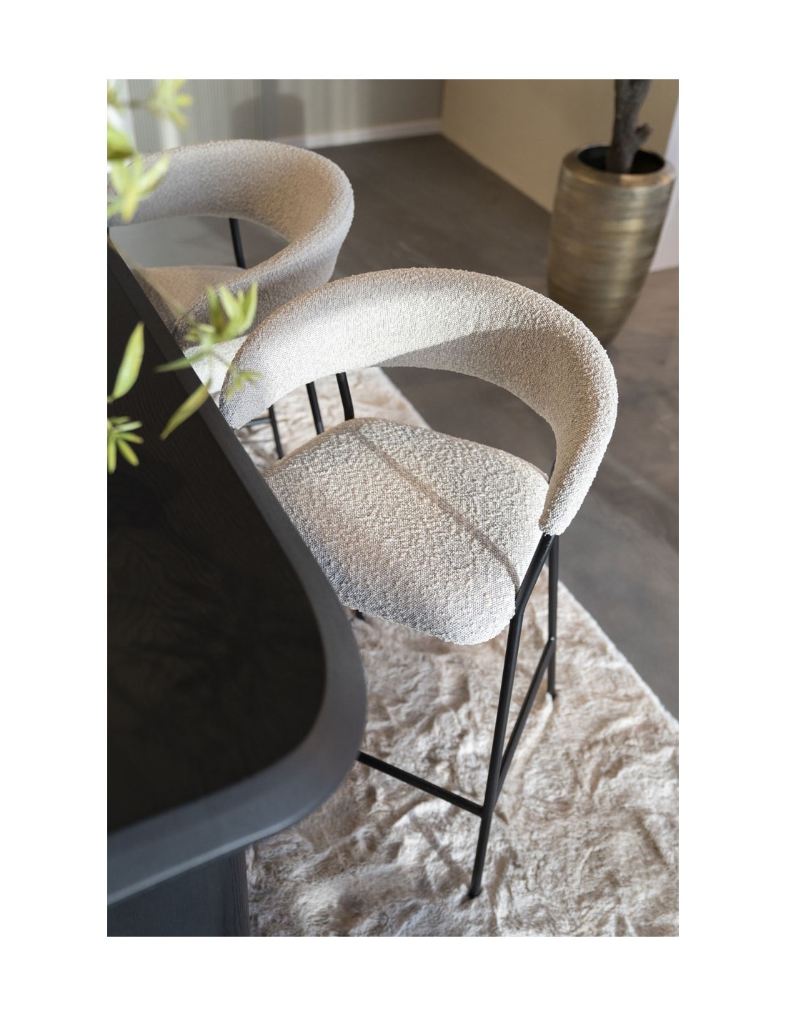 Luka barstol udført i et design af sortlakeret metal og beige bouclé polyester. Barstolen måler 90 cm i højden over ryggen og 67 cm i siddehøjde.