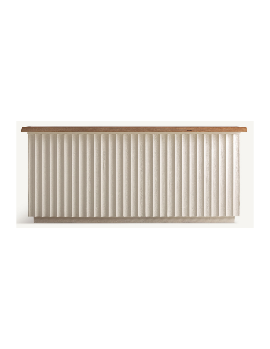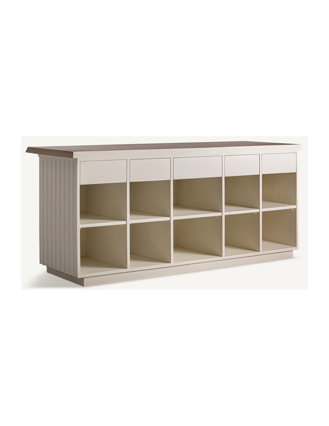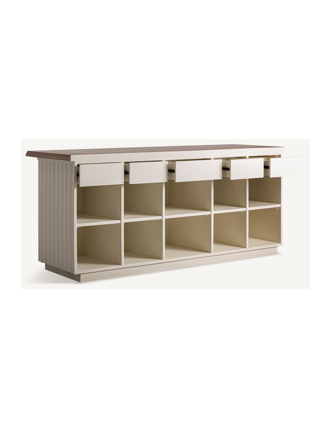 GUIPY Bardisk udført i et rustikt design, fremstillet af rustikt hvidtet mangotræ og brunlakeret akacietræ. Bardisken måler 240 cm i bredden og 86 cm i dybden og indeholder 10 åbne hylderum og 5 skuffer.