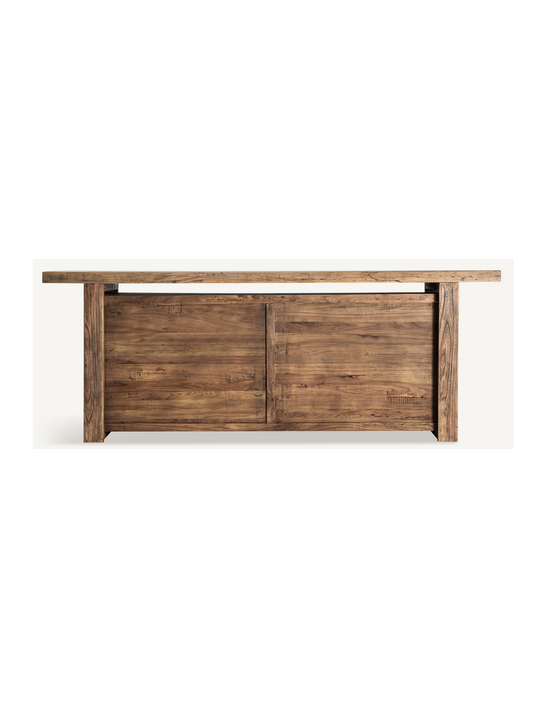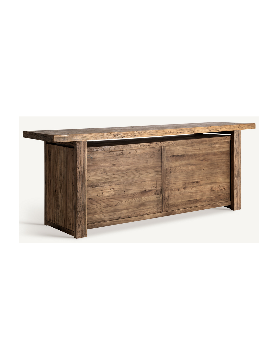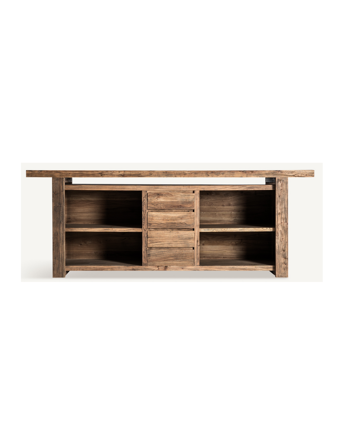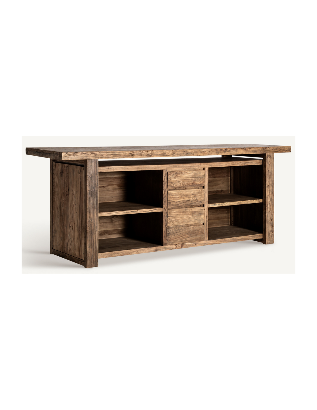 NORVIK Bardisk udført i et rustikt design, fremstillet af rustikt genanvendt brunt elmetræ. Bardisken måler 280 cm i bredden og 75 cm i dybden og indeholder 4 skuffer og 4 åbne hylderum.