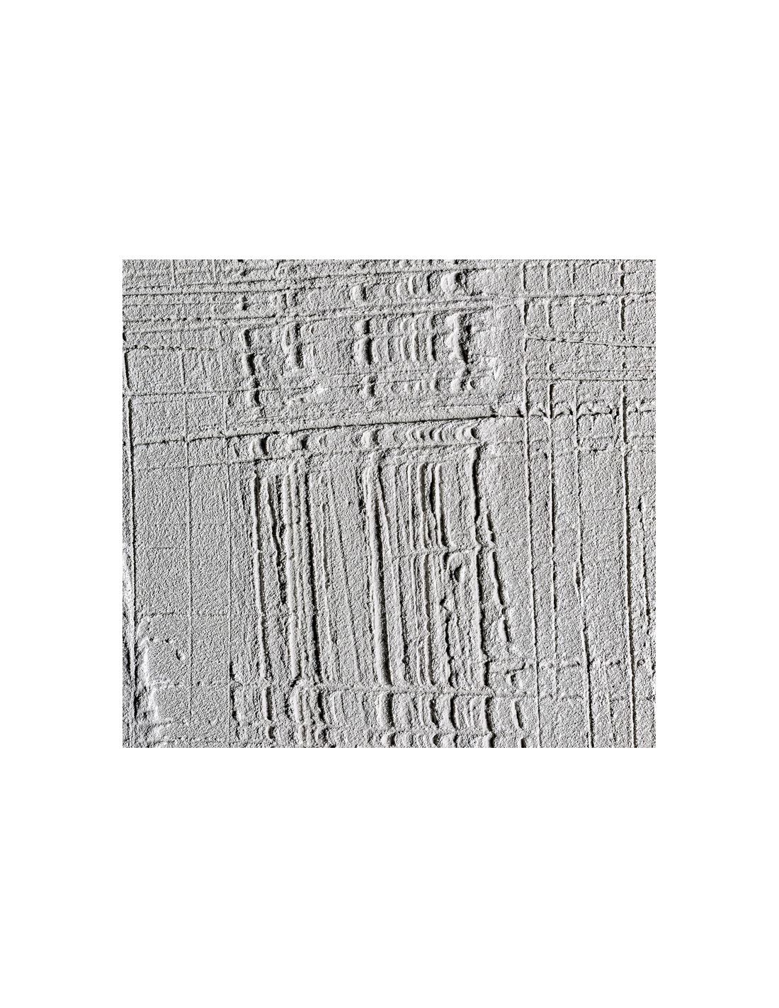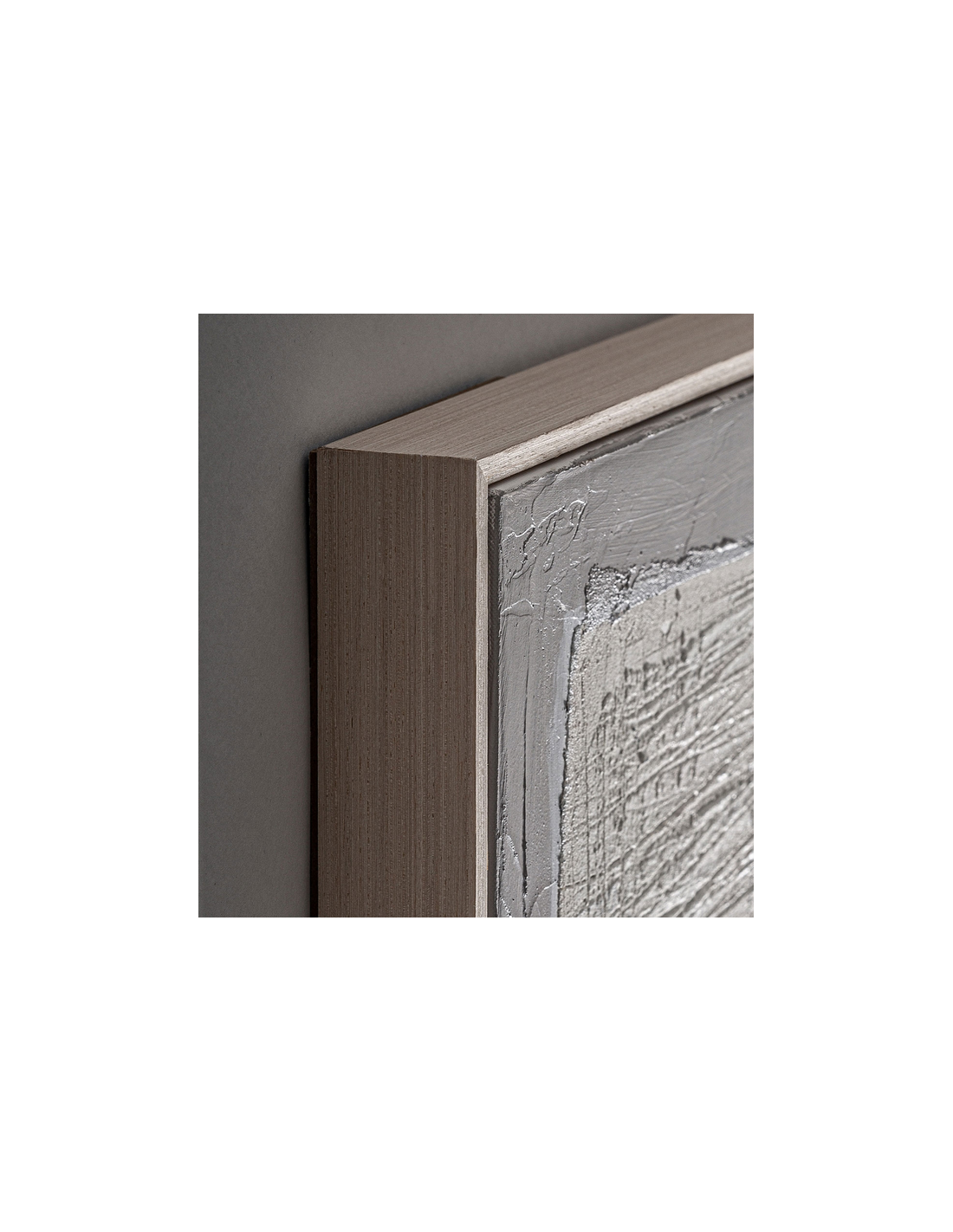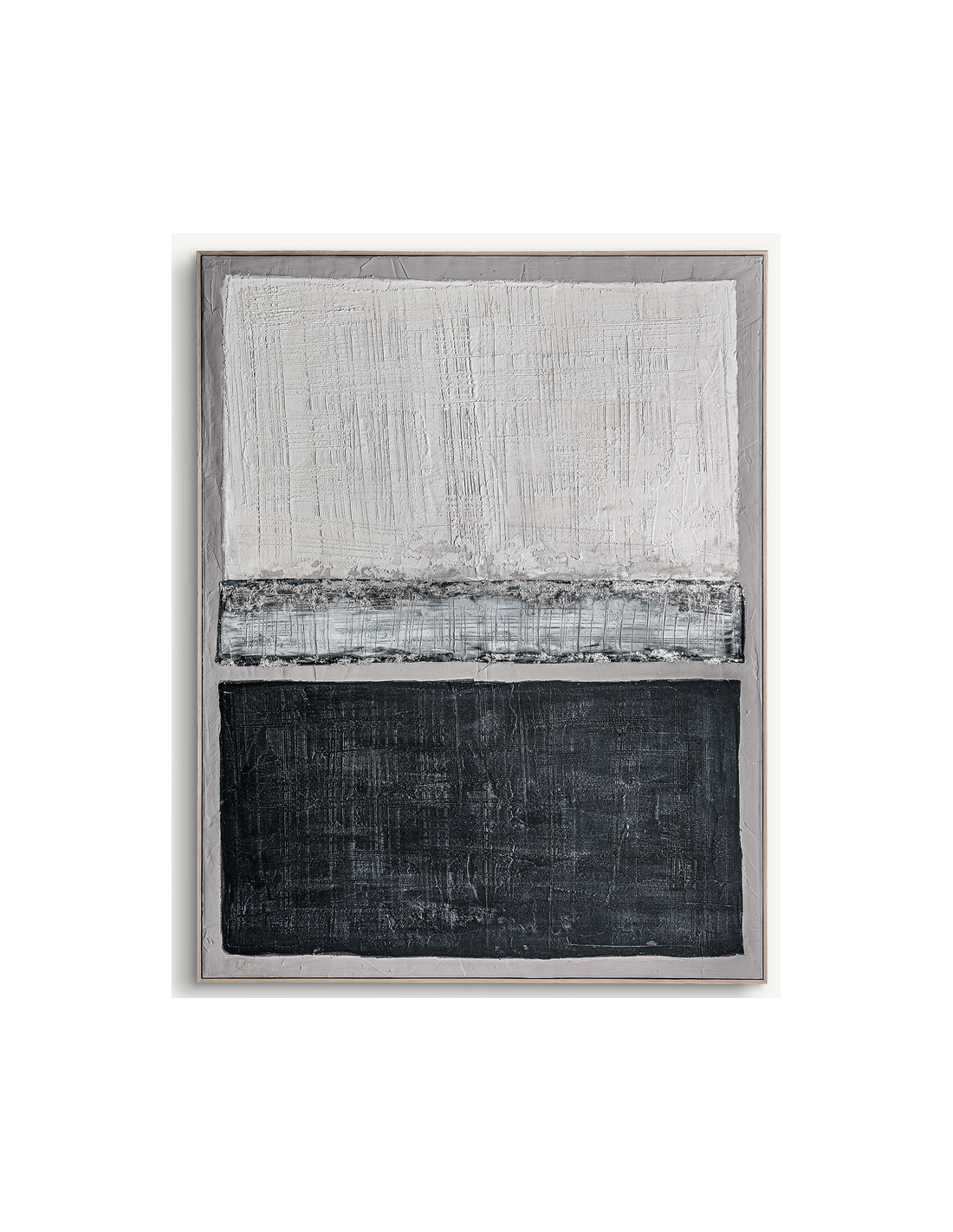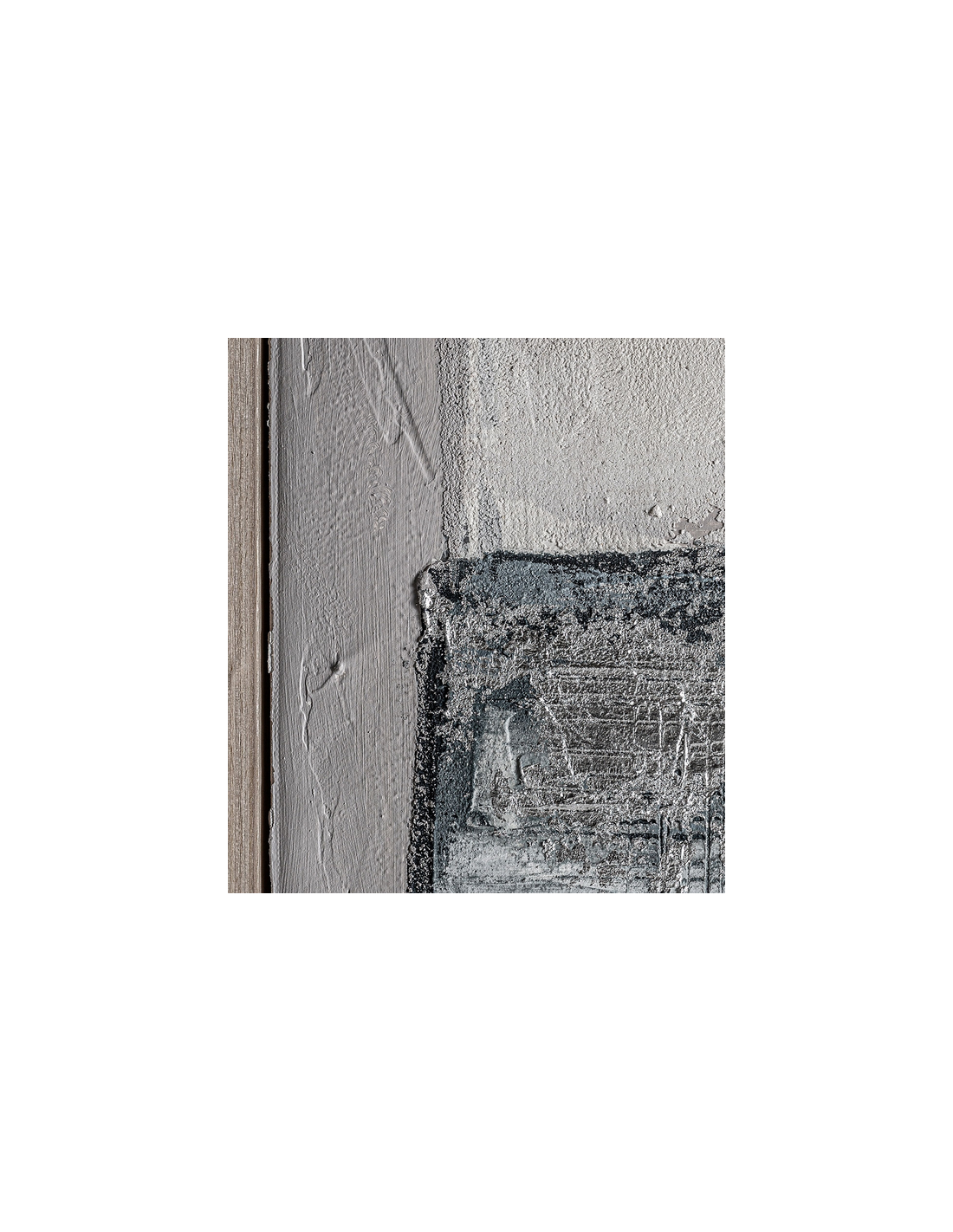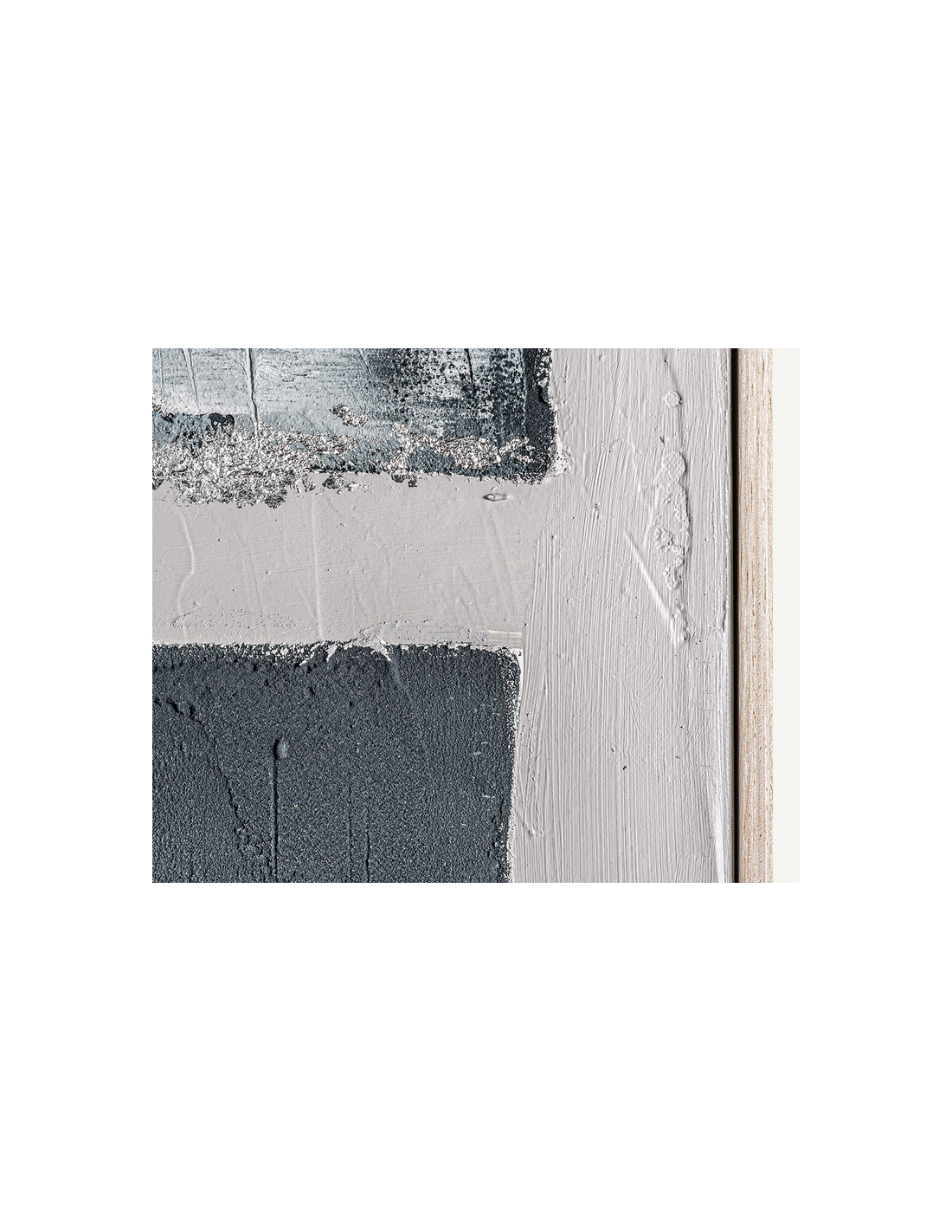 BERCHER Abstrakt billede med ramme udført i rustikt lysebrun fyrretræ og med motiv i canvas og tekstil i gråblå nuancer. Billedet måler 180 cm i højden og 140 x 5 cm i bredde og dybde.