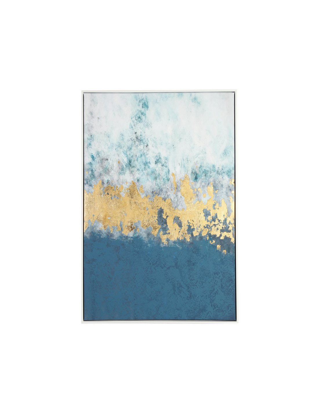 Abstrakt billede med ramme udført i et design af hvidlakeret MDF og med motiv i canvas i blålige nuancer. Billedet måler 122,6 cm i højden og 82,6 x 4,3 cm i bredde og dybde.