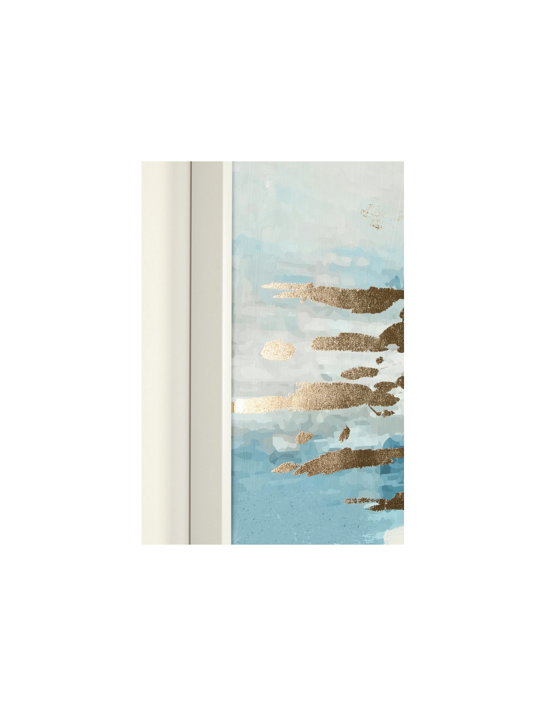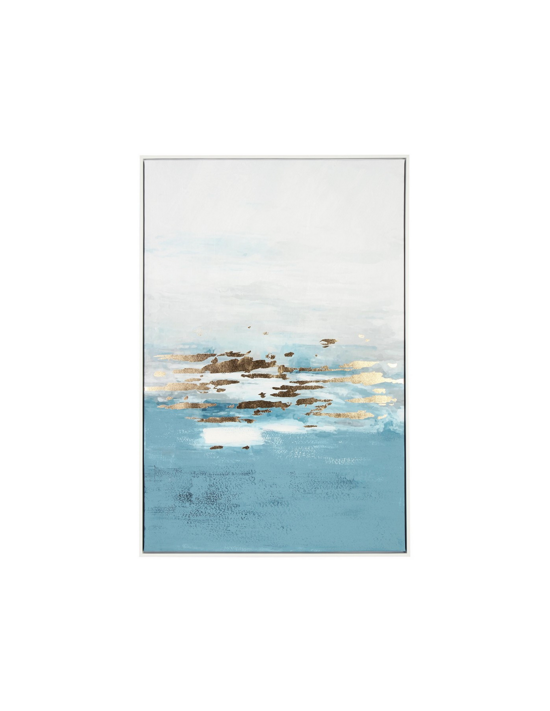 Abstrakt billede med ramme udført i et design af hvidlakeret MDF og med motiv i canvas i blålige nuancer. Billedet måler 122,6 cm i højden og 82,6 x 4,3 cm i bredde og dybde.
