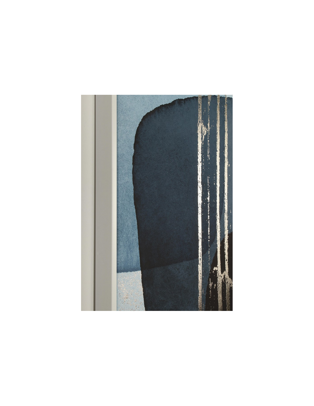 Abstrakt billede med ramme udført i et design af hvidlakeret MDF og med motiv i canvas i blålige nuancer. Billedet måler 122,6 cm i højden og 82,6 x 4,3 cm i bredde og dybde.