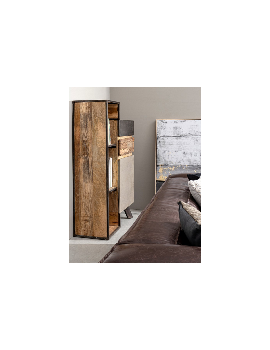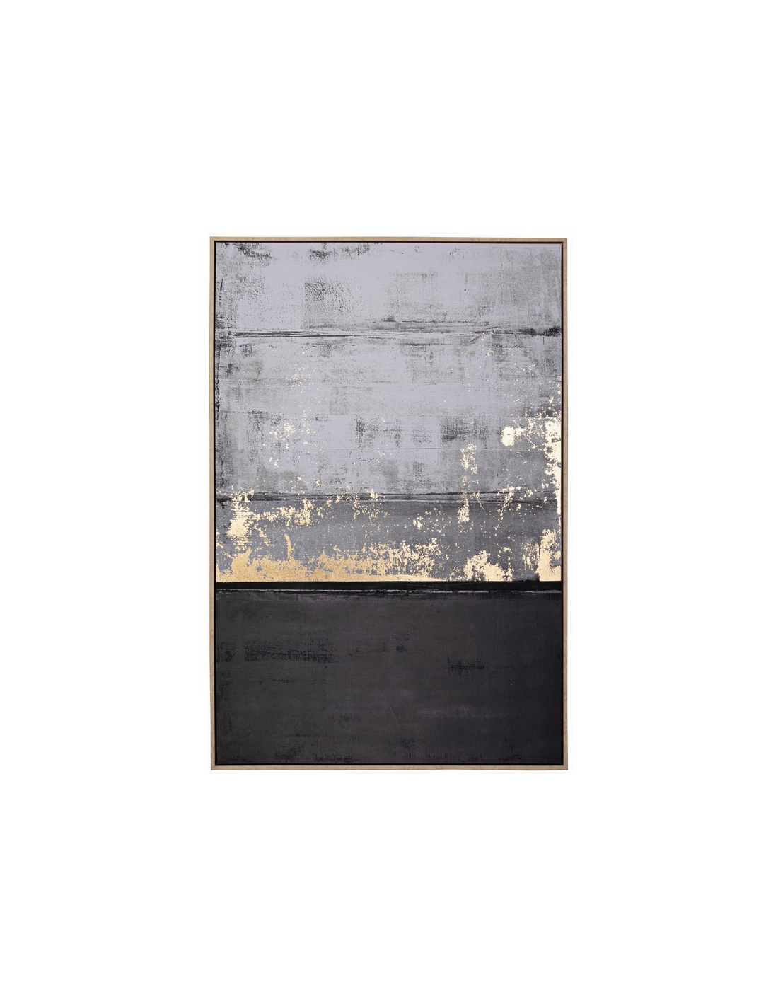 Olie maleri med ramme udført i et design af lys naturfarvet MDF og med motiv i canvas i mørke nuancer. Maleriet måler 122,6 cm i højden og 82,6 x 4,3 cm i bredde og dybde.