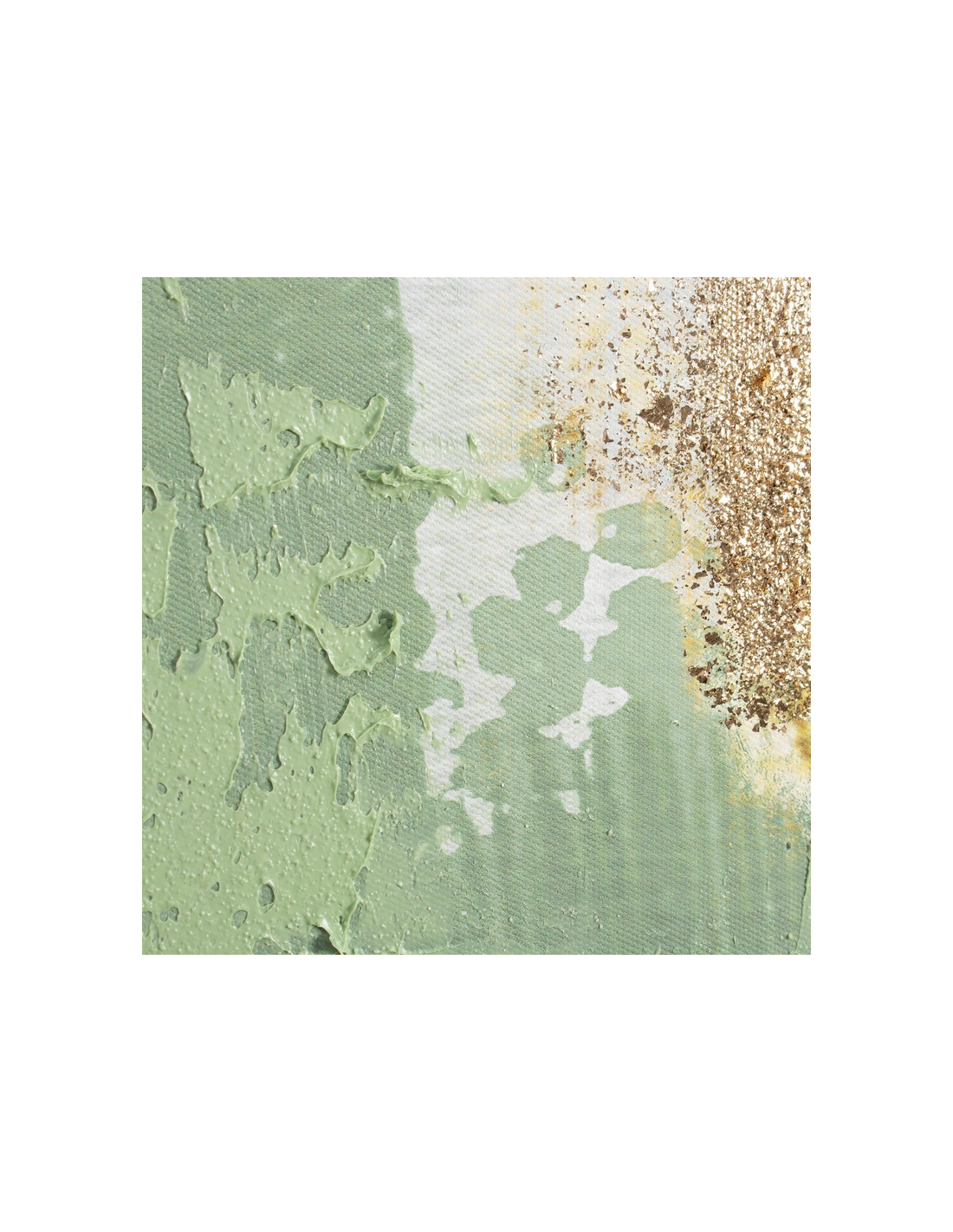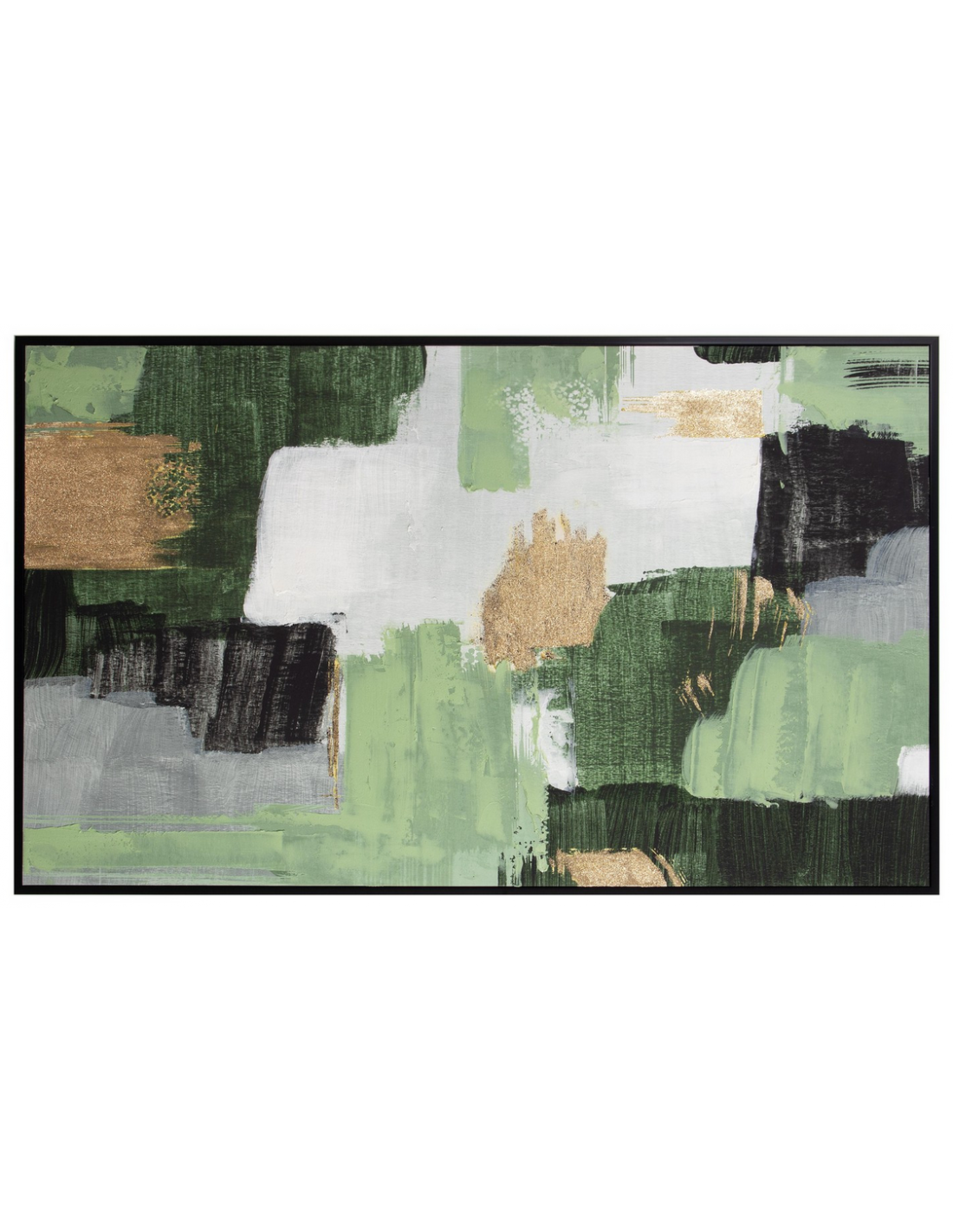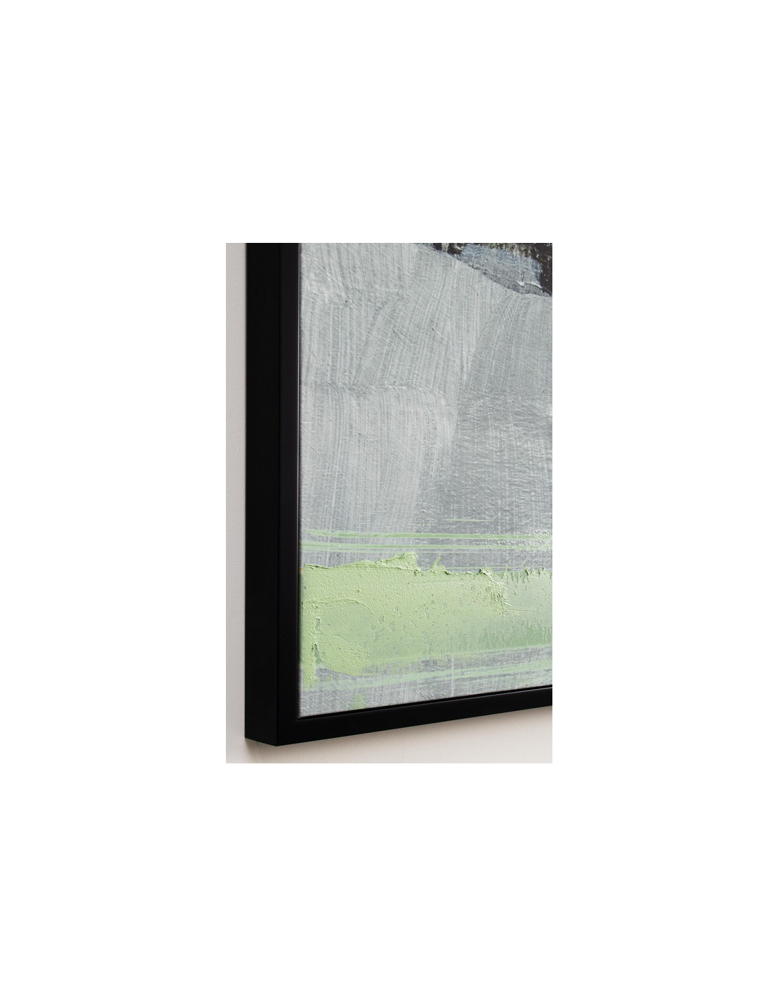 Abstrakt print med ramme udført i et design af sortlakeret MDF og med motiv i canvas i grønlige nuancer. Billedet måler 124 cm i højden og 204 x 5 cm i bredde og dybde.