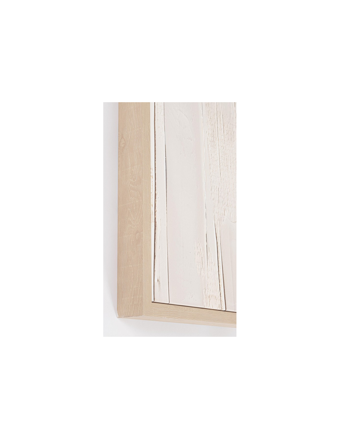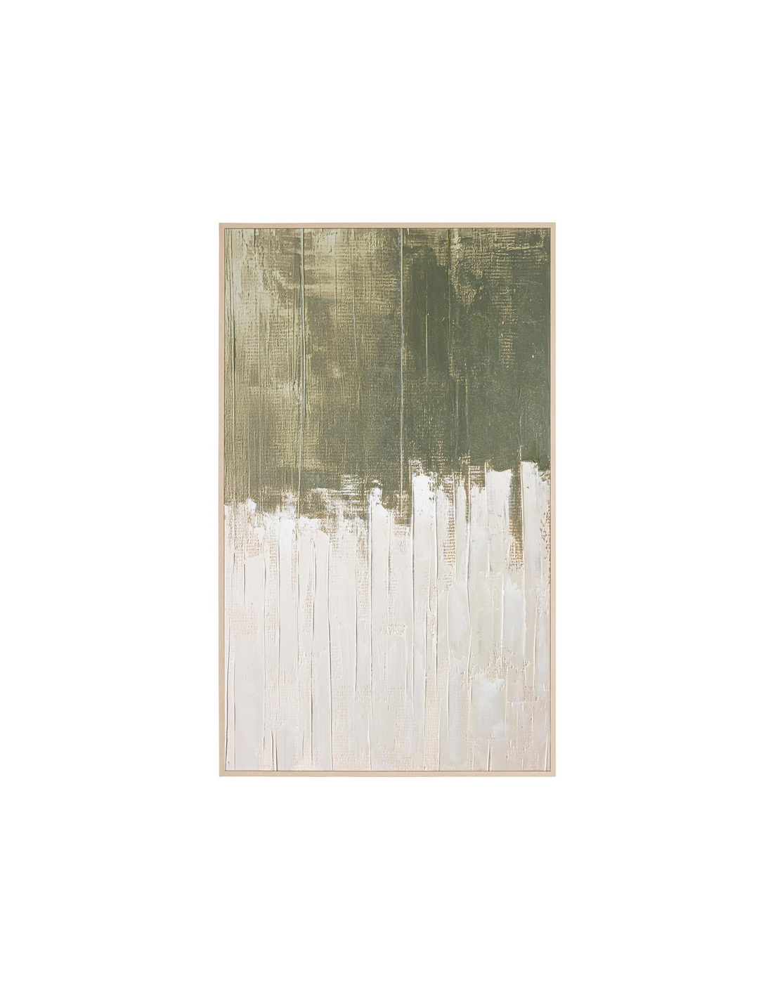 Abstrakt print med ramme udført i et design af lys naturfarvet fyrretræ og med motiv i canvas i grønlige nuancer. Billedet måler 204 cm i højden og 124 x 5 cm i bredde og dybde.