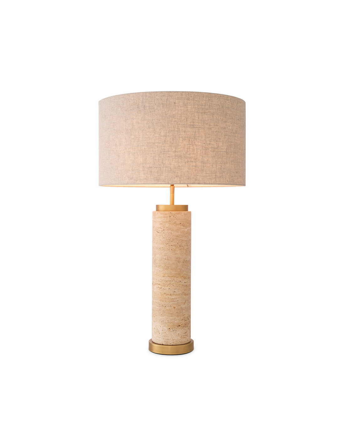 Eichholtz Lxry bordlampe udført i et design af antik messinglakeret stål, travertin og naturbrun polyester. Bordlampen måler 75 cm i højden og 45 cm i diameter og anvender 1 x E27 lyskilde (Ekskl.).