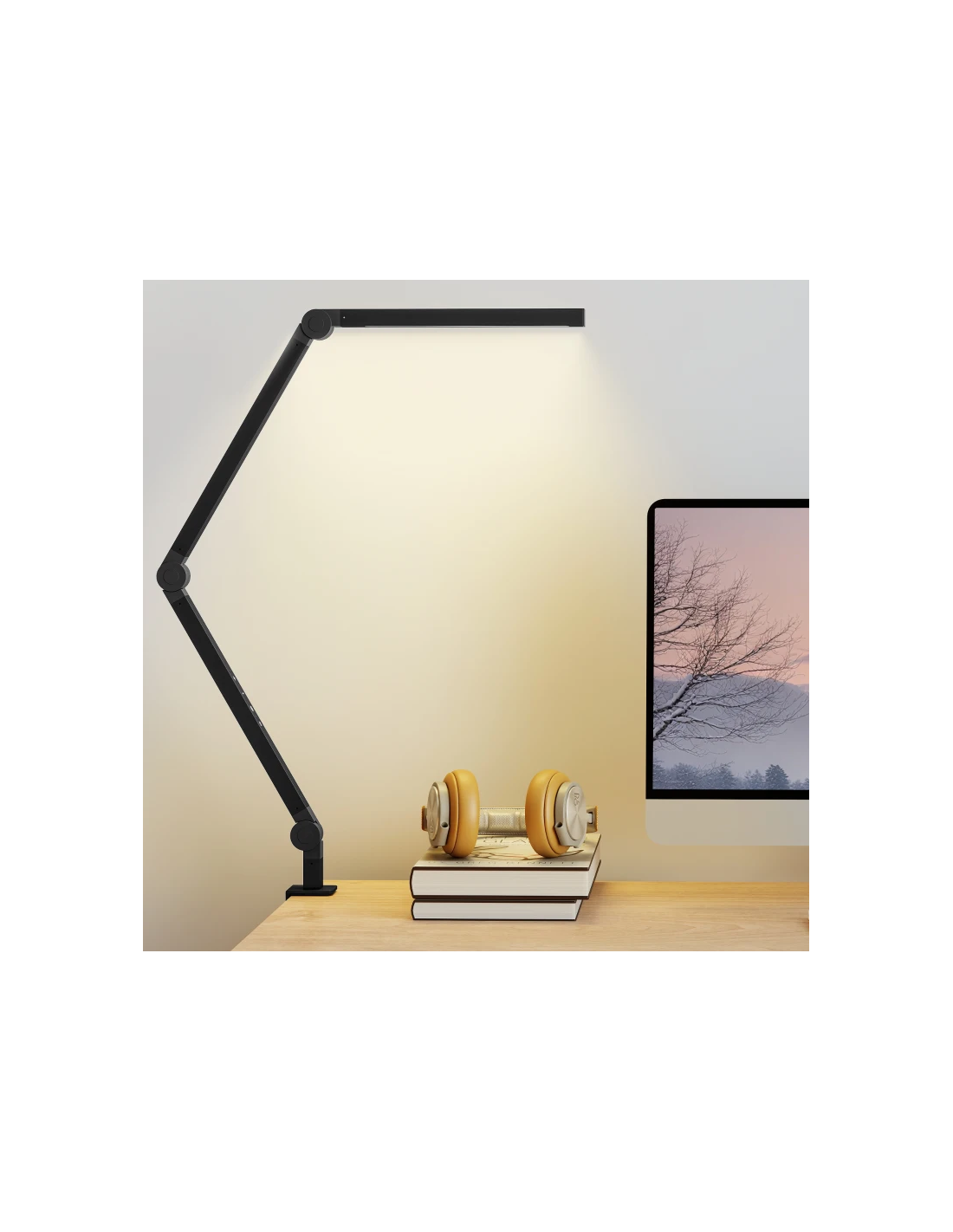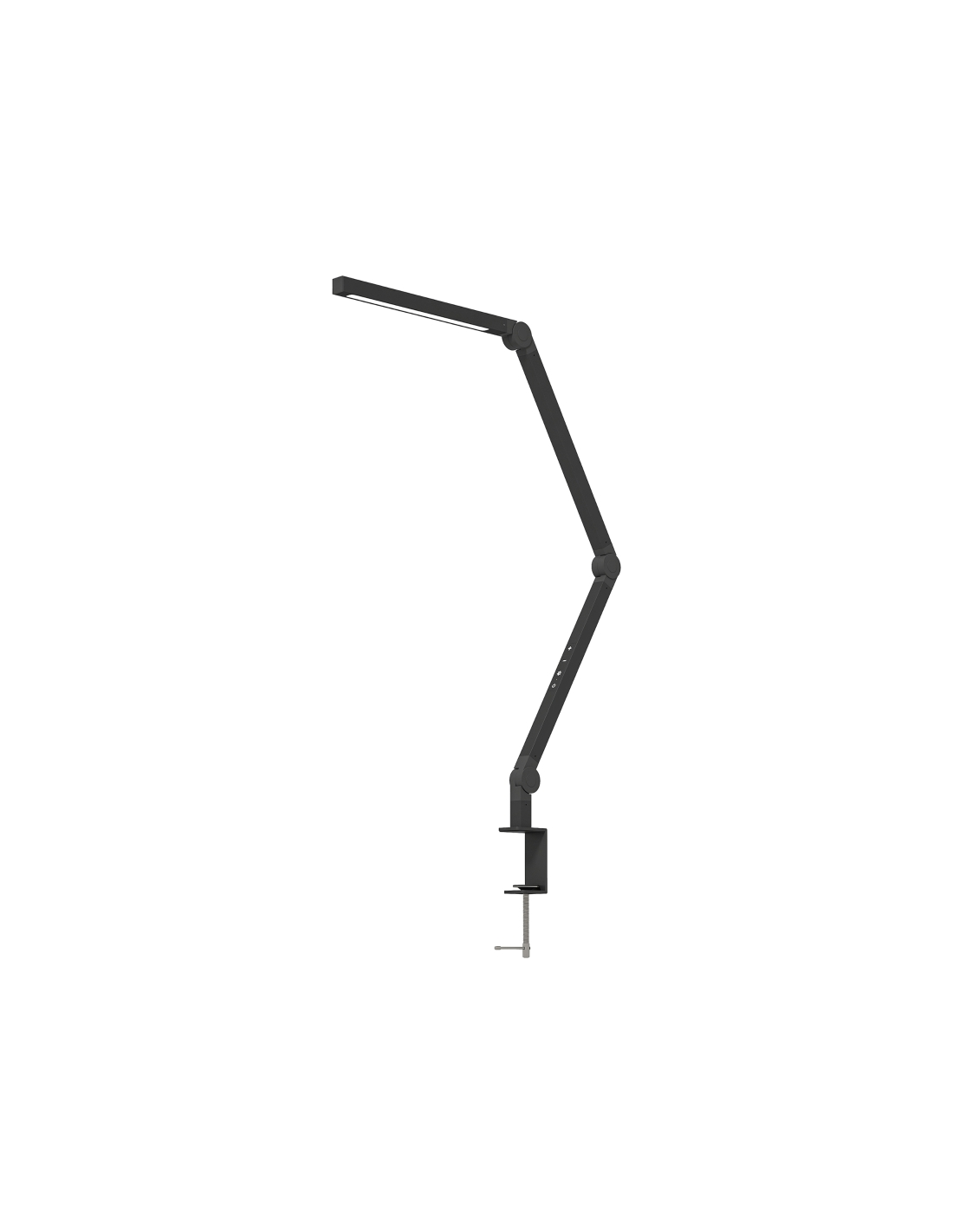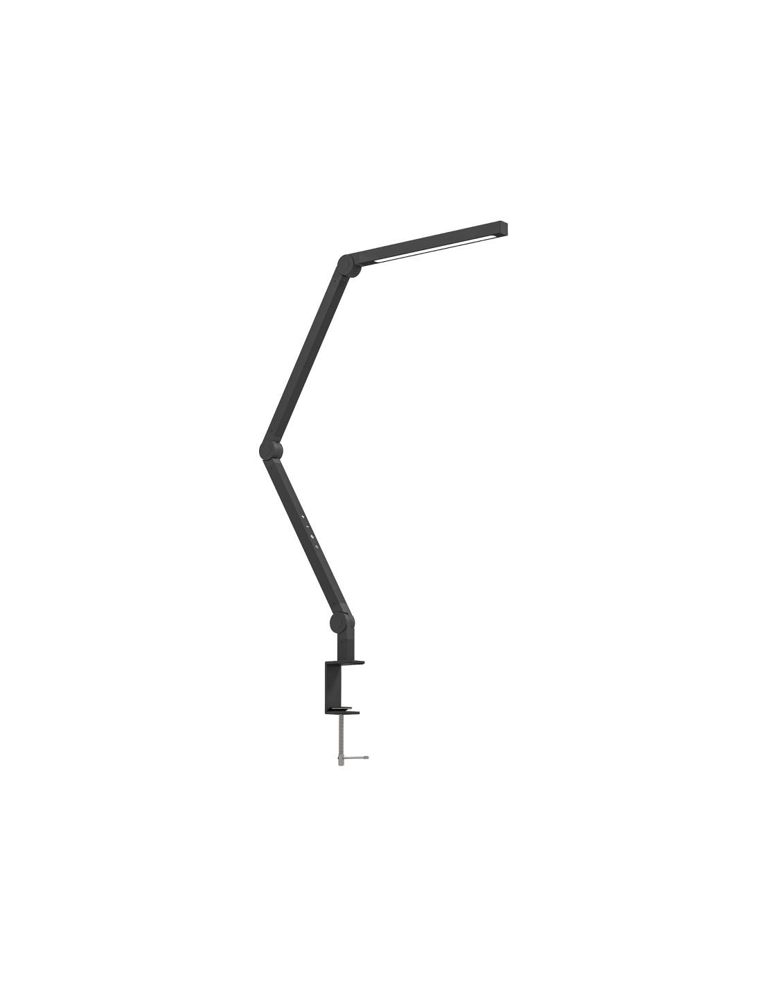 Skrivebordslampe med flexarm udført i et moderne design fremstillet i sortlakeret aluminium og klart kunststof. Lampen måler op til 121,5 cm i højden og anvender 1 x 12W LED lyskilde (Inkl.). Lampen har bordklemme, således den kan monteres på bordplader og lignende.