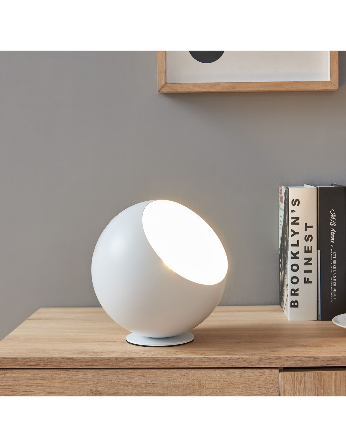 Bordlampe udført i et moderne design af hvidlakeret metal. Bordlampen måler 20 cm i højden og med ledningslængde på 180 cm.