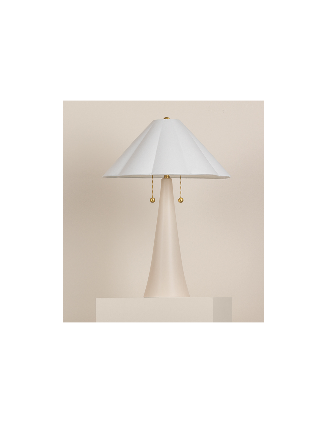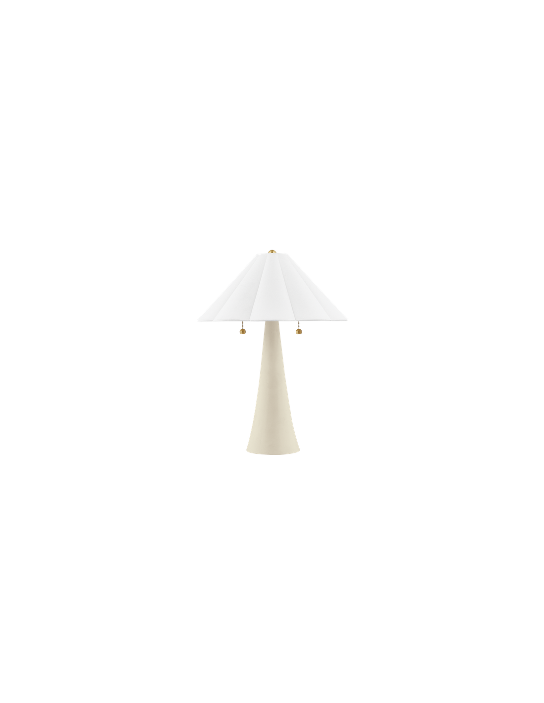 ALANA Bordlampe udført i et design af elfenbenshvid keramik, antik messinglakeret og hvidt linned. Bordlampen måler 59,7 cm i højden og 43,2 cm i diameter og anvender 2 x E27 lyskilder (Ekskl.). Lampen tændes og slukkes via træksnore under skærmen.