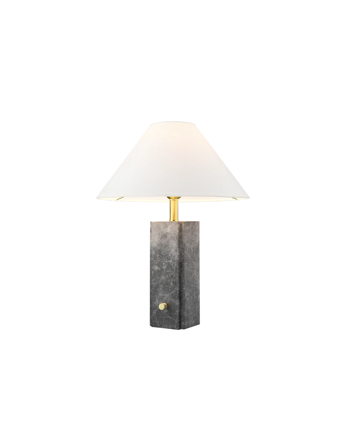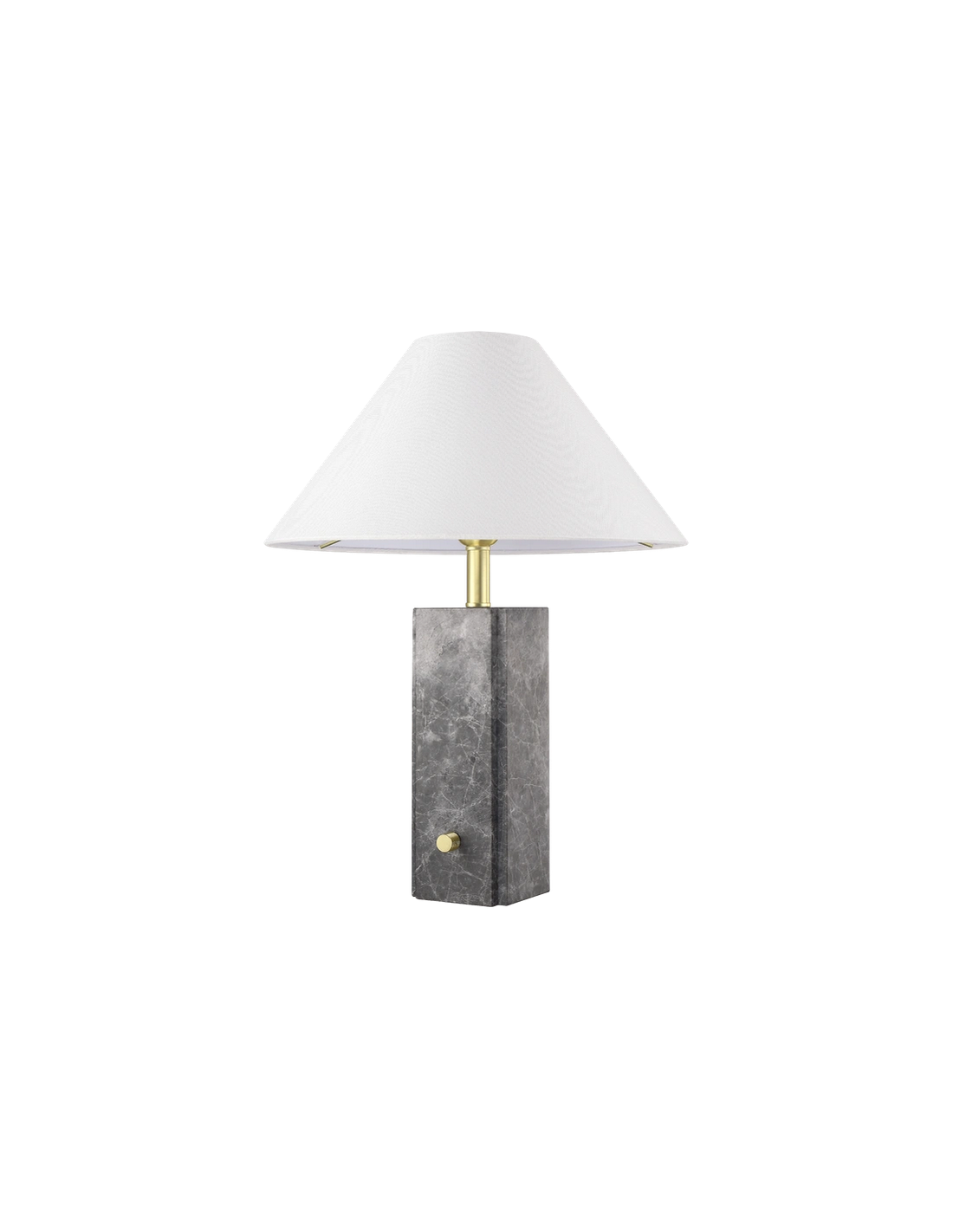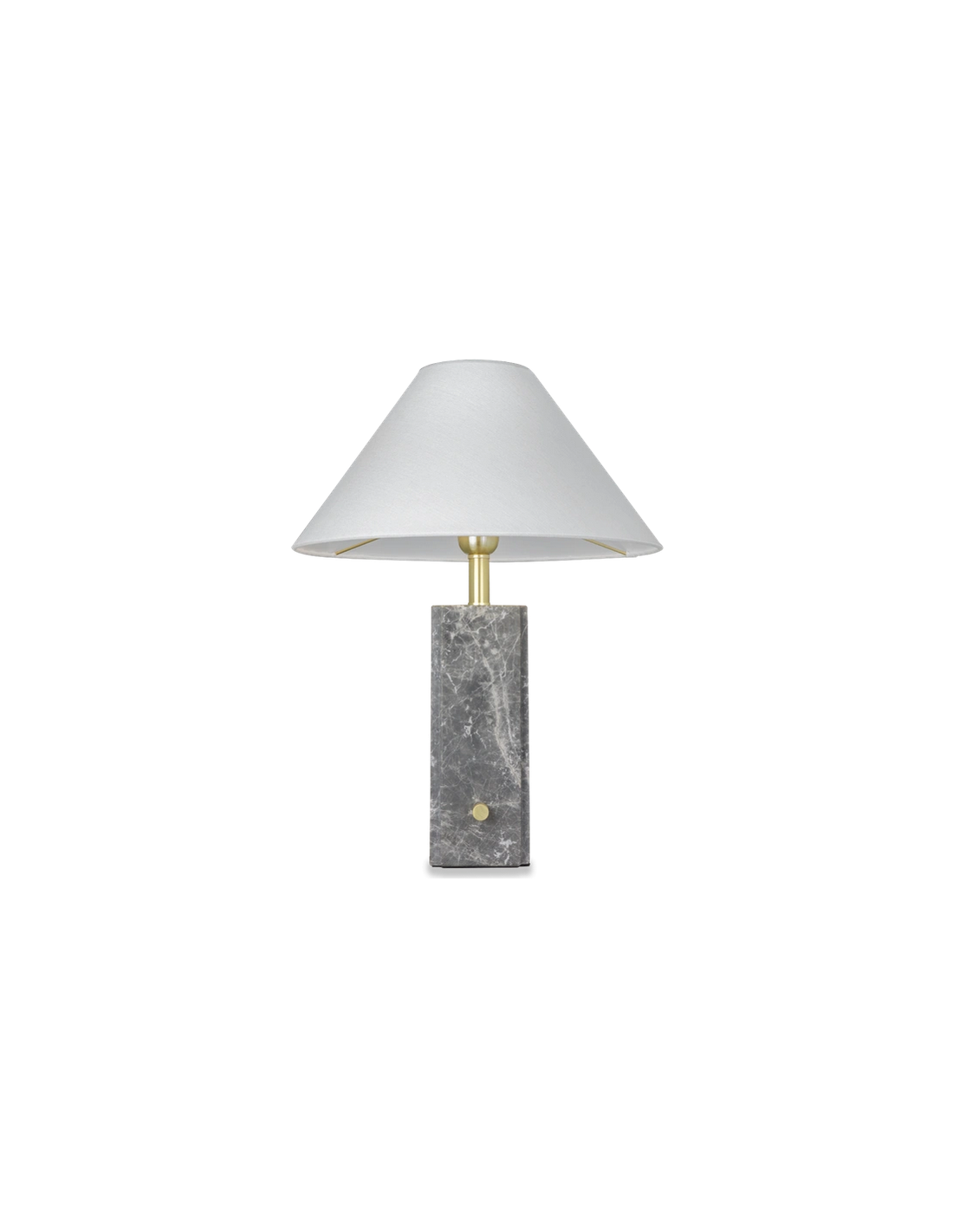 ORLEANS Bordlampe fremstillet i et design af grå marmor og børstet messinglakeret stål og med skærm i hvid polyester. Lampen måler 50 cm i højden og leveres til europæisk standard til 1 x E27 lyskilde. Lampen har afbryder direkte på lampefoden.