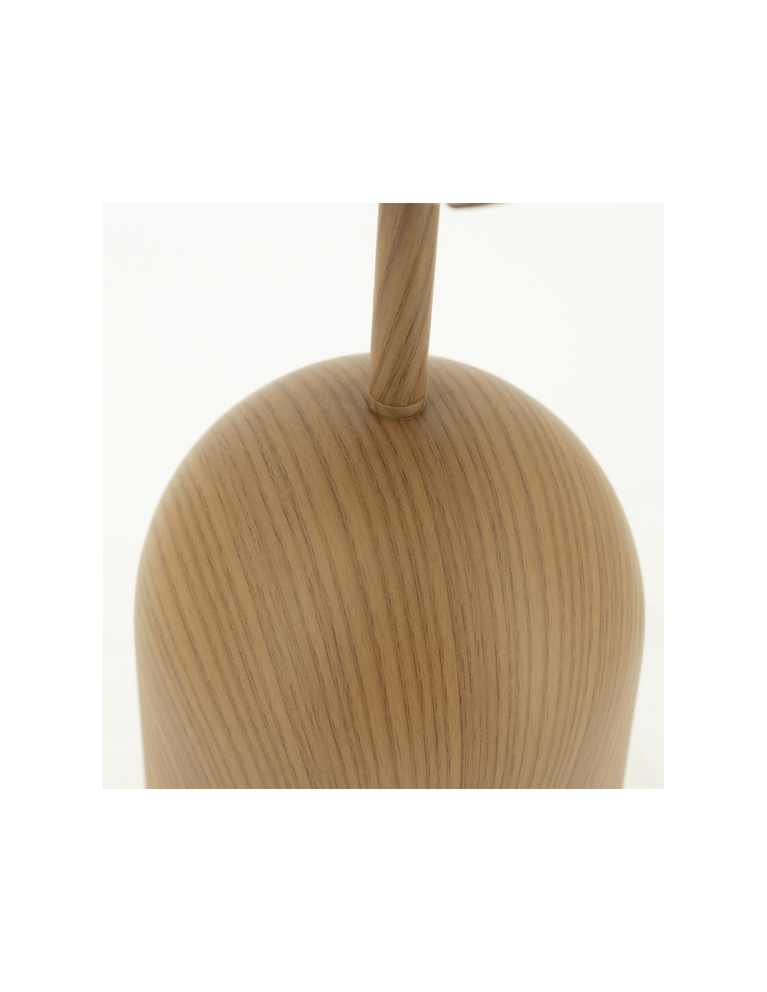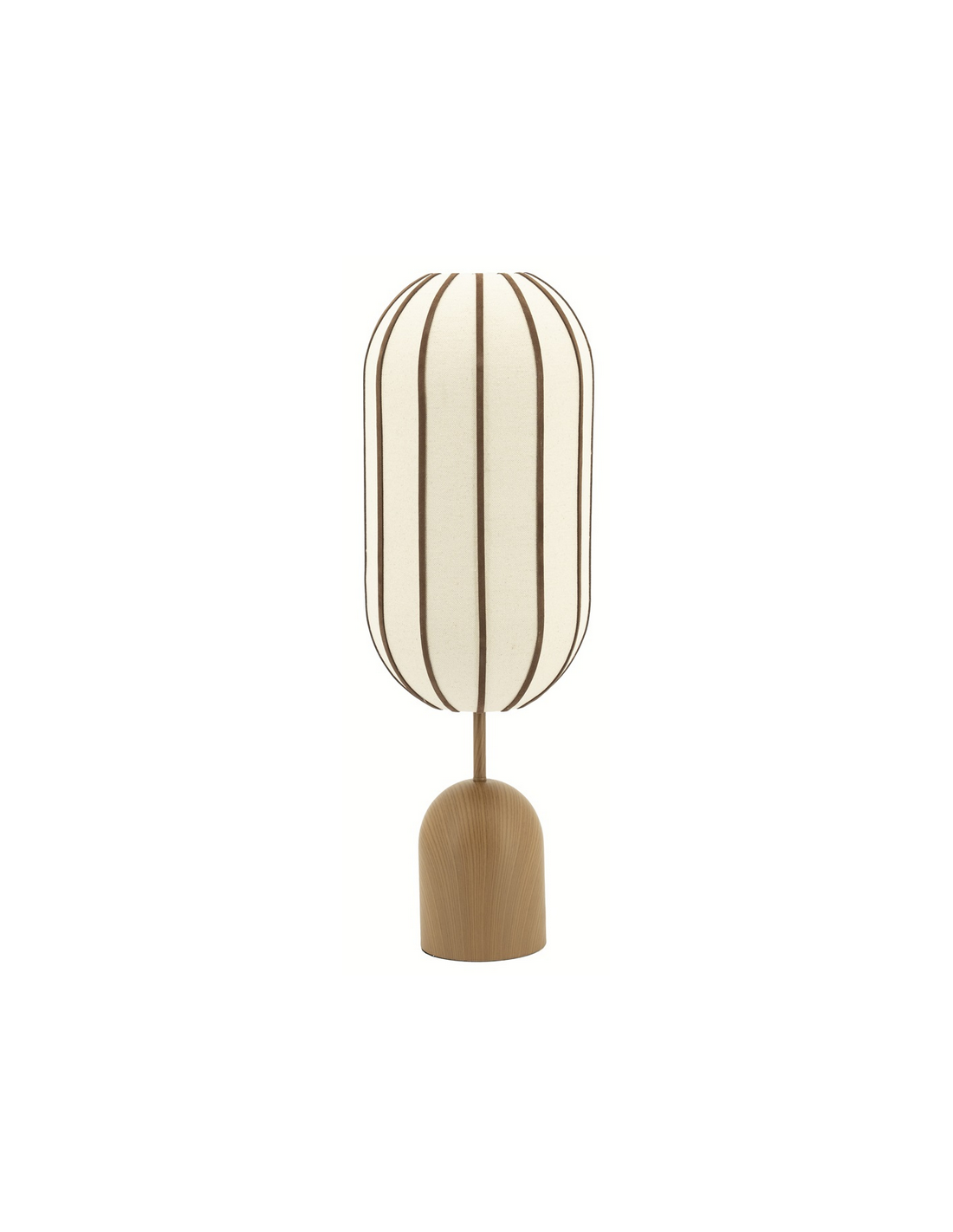 Bordlampe fremstillet i et moderne og alligevel retropræget design af folieret jern i brunt trælook med skærm i naturfarvet linned med brune læderstropper. Bordlampen måler 79,5 cm i højden og 27 cm i skærmdiameter og anvender 1 x E27 lyskilde (Ekskl.). Lampen kommer med 160 cm ledning med arbryder.