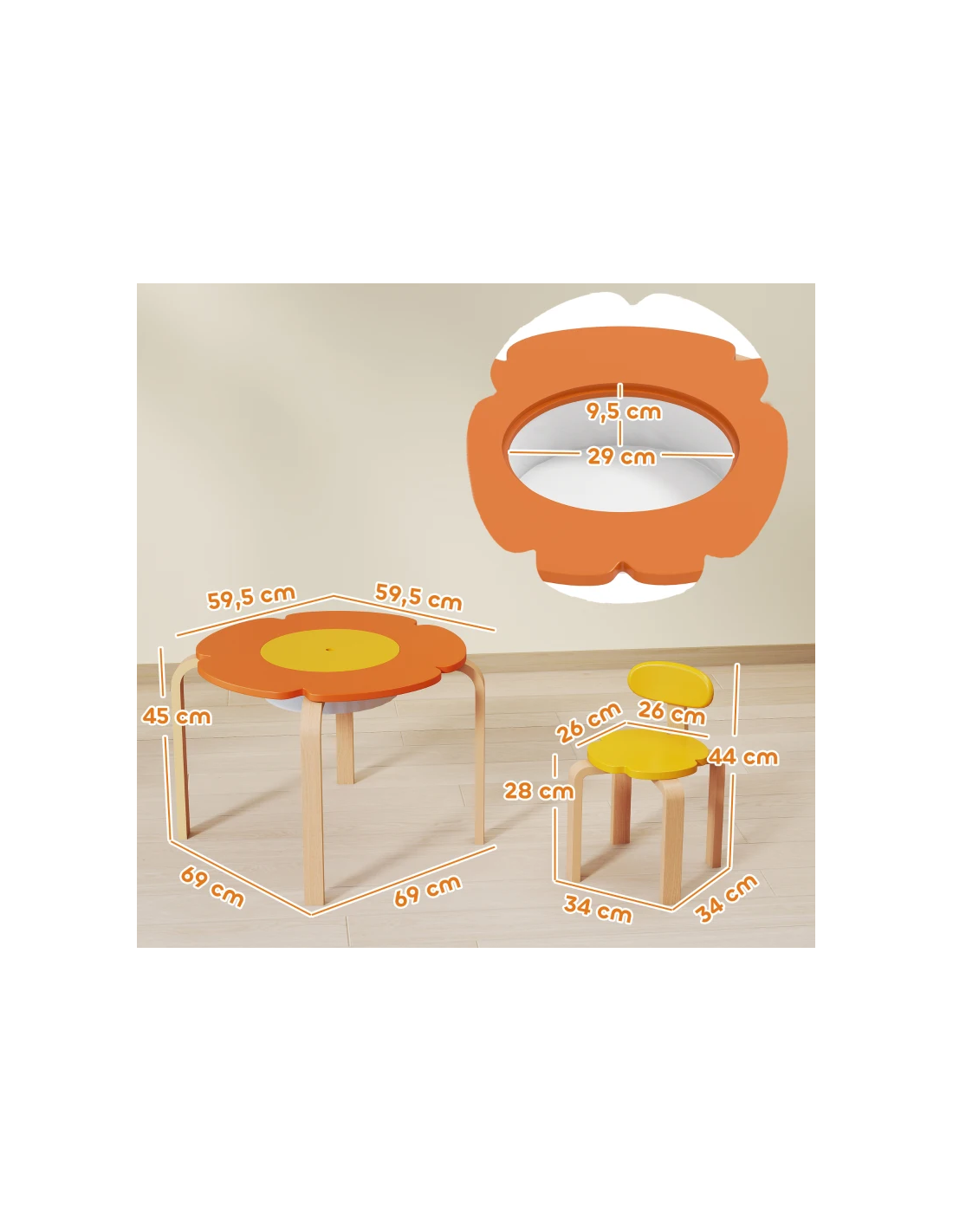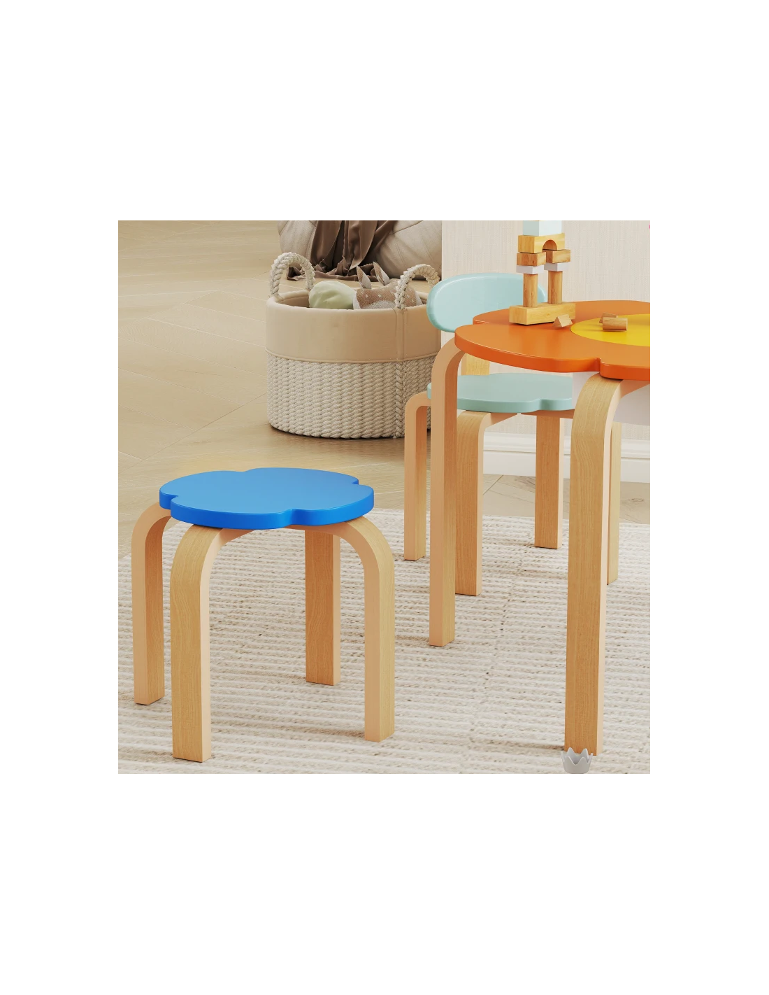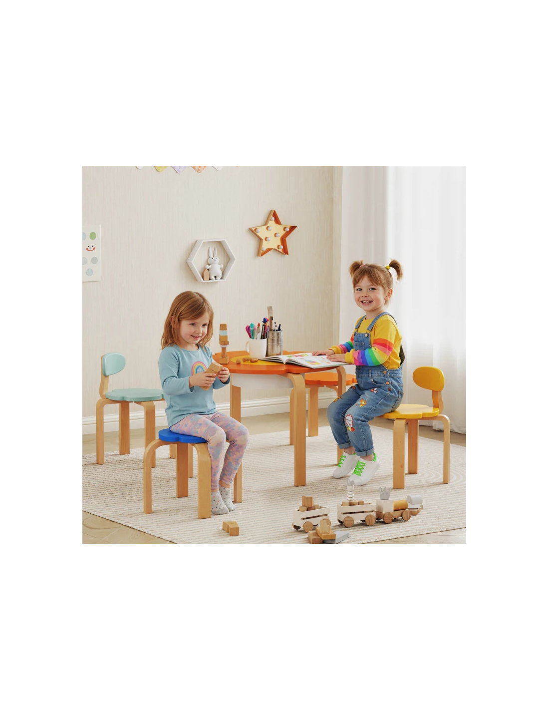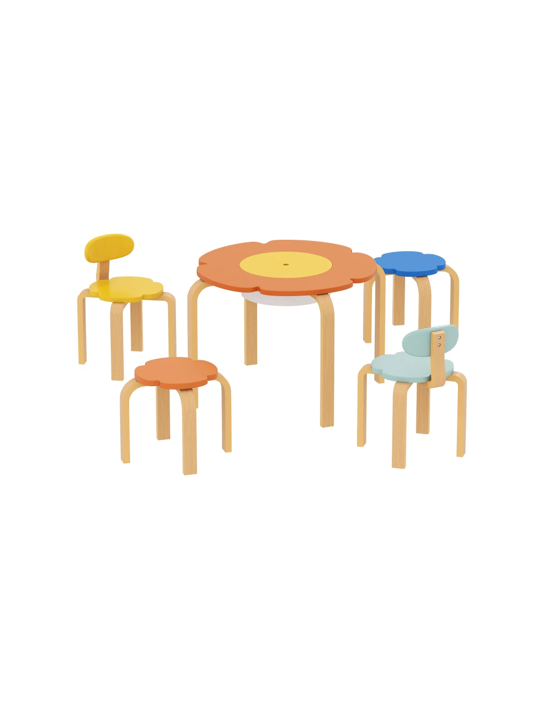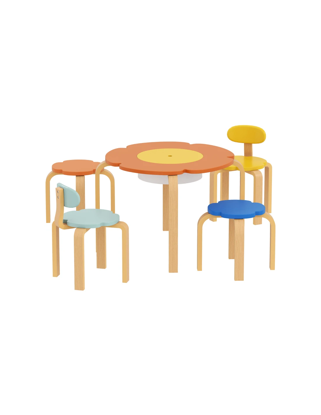 Bord og stolesæt udført i et solidt og børnevenligt design af natur- og multifarvet birketræ og finér. Sættet er med 2 stole, 2 skamler og 1 bord, og passer til børn i alderen 4+ år. Bordet måler 45 cm i højden og 69 cm i diameter. Stolene måler 44 cm i højden over ryggen med en siddehøjde på 28 cm. Hertil en bredde på 34 cm og dybde på 34 cm. Siddemålene er 26 x 26 cm i bredde og dybde. Skamlerne måler 28 cm i højden og 34 x 34 cm i bredde og dybde med siddemål Ø26 cm.