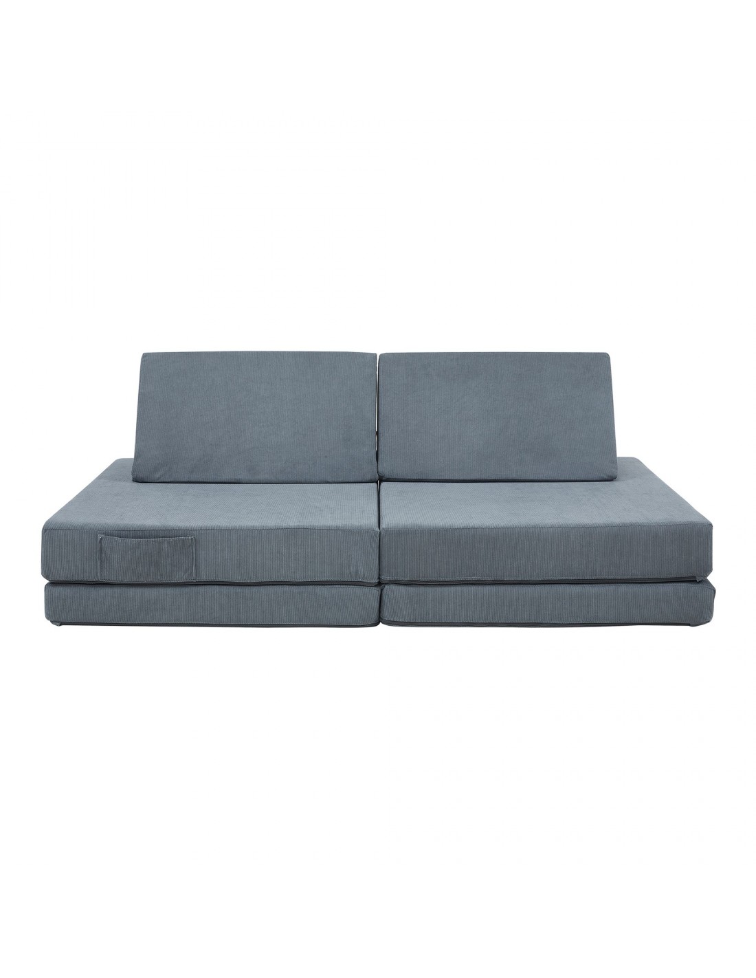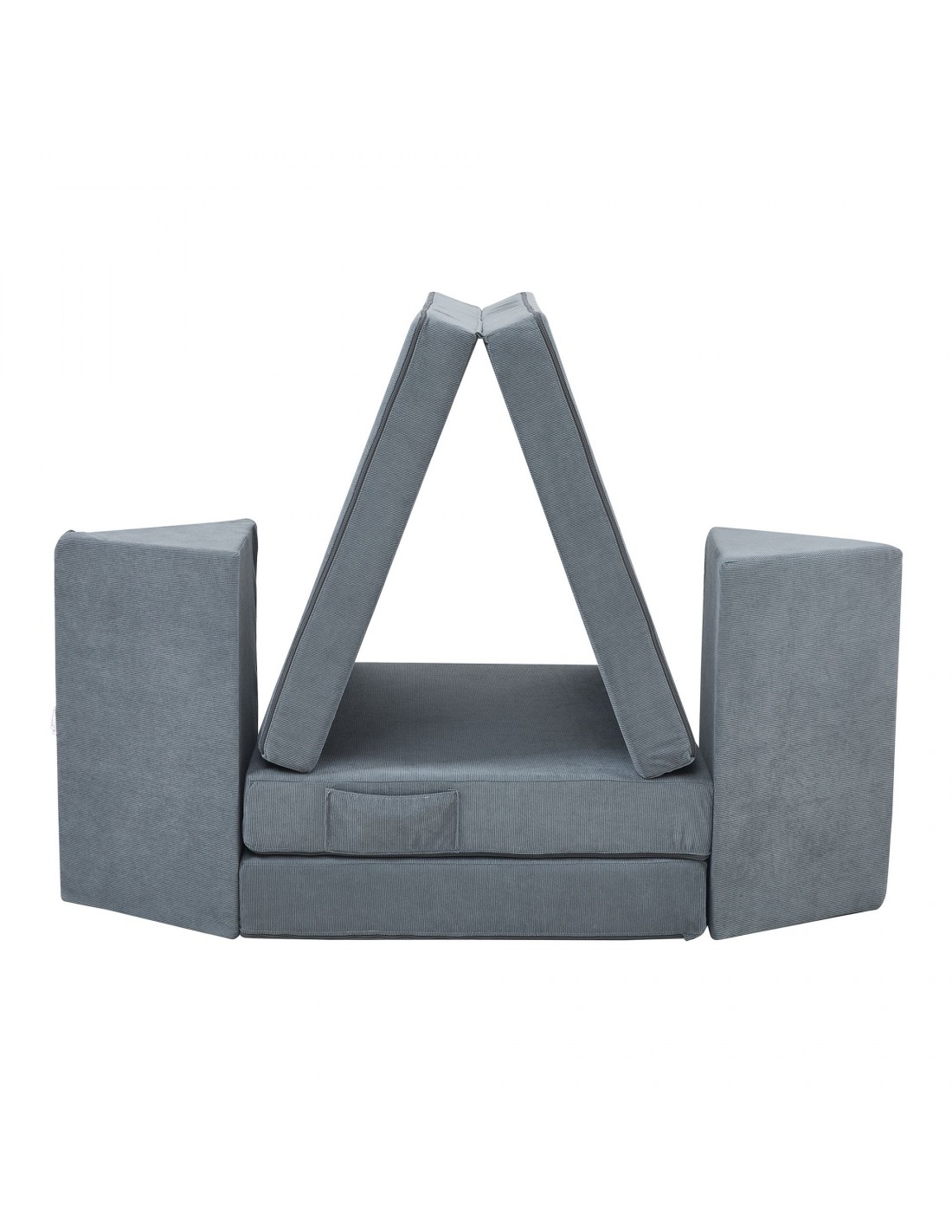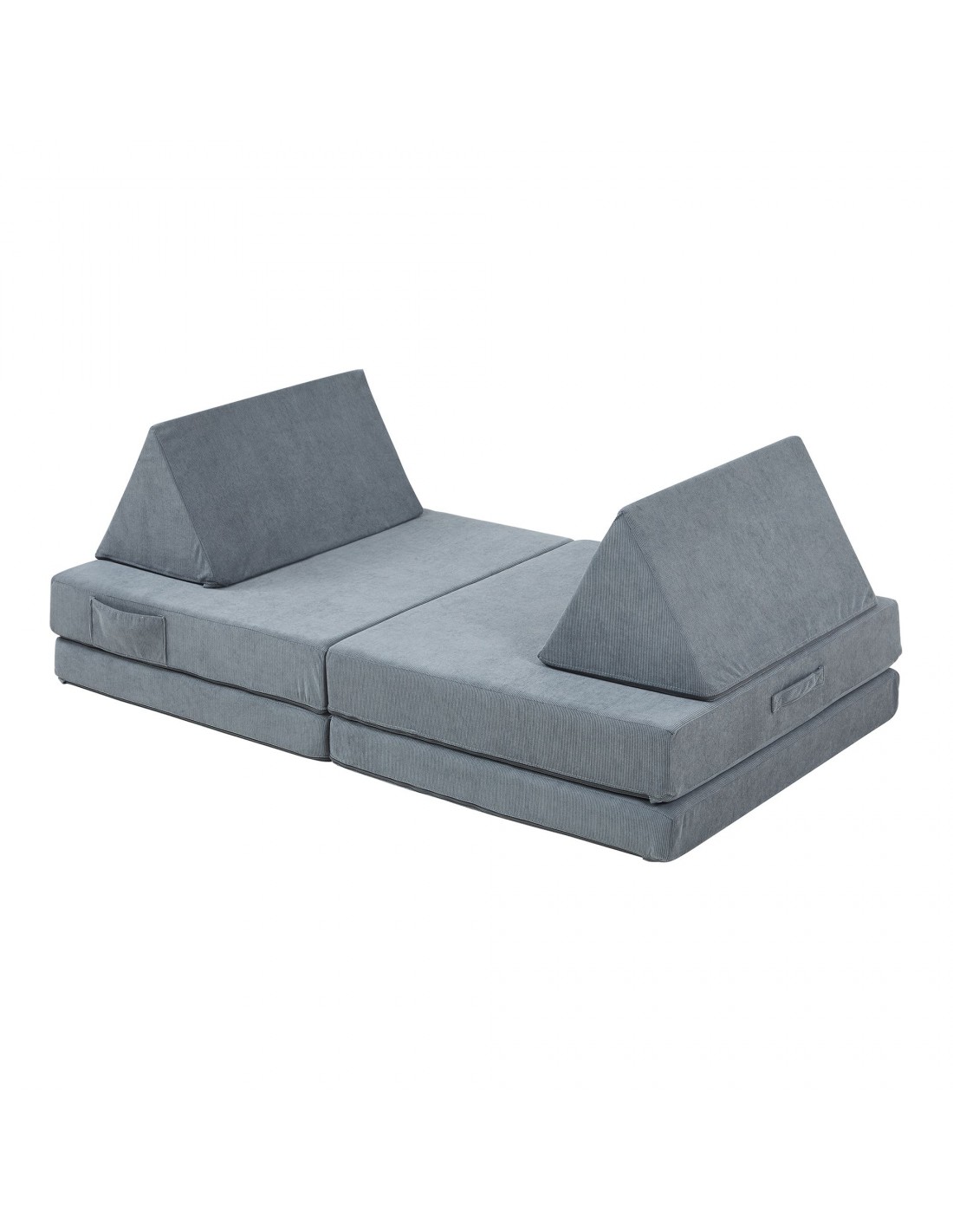 Tumle børnesofa udført i et design af grå corduroy polyester med skumfyld. Opsæt sofaen efter ønske, og lad børnene lege med de forskellige moduler. Opsættes sofaen som en sofa, så måler den 120 x 66 cm i bredde og dybde.
