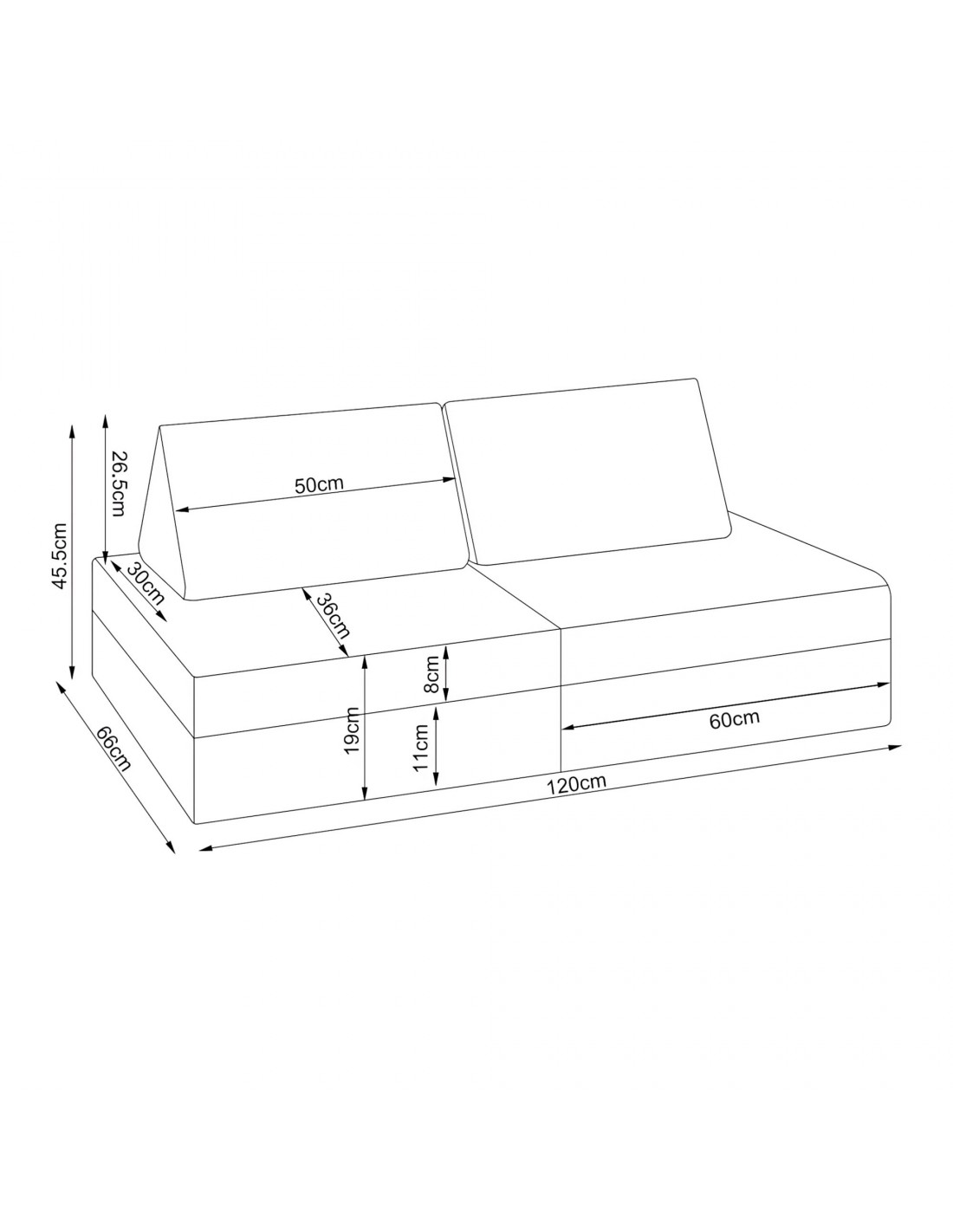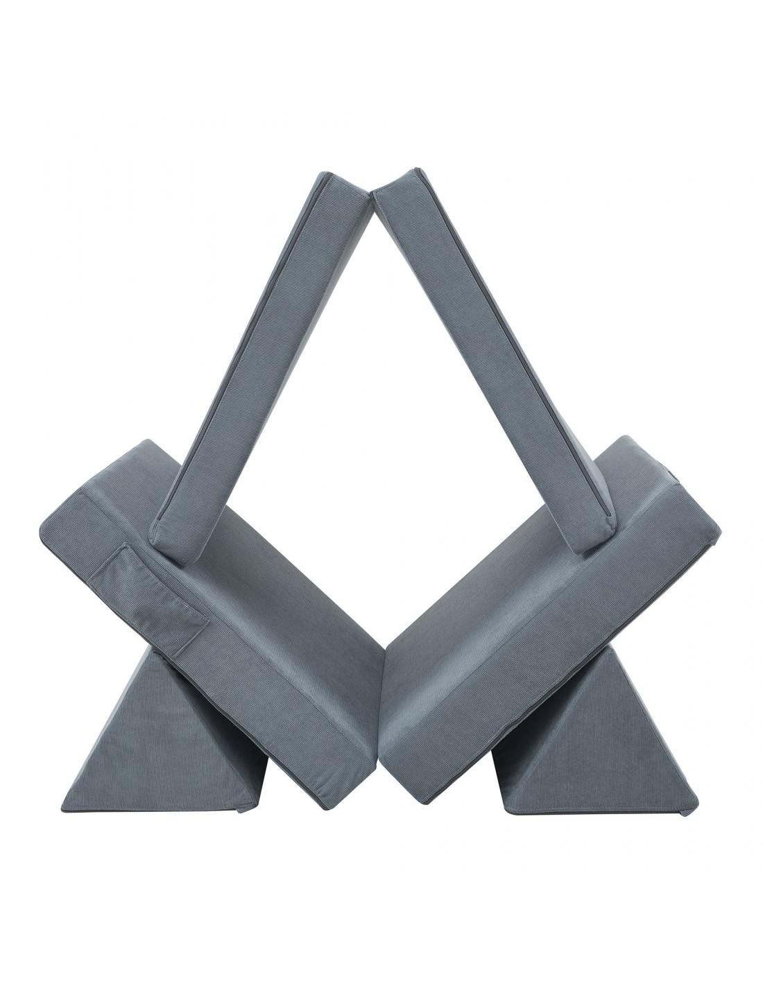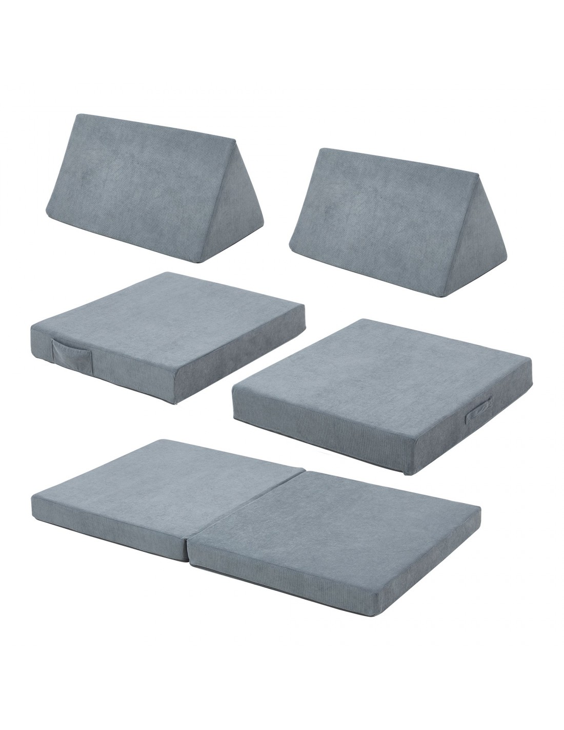 Tumle børnesofa udført i et design af grå corduroy polyester med skumfyld. Opsæt sofaen efter ønske, og lad børnene lege med de forskellige moduler. Opsættes sofaen som en sofa, så måler den 120 x 66 cm i bredde og dybde.
