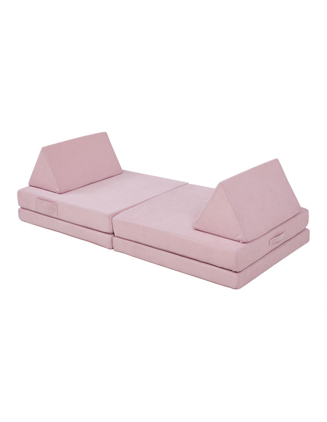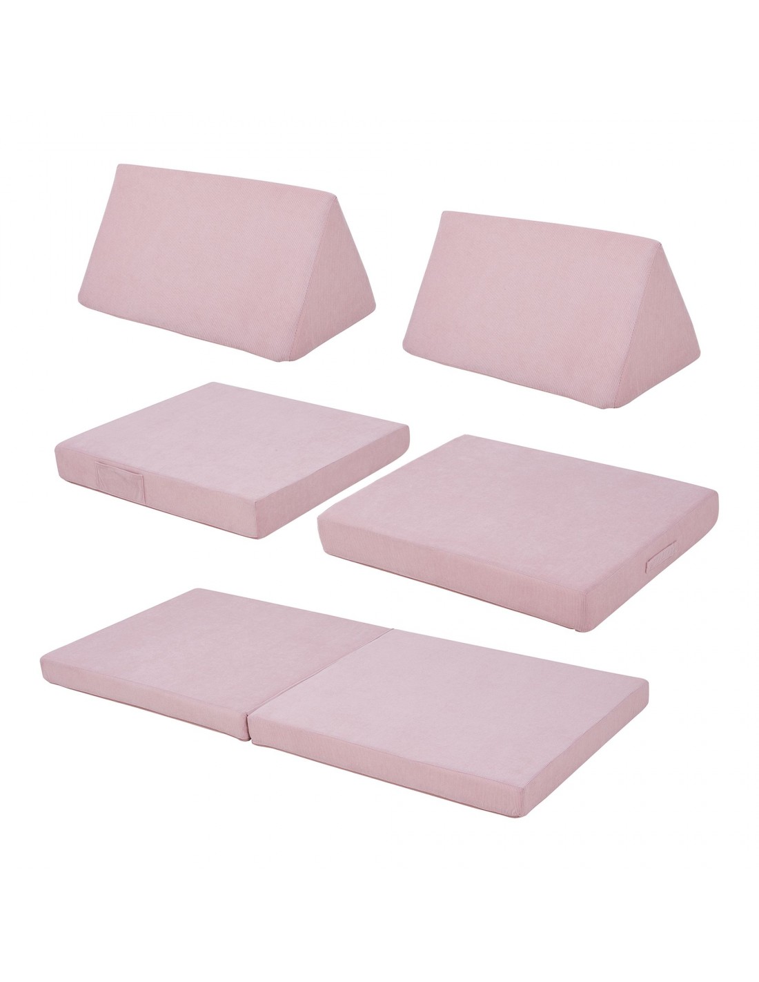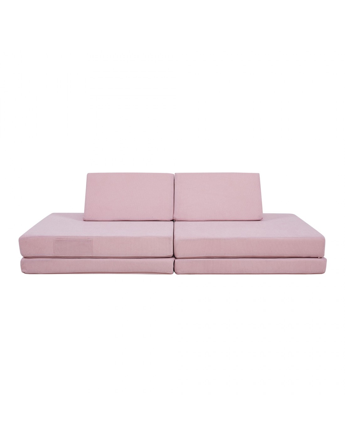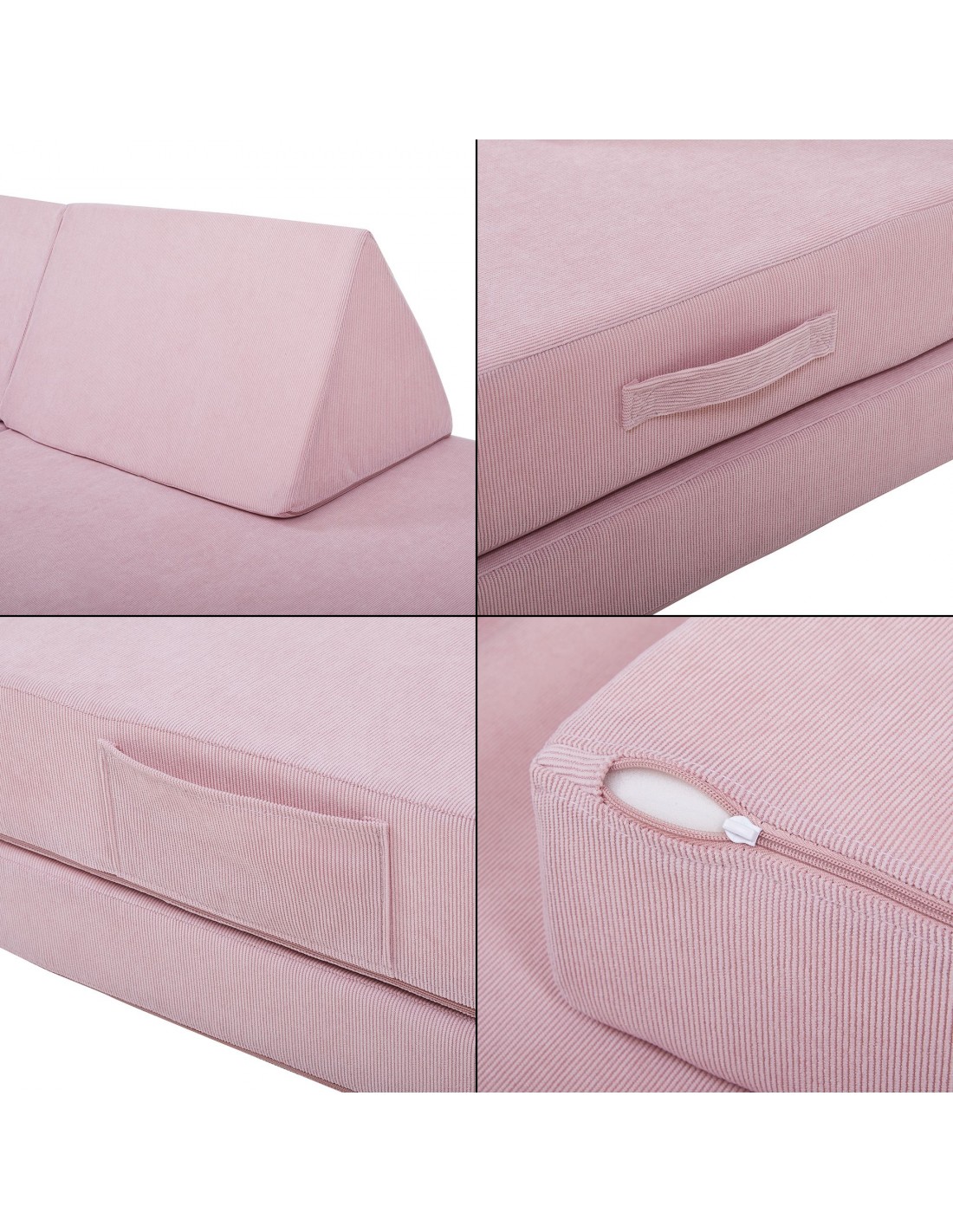 Tumle børnesofa udført i et design af rosa corduroy polyester med skumfyld. Opsæt sofaen efter ønske, og lad børnene lege med de forskellige moduler. Opsættes sofaen som en sofa, så måler den 150 x 66 cm i bredde og dybde.