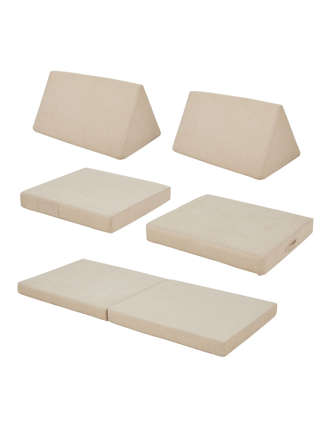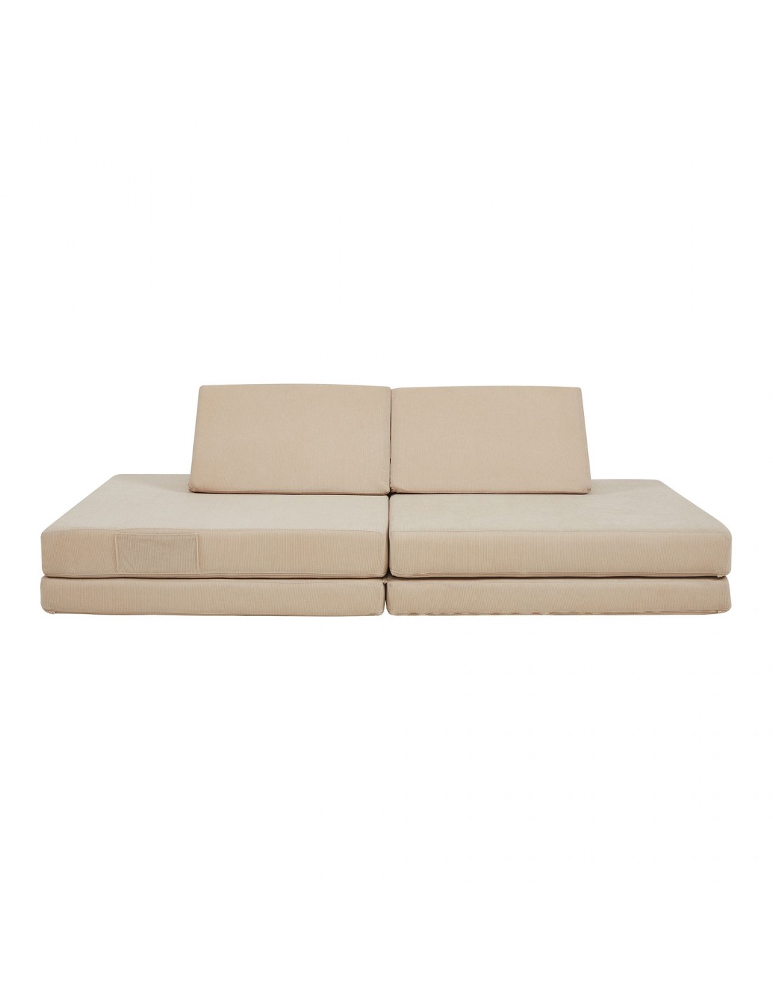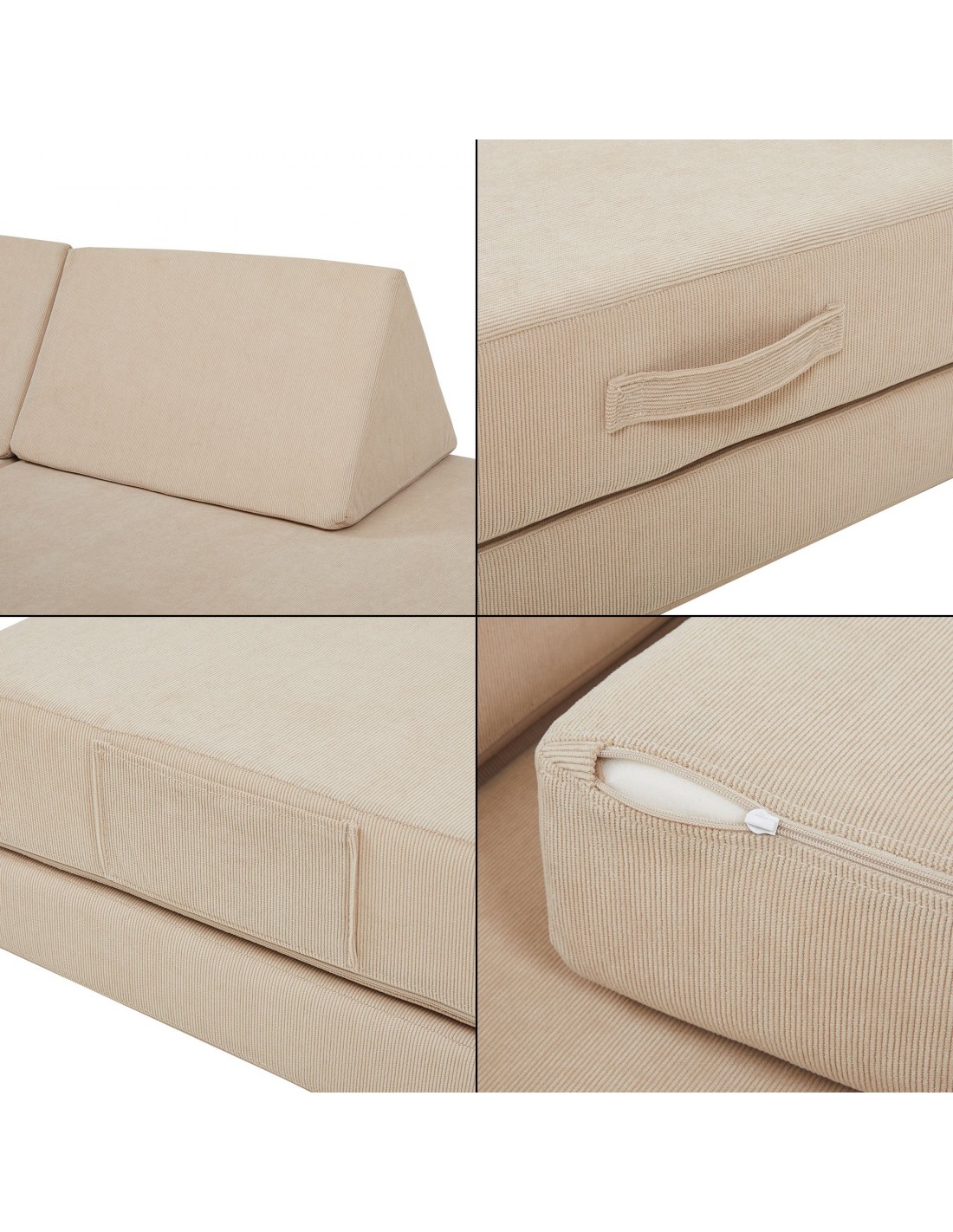 Tumle børnesofa udført i et design af beige corduroy polyester med skumfyld. Opsæt sofaen efter ønske, og lad børnene lege med de forskellige moduler. Opsættes sofaen som en sofa, så måler den 150 x 66 cm i bredde og dybde.