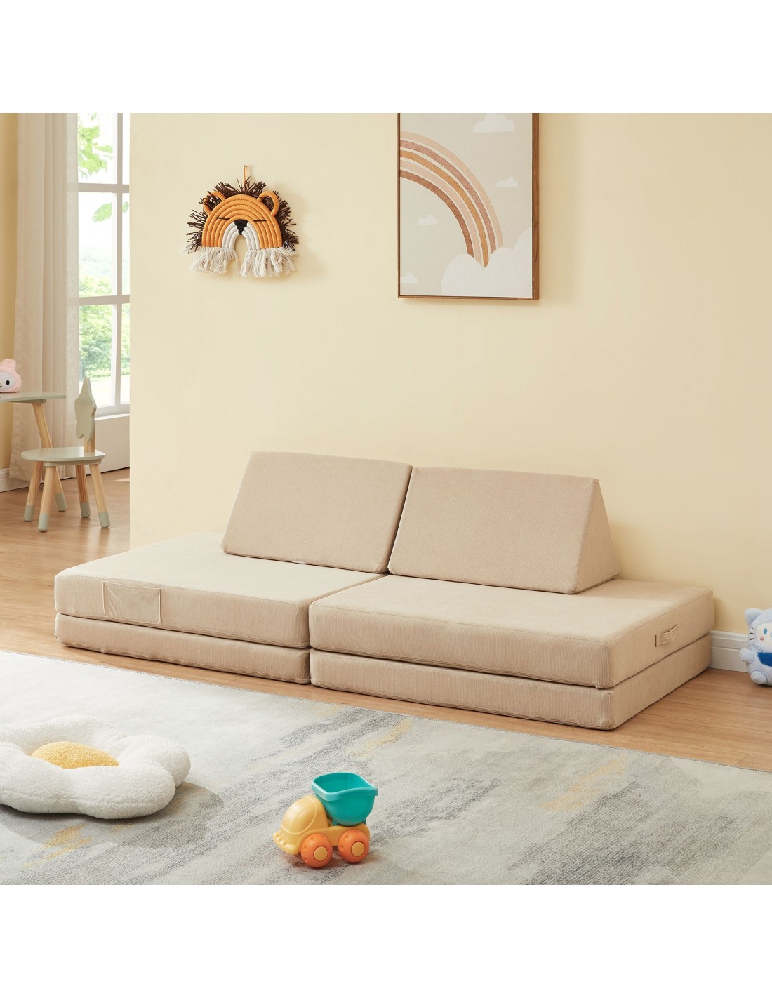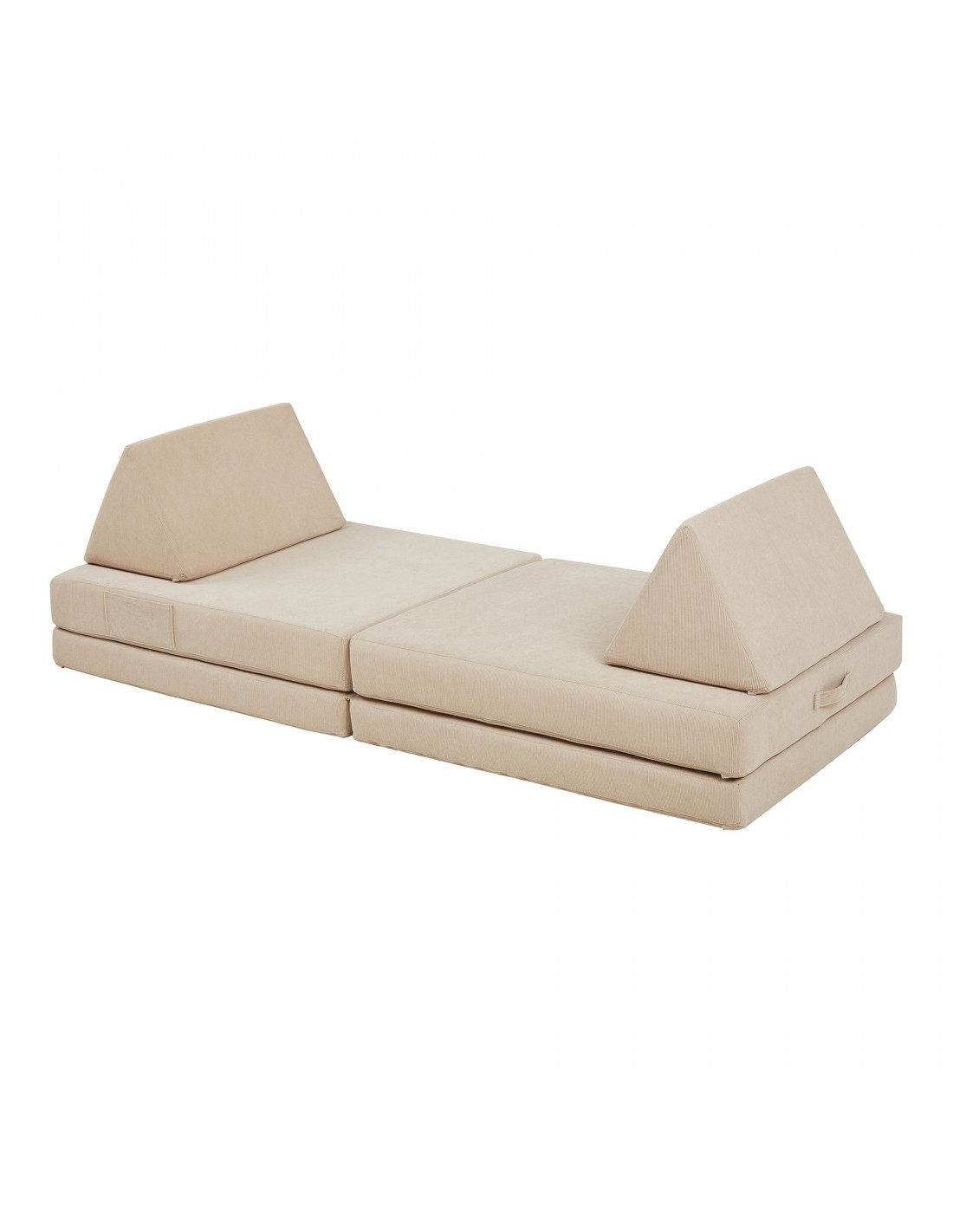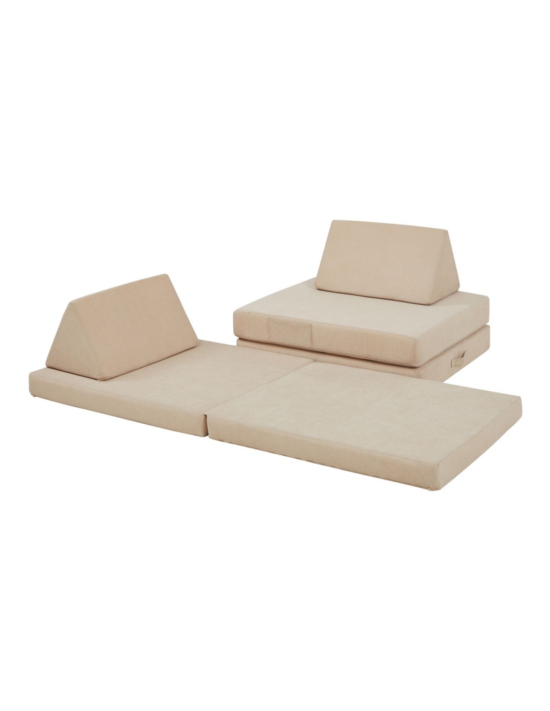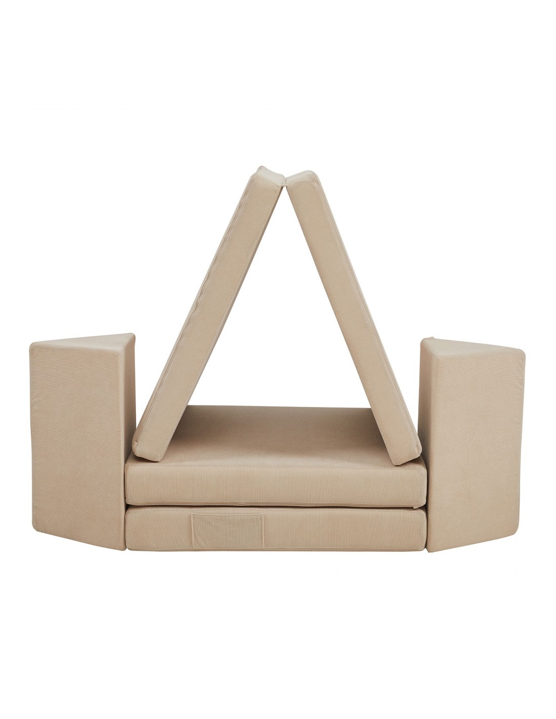 Tumle børnesofa udført i et design af beige corduroy polyester med skumfyld. Opsæt sofaen efter ønske, og lad børnene lege med de forskellige moduler. Opsættes sofaen som en sofa, så måler den 150 x 66 cm i bredde og dybde.