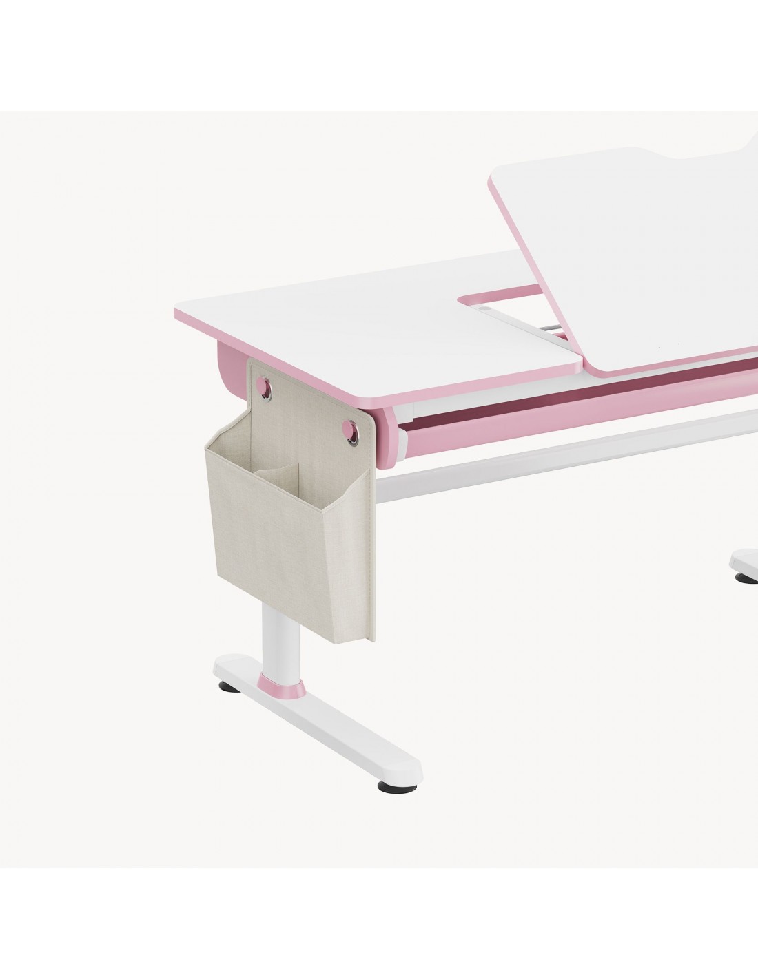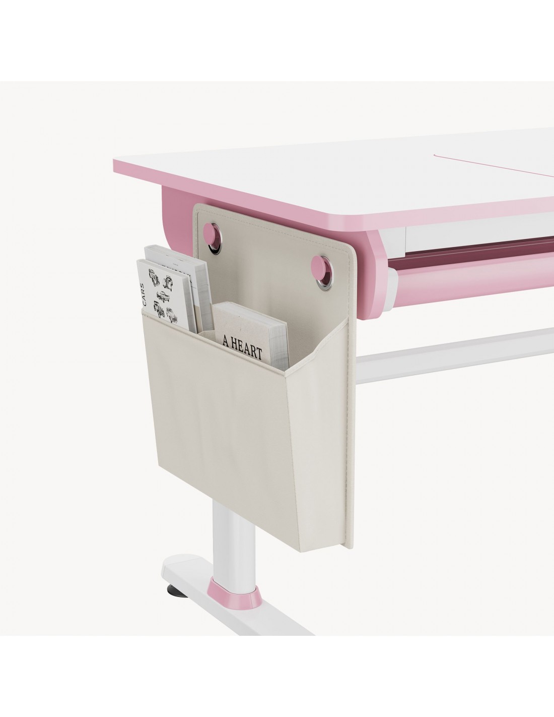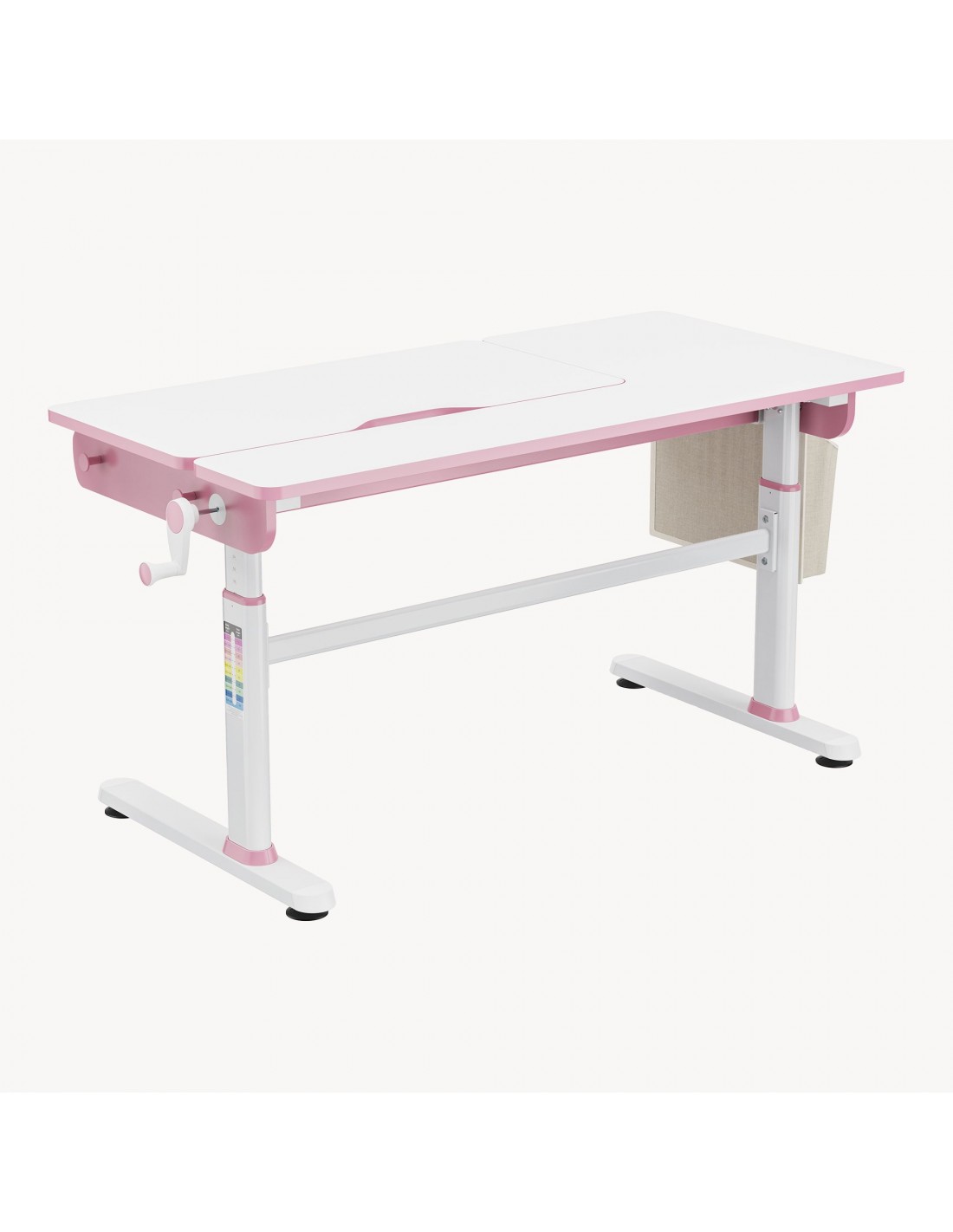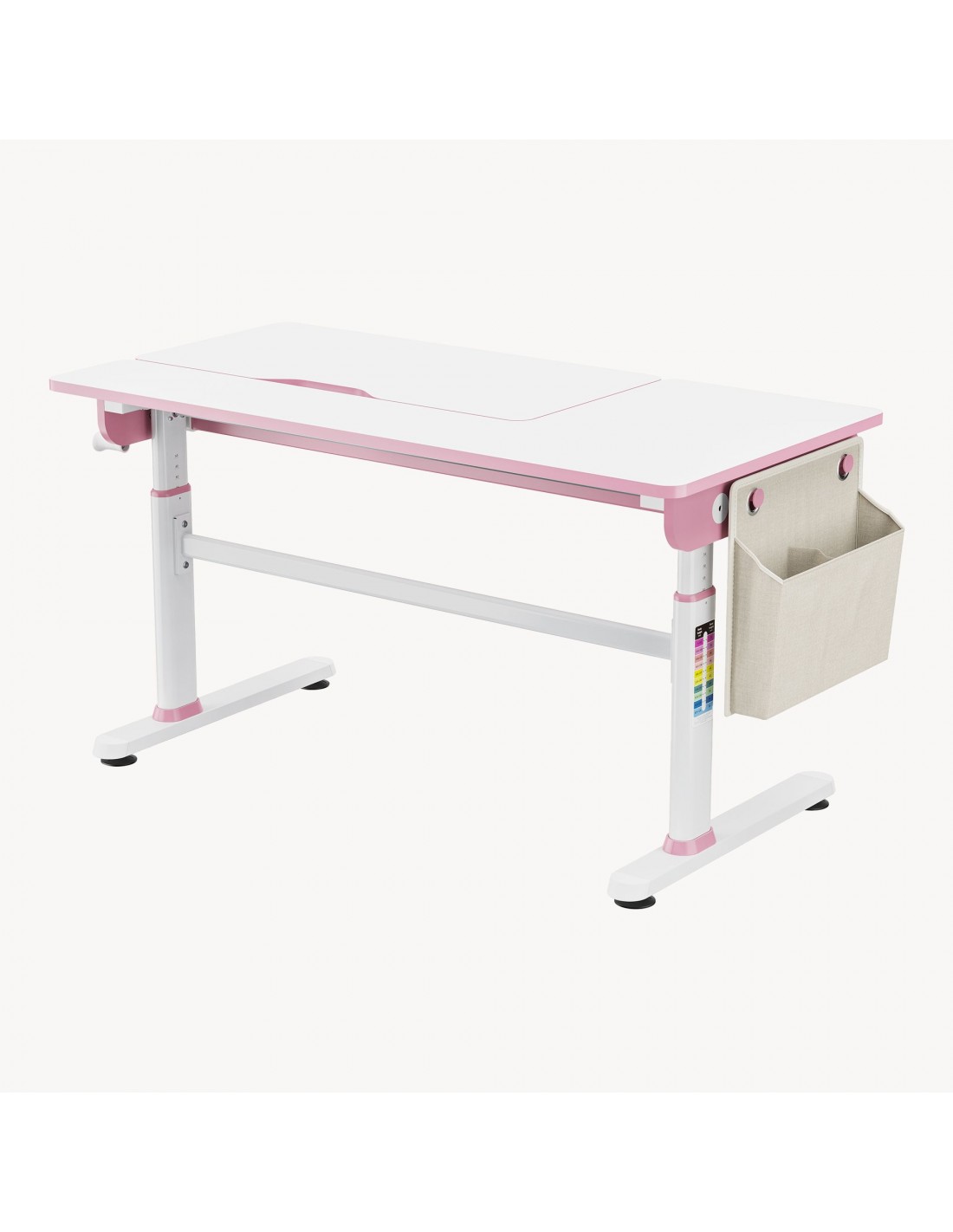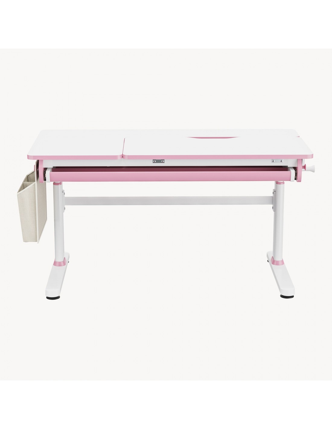 Hæve-/Sænke skrivebord til børn, udført i et design af hvid og pink lakeret stål og møbelplade. Skrivebordet måler 54 - 76 cm i højden og 120 x 60 cm i bredde og dybde. Til skrivebordet medfølger opbevaringstaske i tekstil. Skrivebordet justeres i højden via håndsving. I skrivebordet forefindes opbevaringsskuffe til opbevaring af skriveredskaber med mere. Hertil arbejdsplade 80 x 40 cm der kan vippes i en vinkel op til 50 grader.