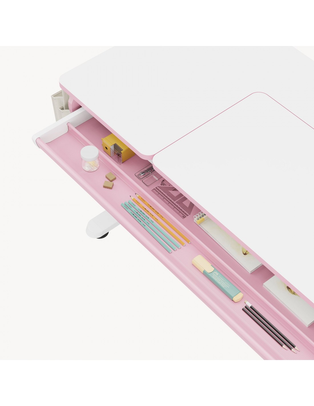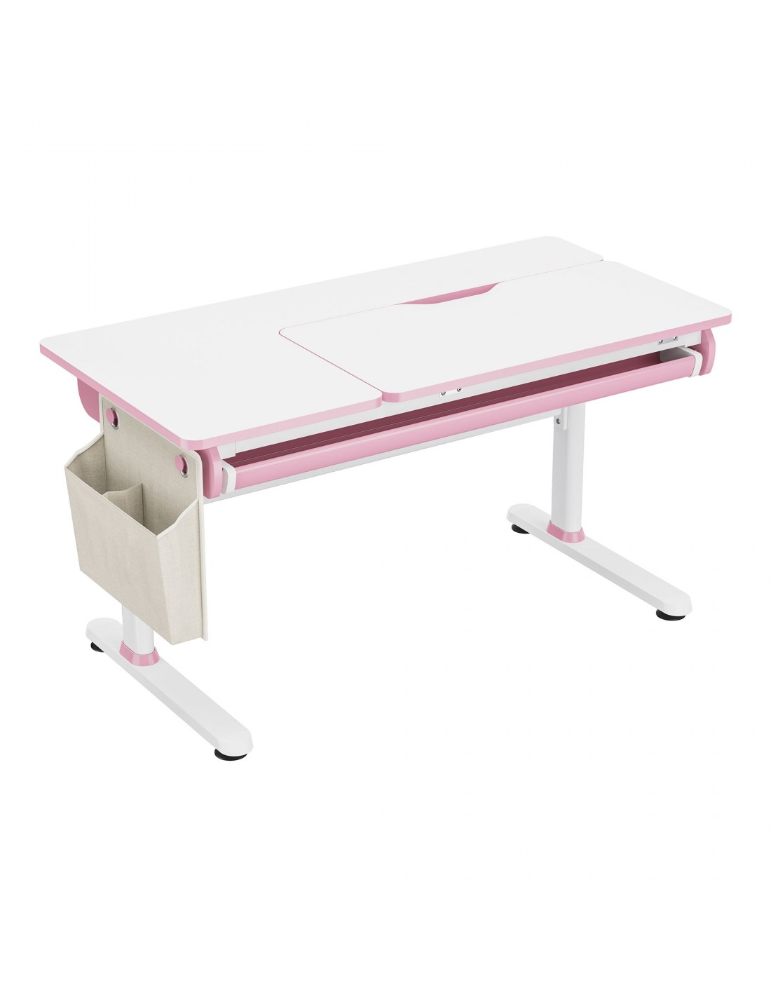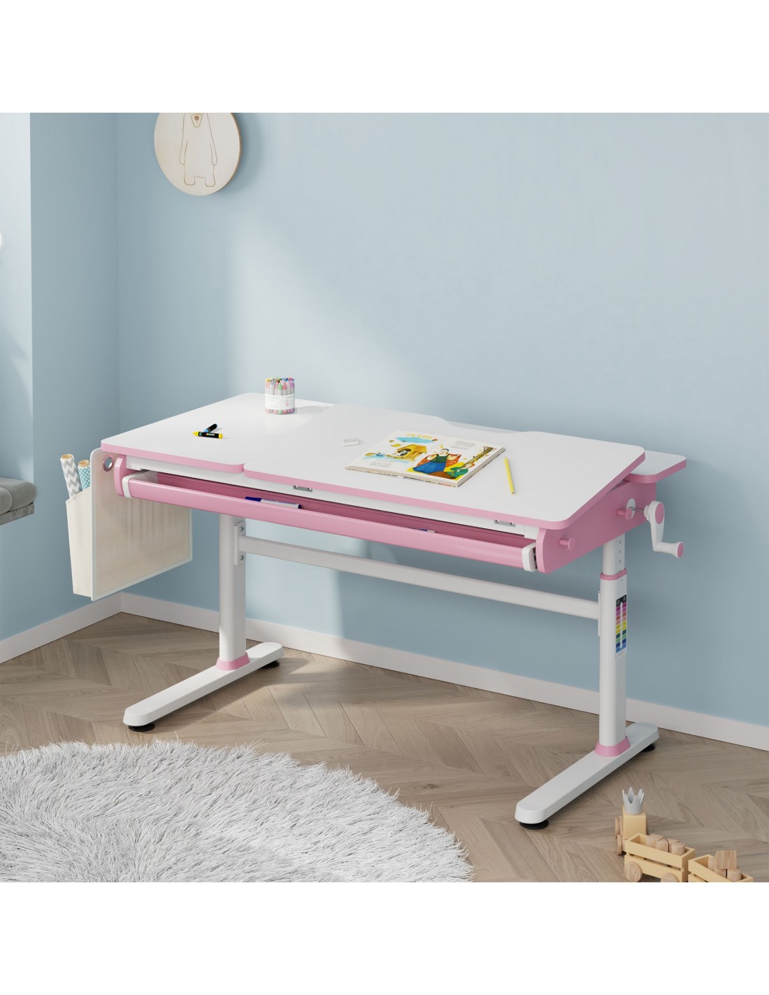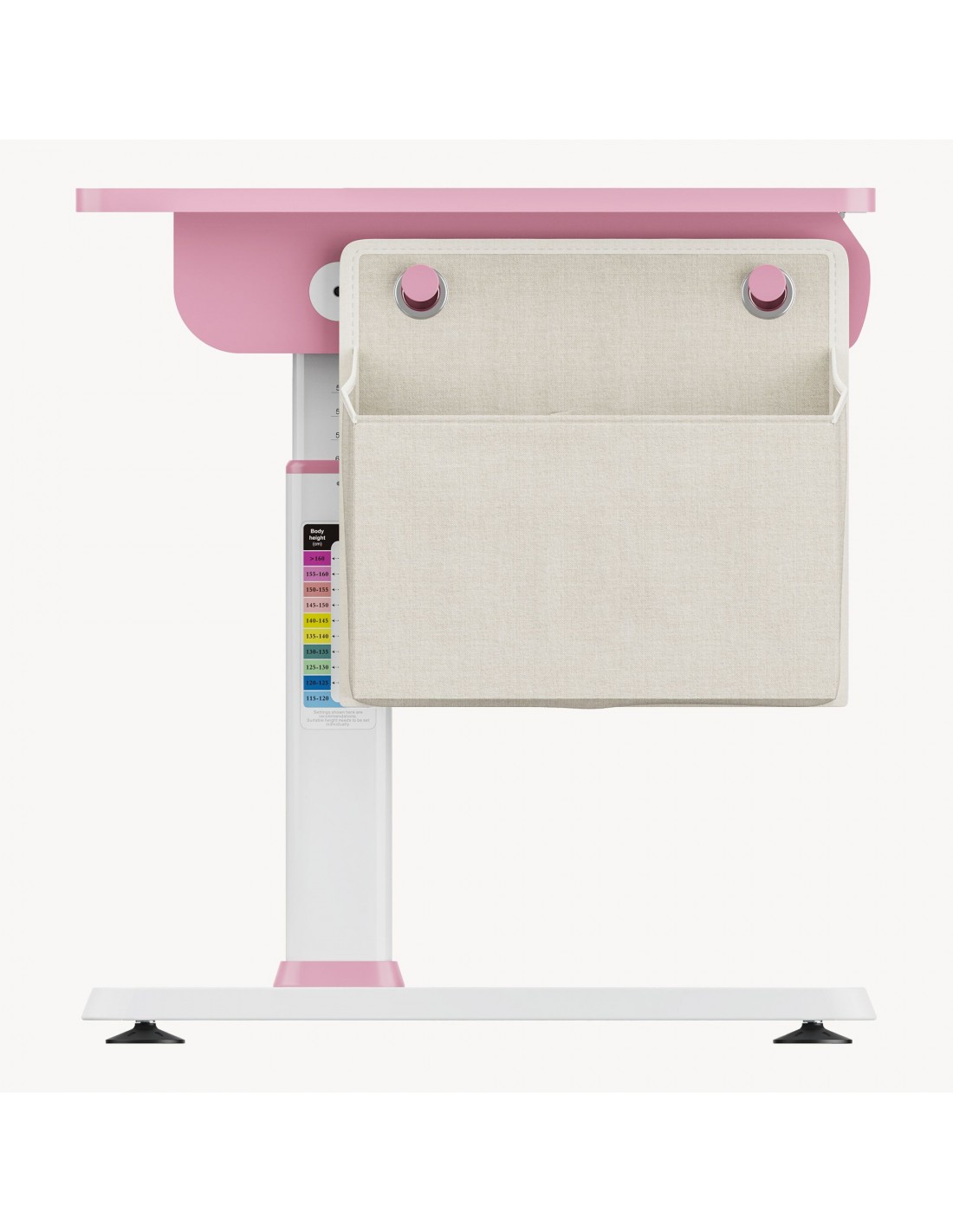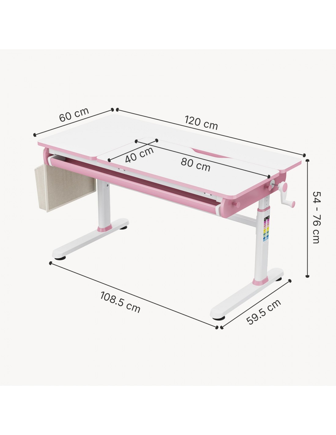 Hæve-/Sænke skrivebord til børn, udført i et design af hvid og pink lakeret stål og møbelplade. Skrivebordet måler 54 - 76 cm i højden og 120 x 60 cm i bredde og dybde. Til skrivebordet medfølger opbevaringstaske i tekstil. Skrivebordet justeres i højden via håndsving. I skrivebordet forefindes opbevaringsskuffe til opbevaring af skriveredskaber med mere. Hertil arbejdsplade 80 x 40 cm der kan vippes i en vinkel op til 50 grader.
