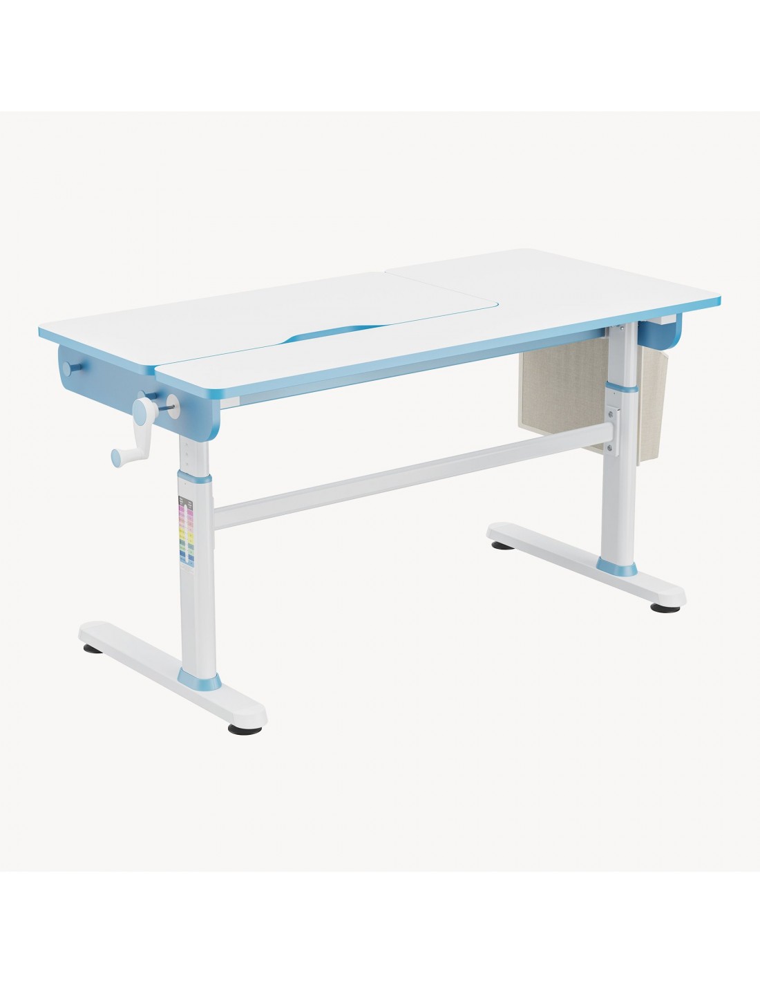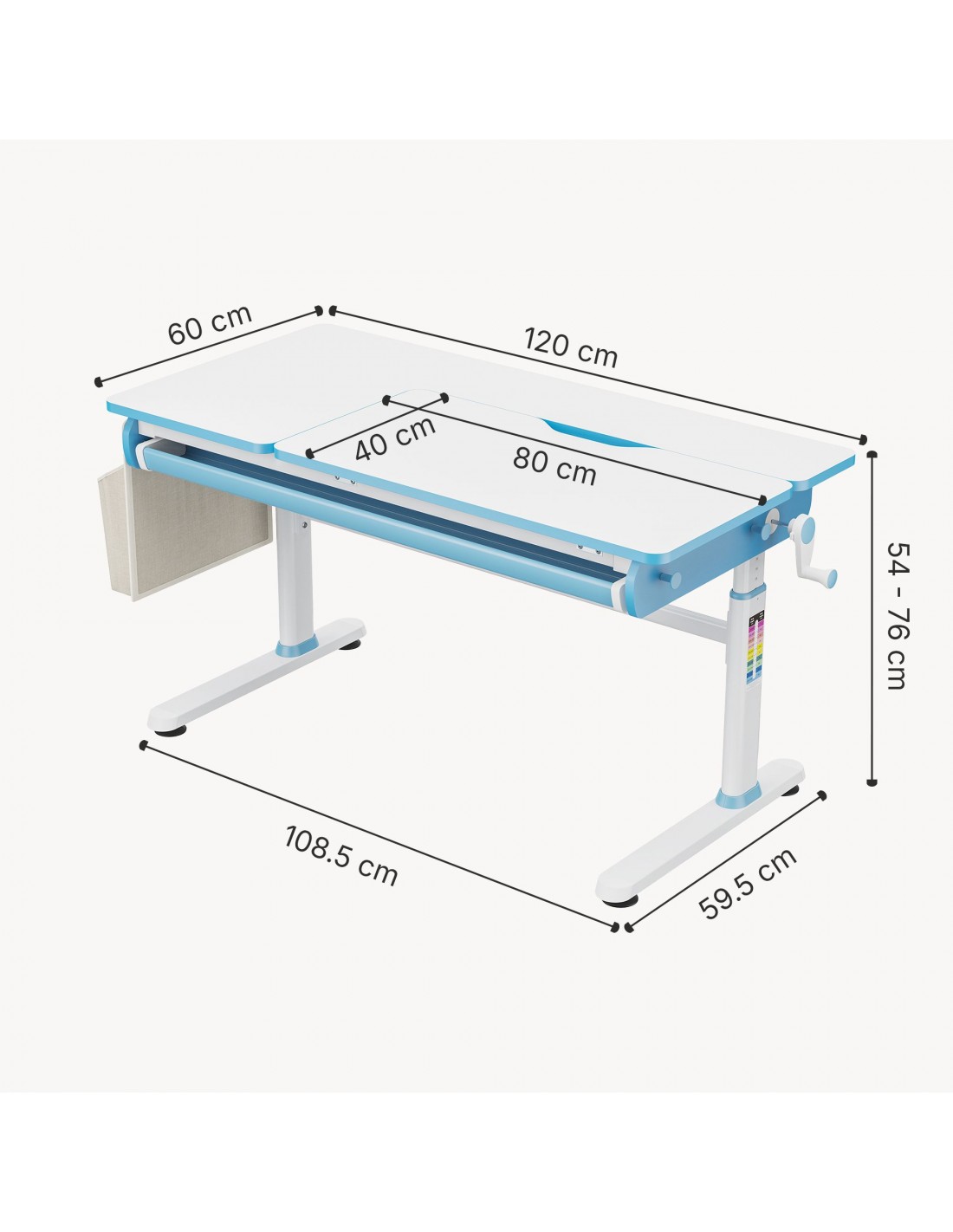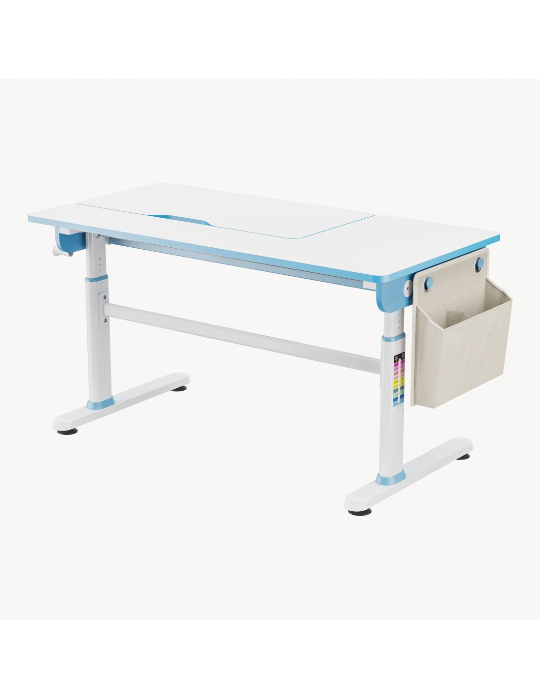 Hæve-/Sænke skrivebord til børn, udført i et design af hvid og blå lakeret stål og møbelplade. Skrivebordet måler 54 - 76 cm i højden og 120 x 60 cm i bredde og dybde. Til skrivebordet medfølger opbevaringstaske i tekstil. Skrivebordet justeres i højden via håndsving. I skrivebordet forefindes opbevaringsskuffe til opbevaring af skriveredskaber med mere. Hertil arbejdsplade 80 x 40 cm der kan vippes i en vinkel op til 50 grader.
