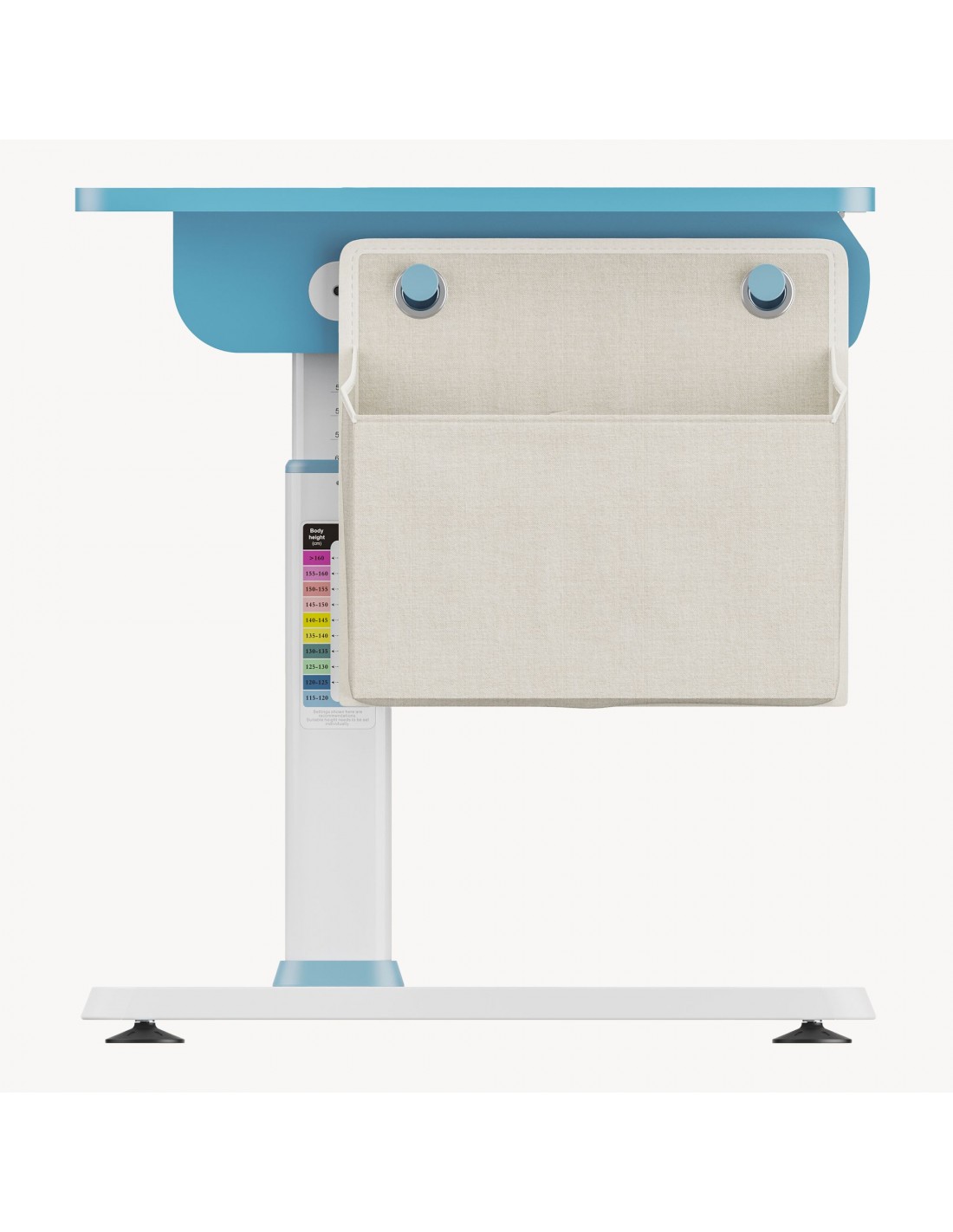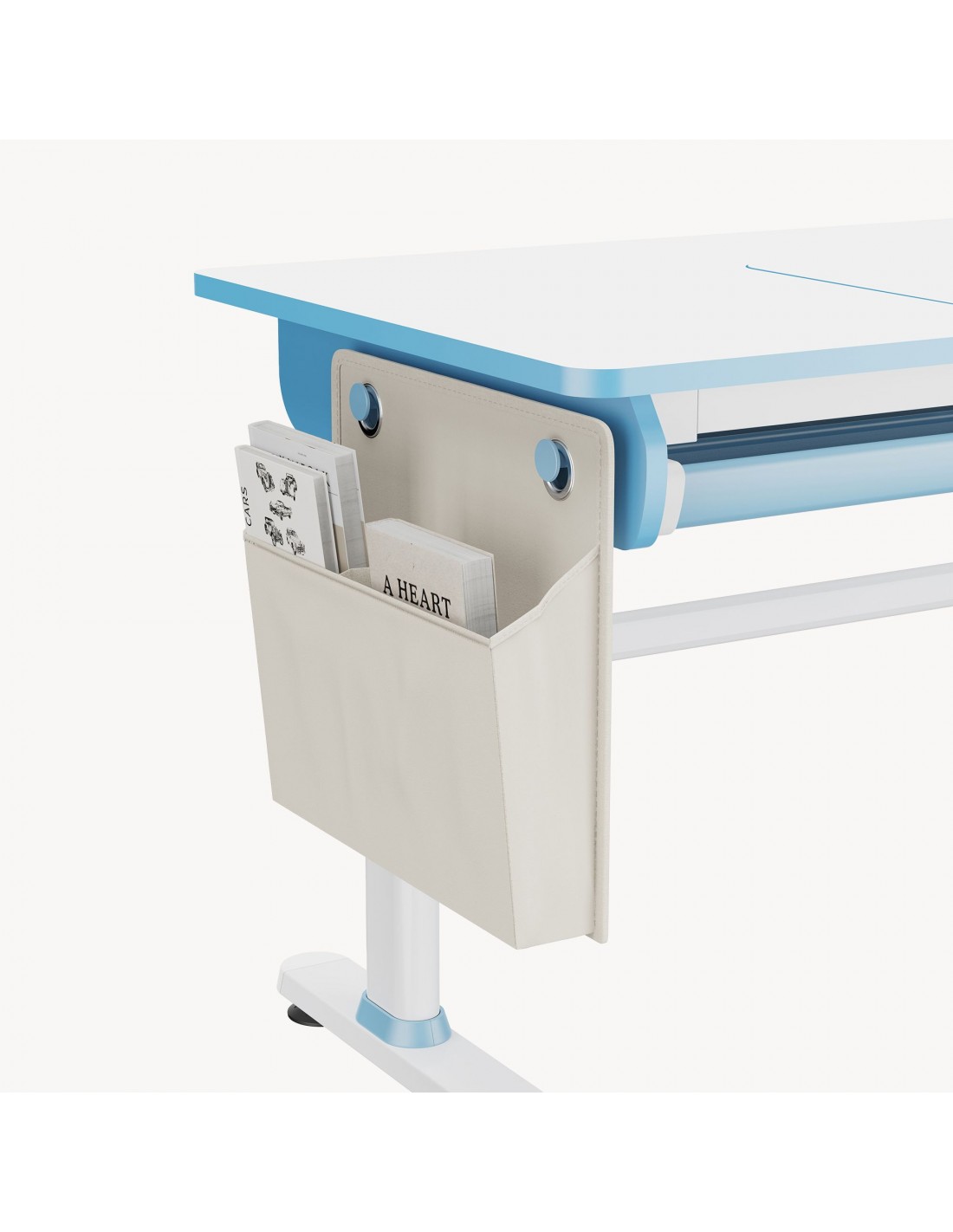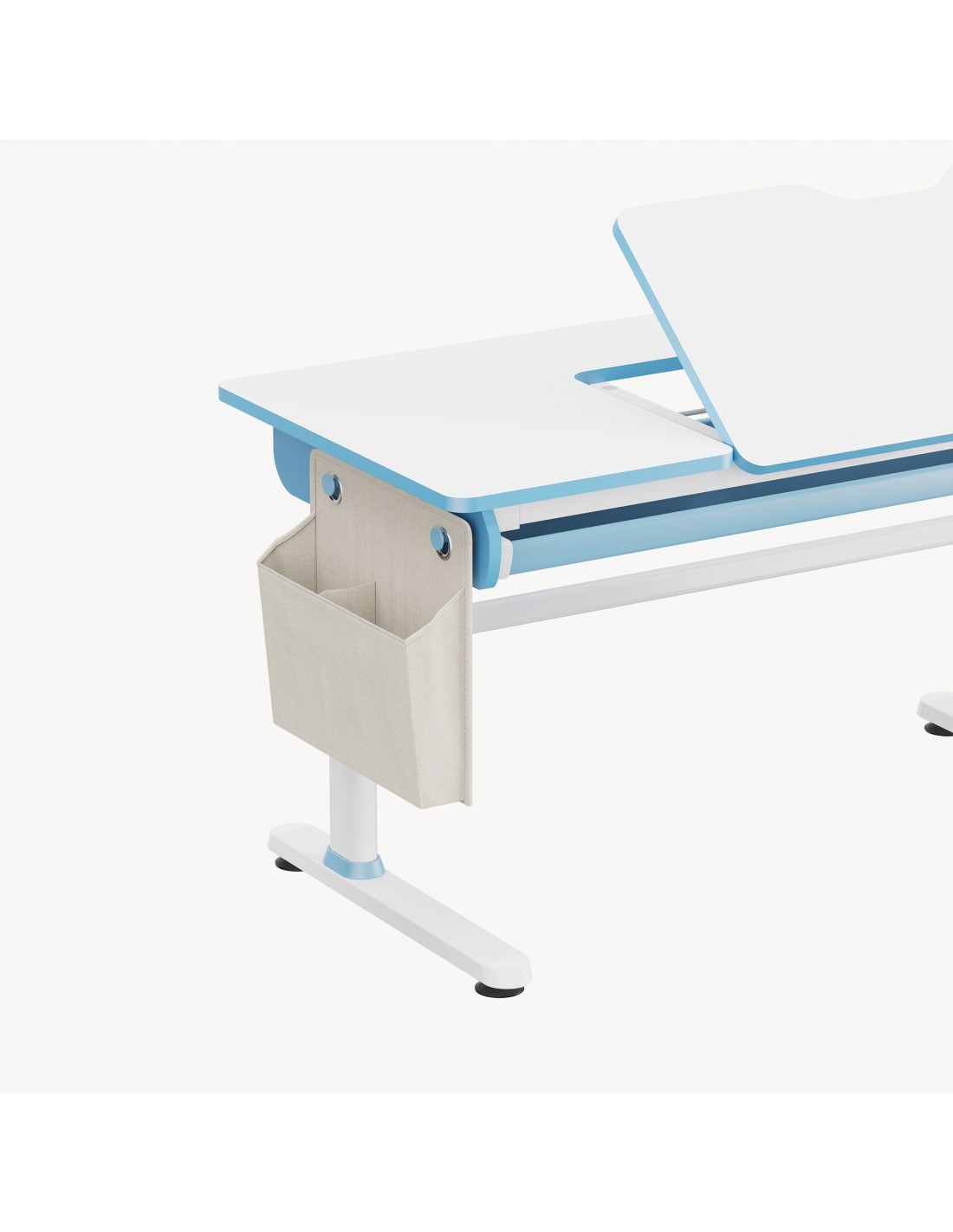 Hæve-/Sænke skrivebord til børn, udført i et design af hvid og blå lakeret stål og møbelplade. Skrivebordet måler 54 - 76 cm i højden og 120 x 60 cm i bredde og dybde. Til skrivebordet medfølger opbevaringstaske i tekstil. Skrivebordet justeres i højden via håndsving. I skrivebordet forefindes opbevaringsskuffe til opbevaring af skriveredskaber med mere. Hertil arbejdsplade 80 x 40 cm der kan vippes i en vinkel op til 50 grader.