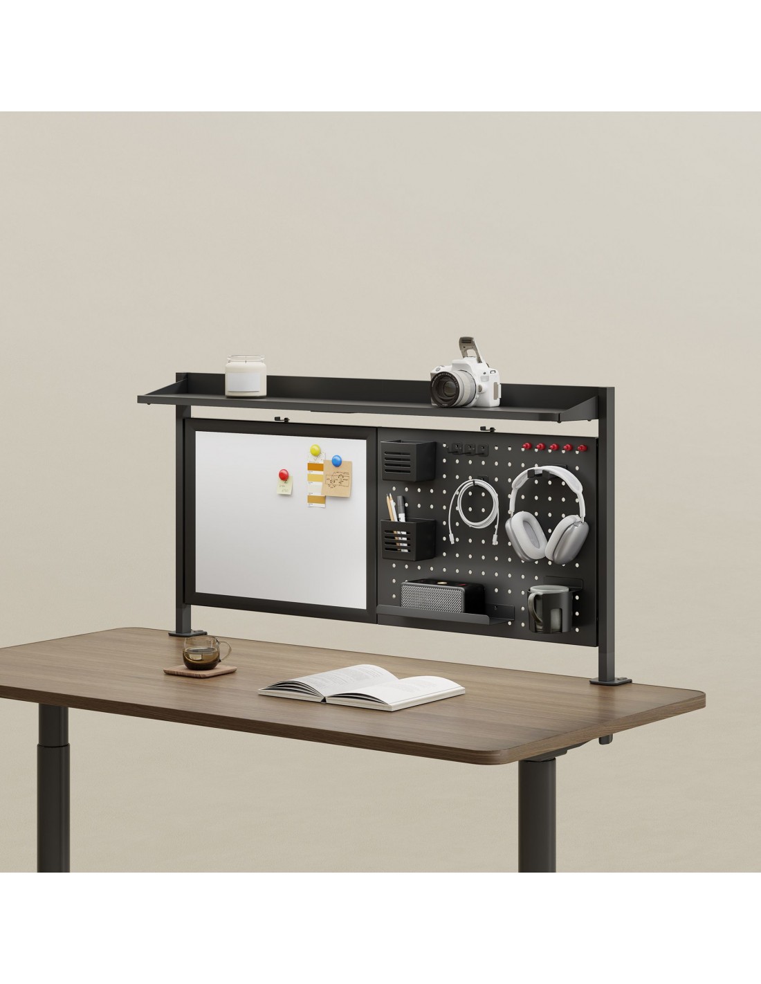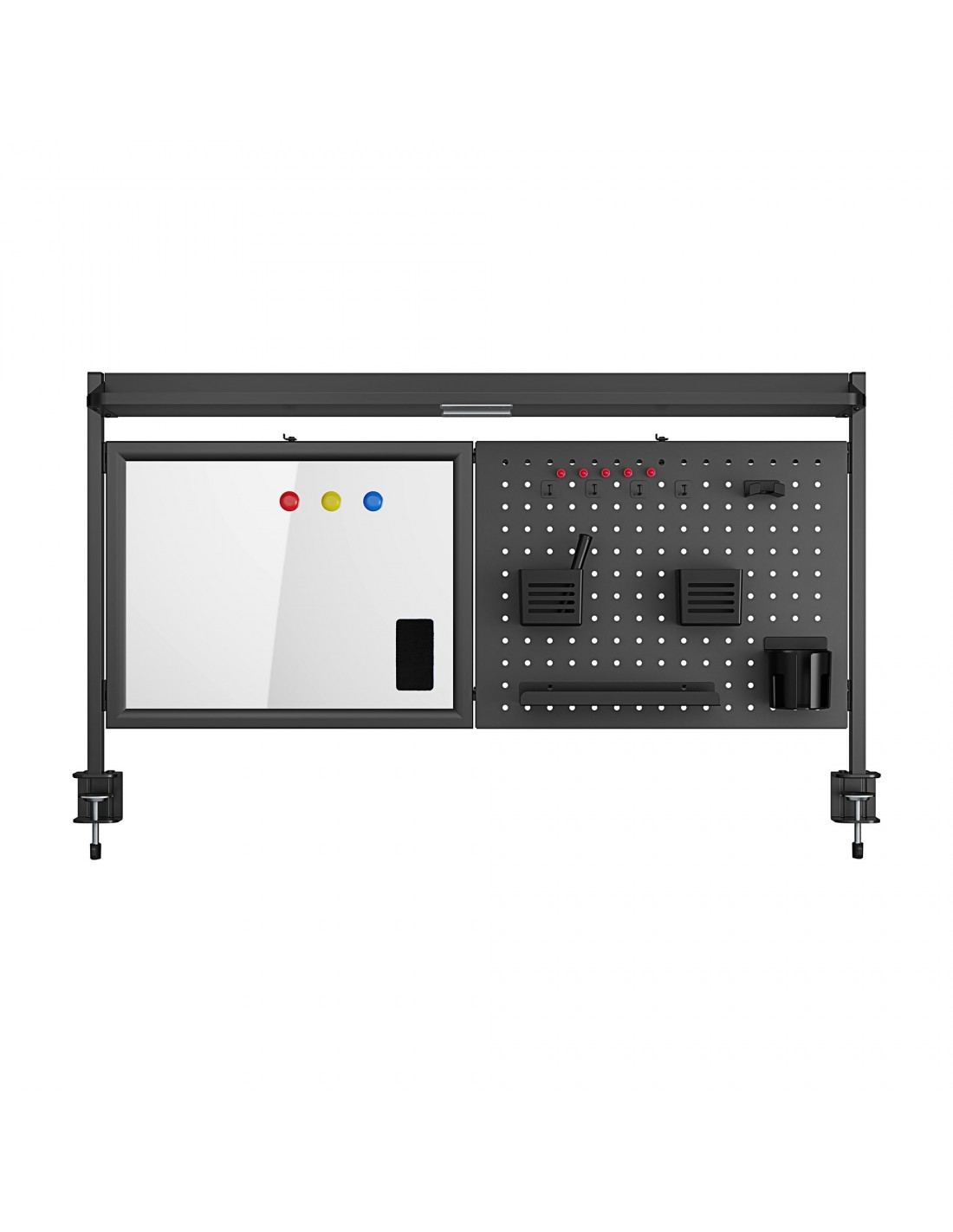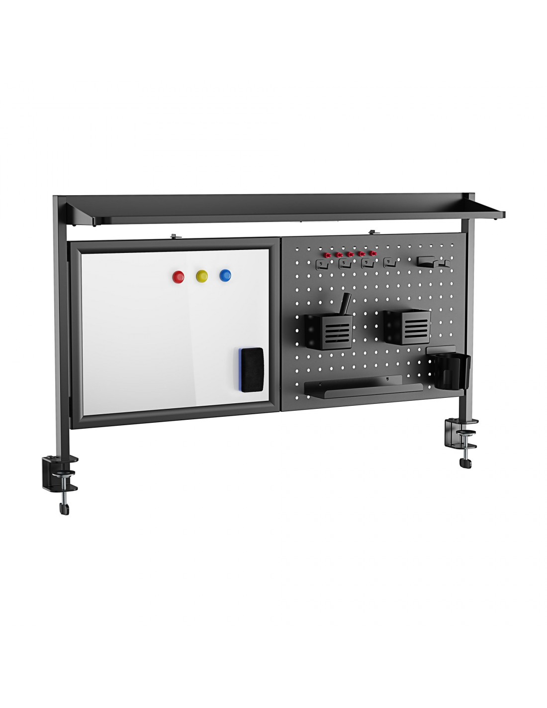 Organiser til skrivebord, udført i et design af sortlakeret stål. Organiseren måler 67,5 - 72,5 cm i højden og 116,5 x 20 cm i bredde og dybde. Til organiseren medfølger tilbehør som vist på produktbillederne.